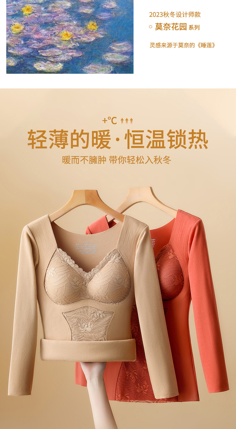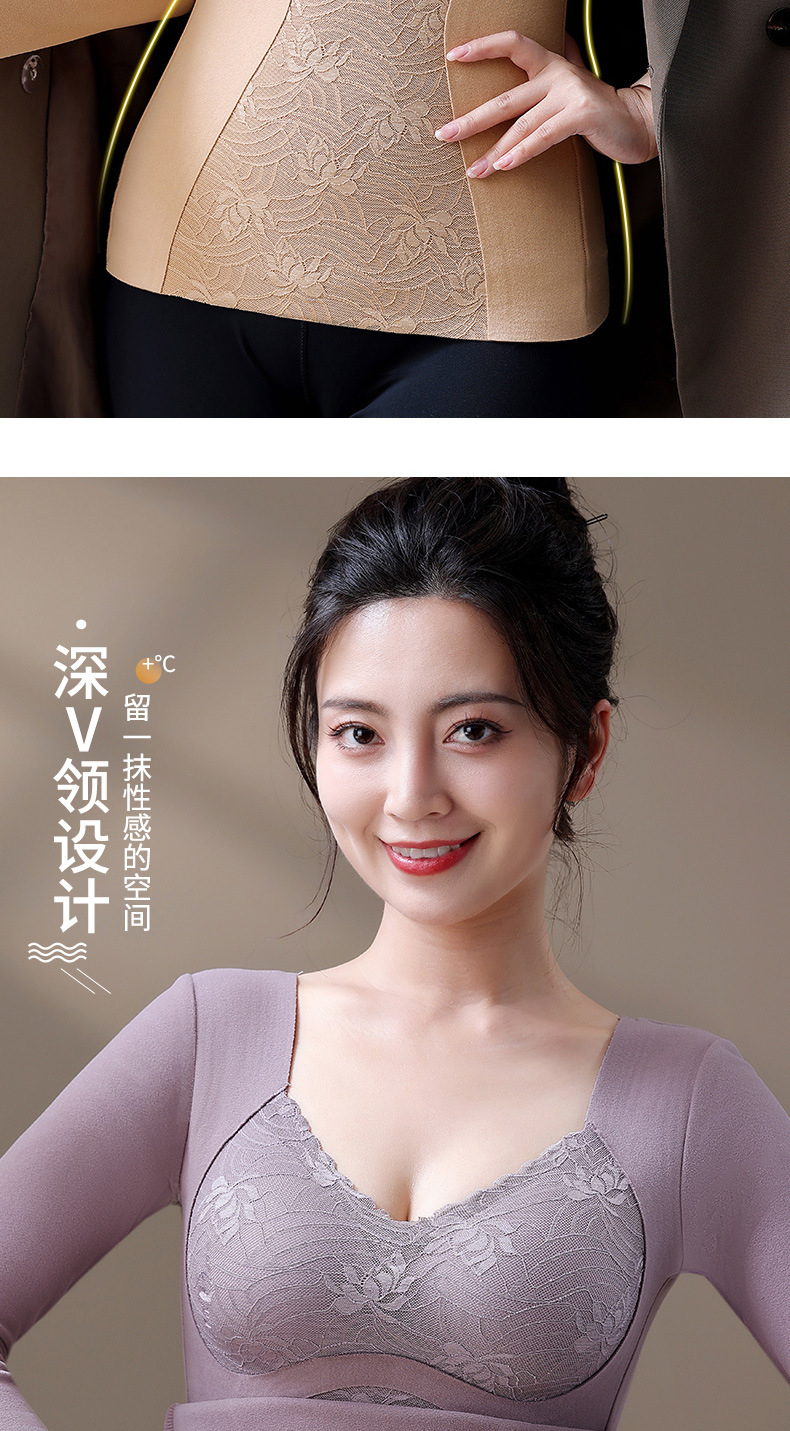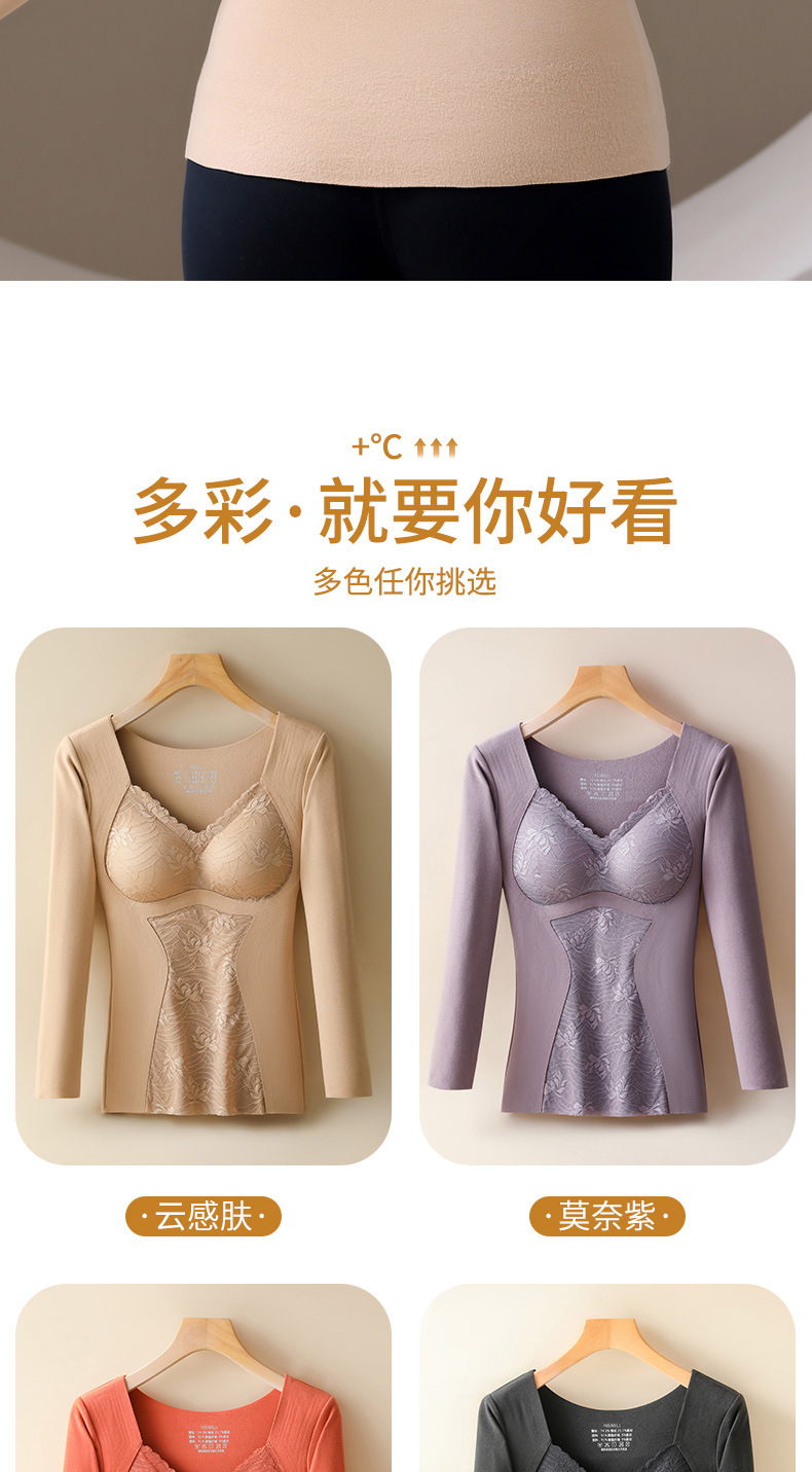 秋冬固定杯带胸垫长袖女士保暖内衣蓄热打底塑身上衣蕾丝保暖背心