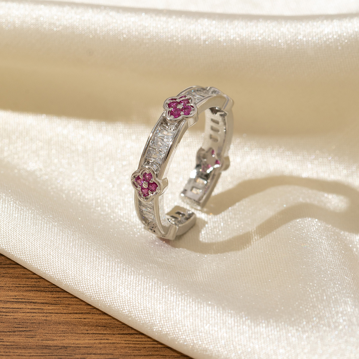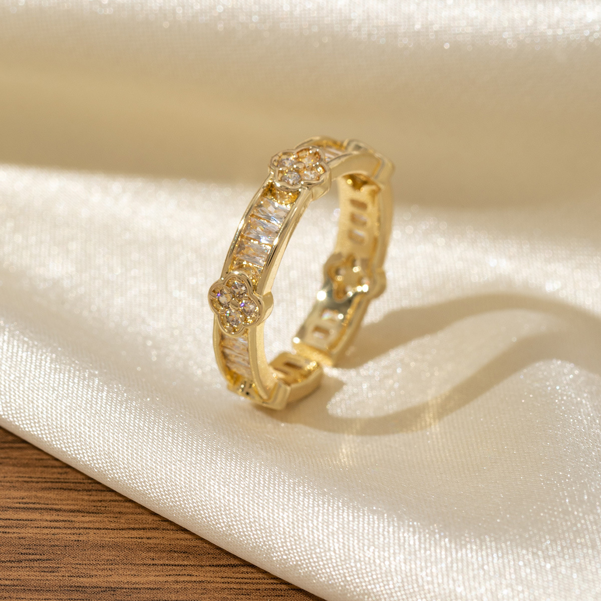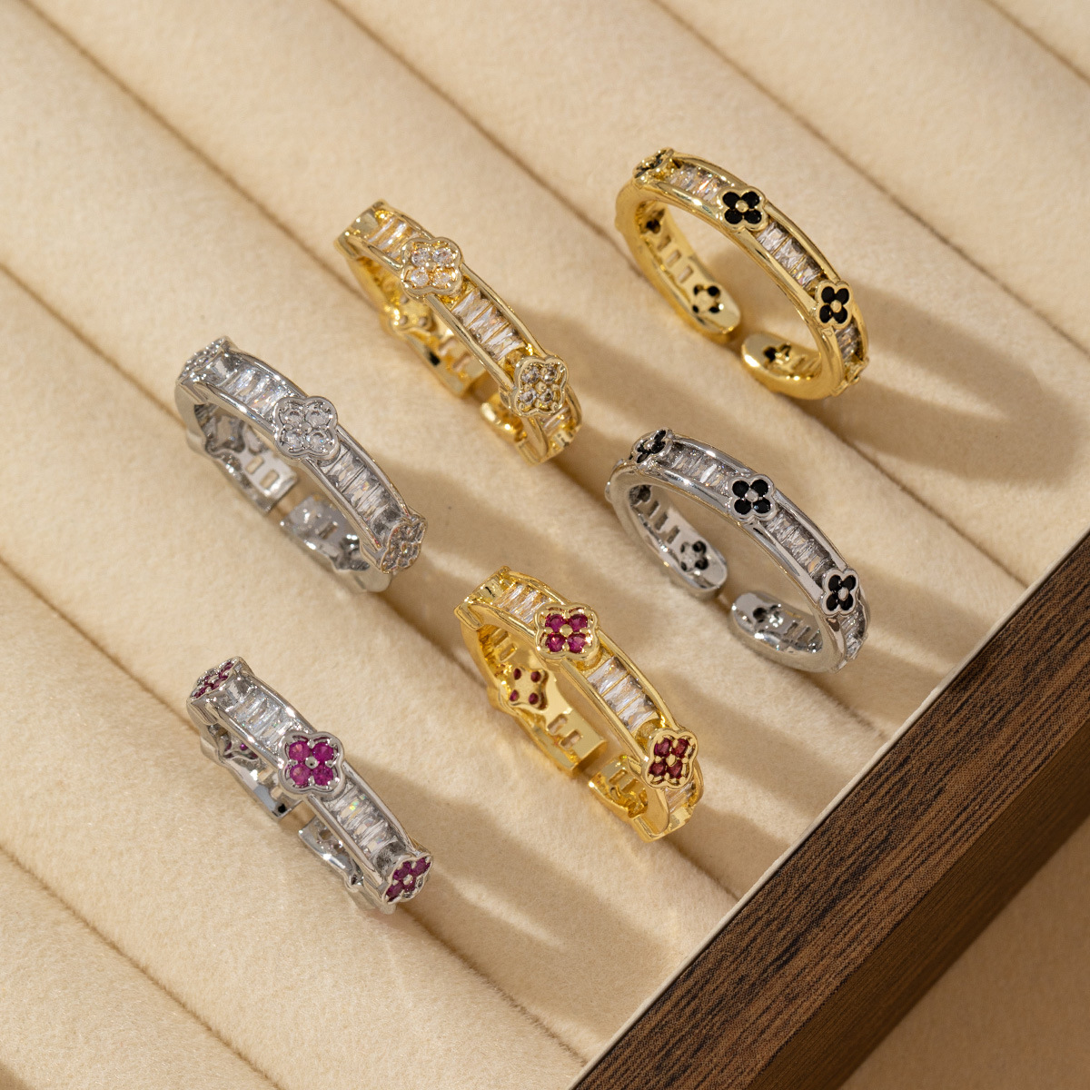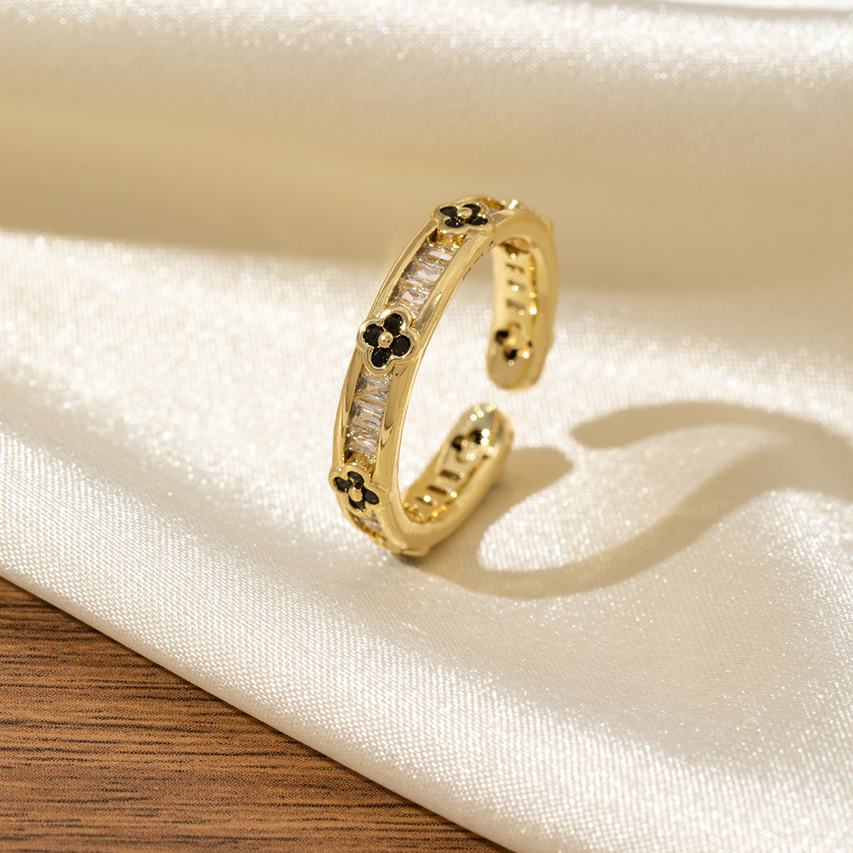 微镶锆石环形四叶草戒指黄铜镀真金保色小众时尚摩登开口指环女