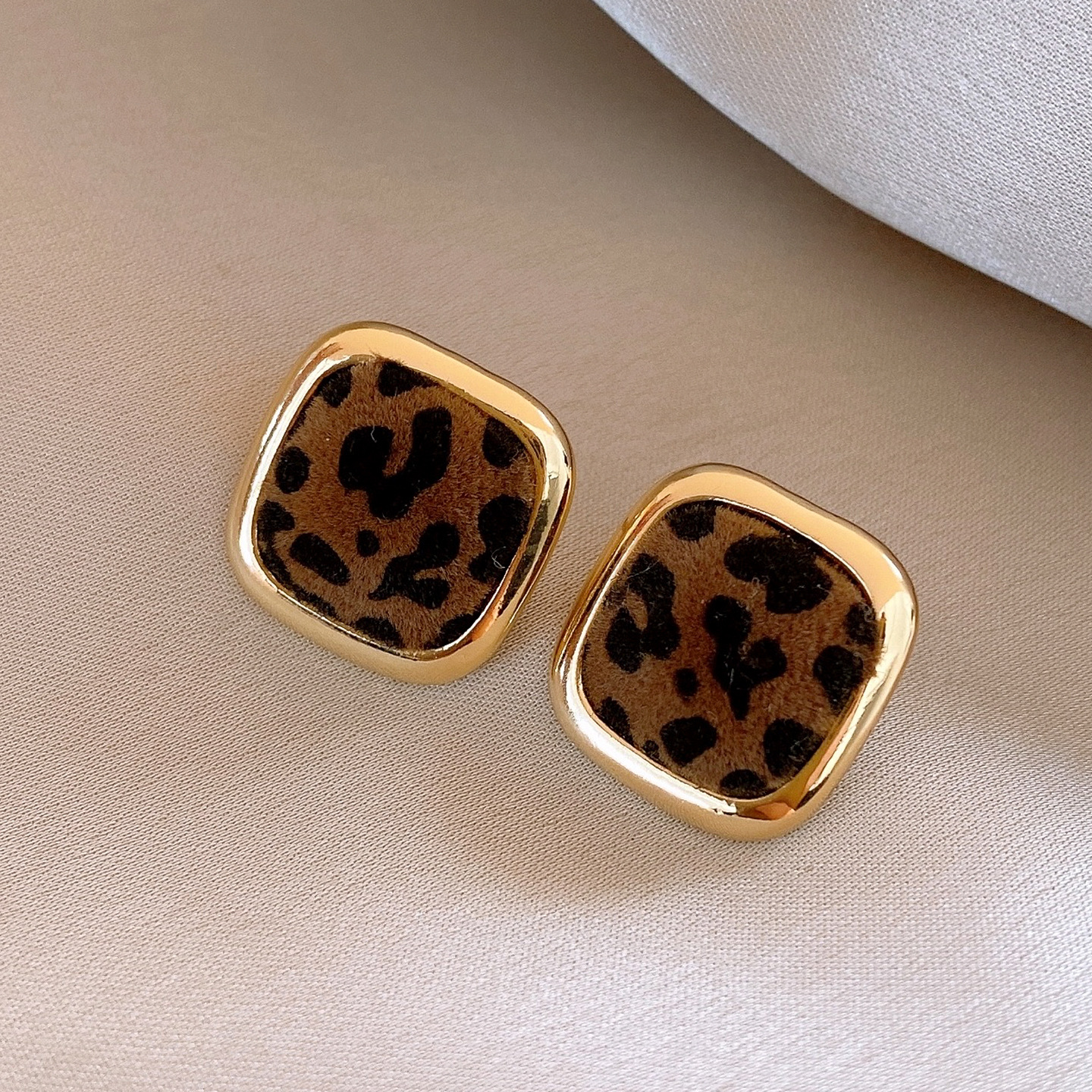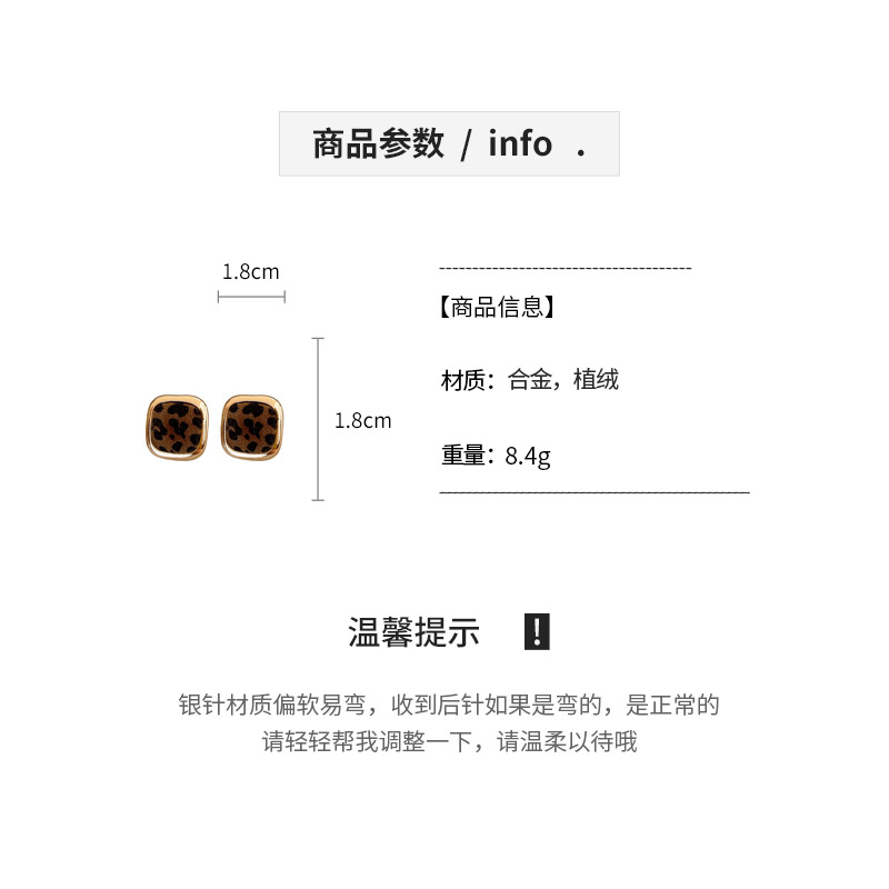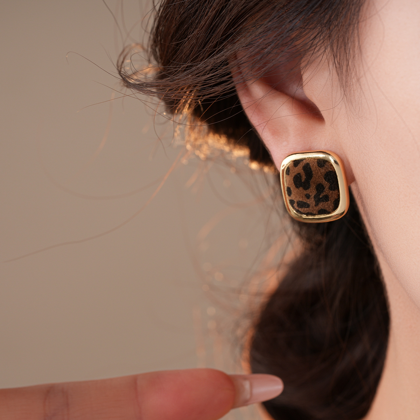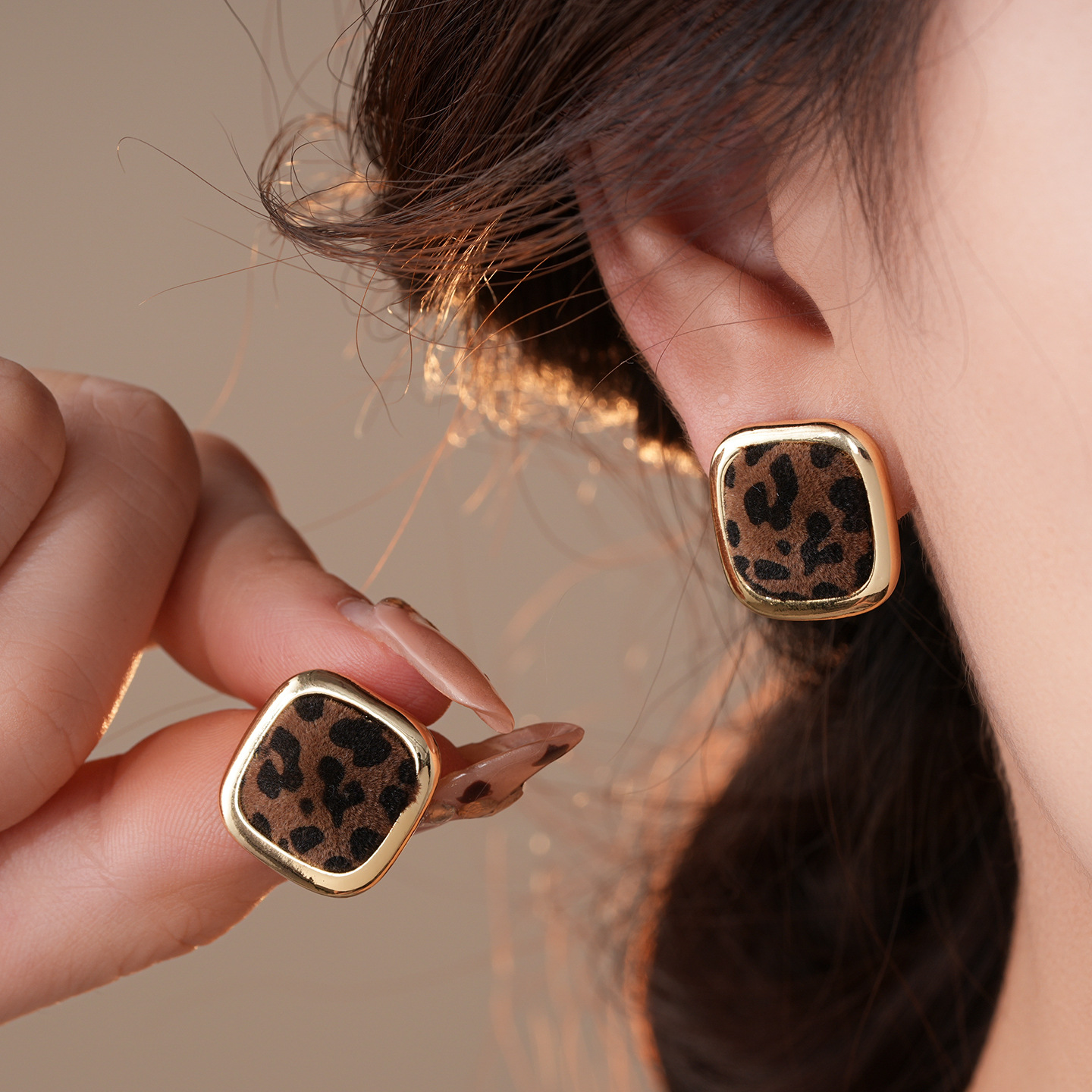 秋冬复古银针植绒豹纹方形耳钉气质小众百搭耳环轻奢高级感耳饰女