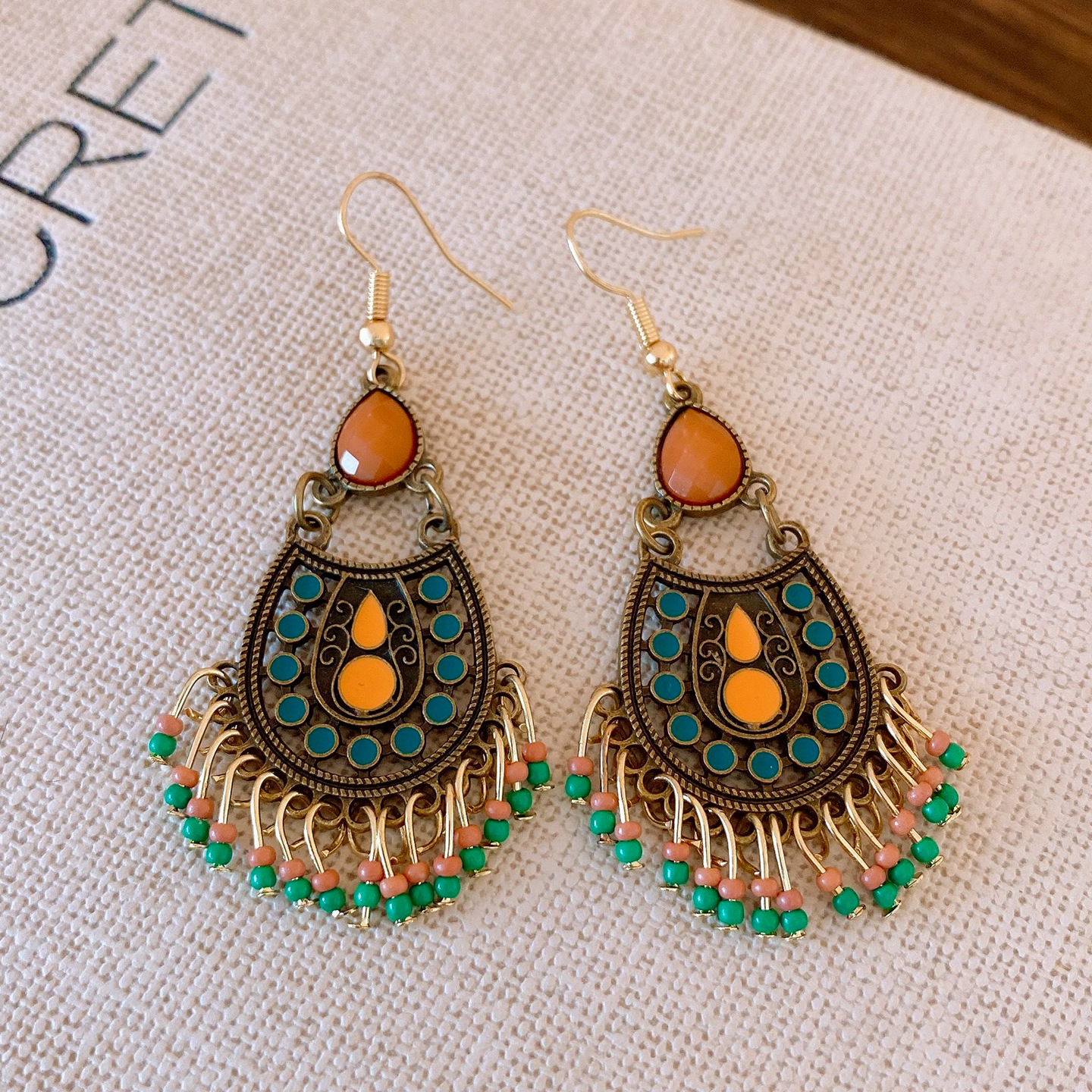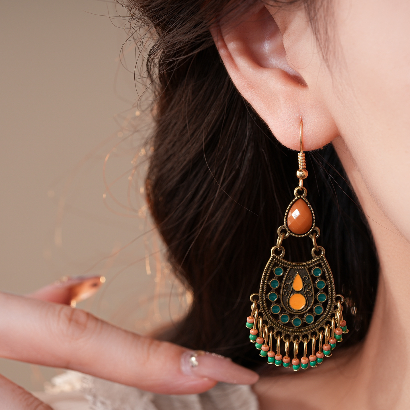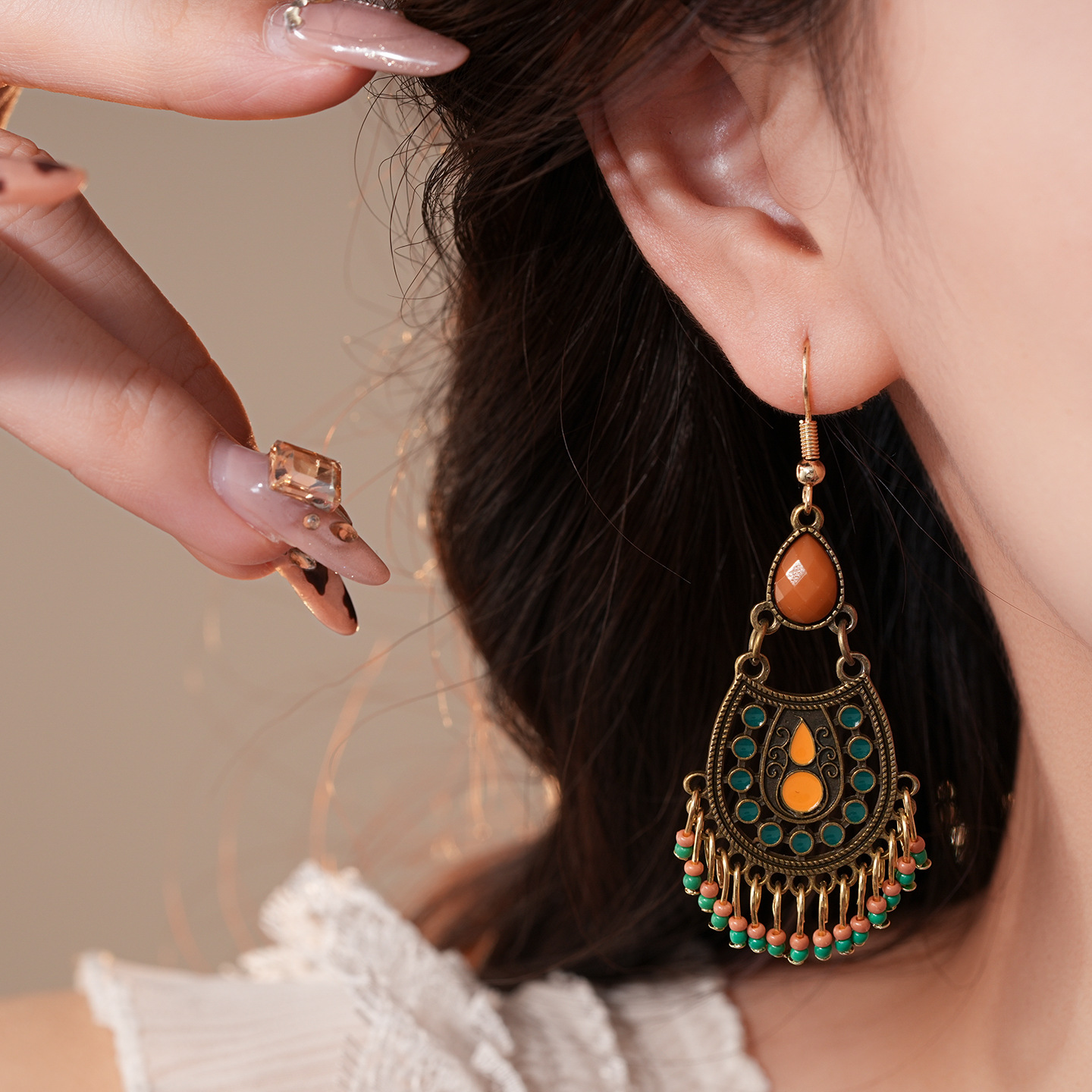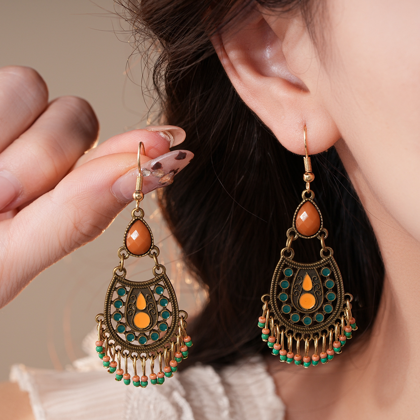 民族风滴油镶钻水滴流苏耳环轻奢高级感耳坠欧美小众夸张耳饰批发