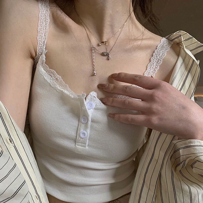 纯欲辣妹螺纹棉蕾丝吊带美背背心一体带胸垫裹胸外穿打底短款上衣