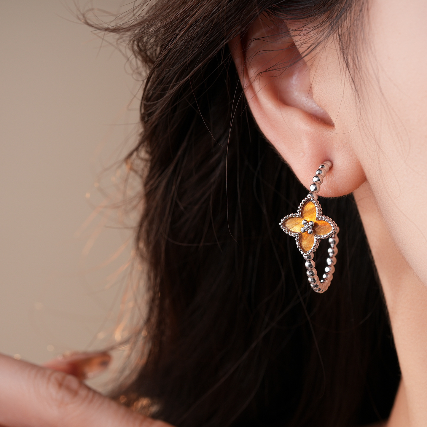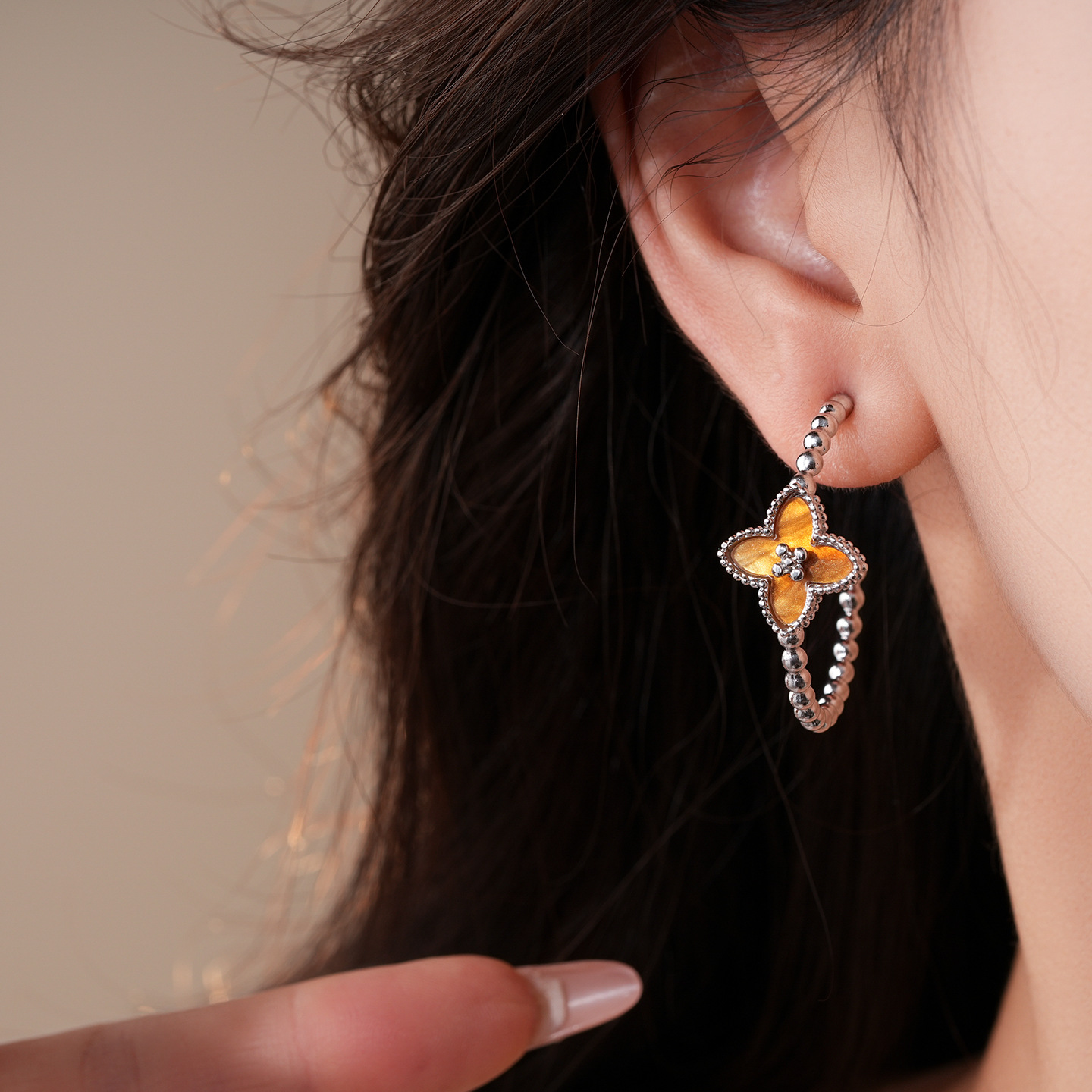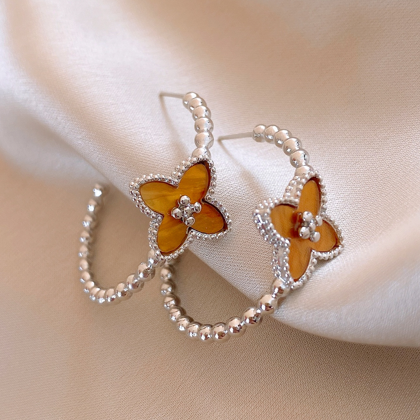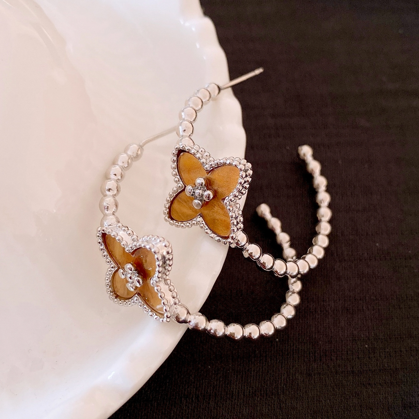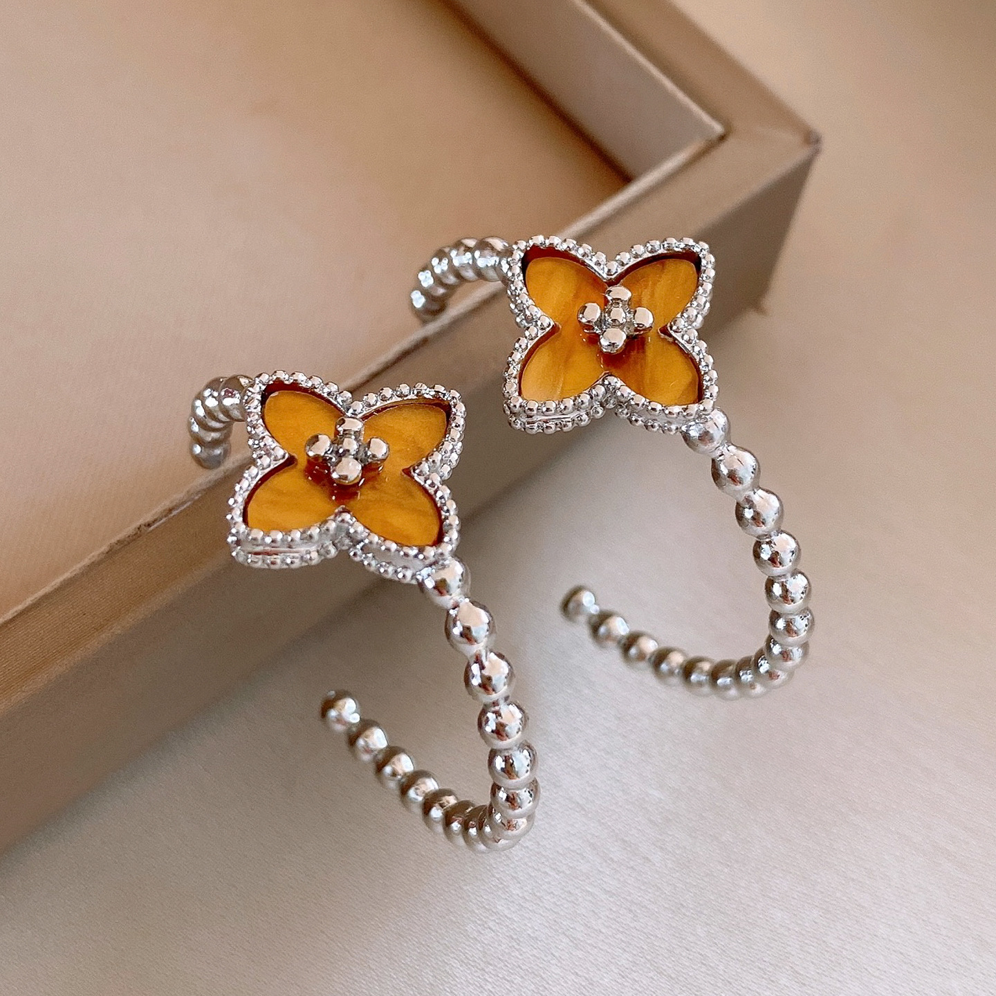 欧美简约圆形串珠花朵C形耳环轻奢高级感耳钉时尚个性气质耳饰女
