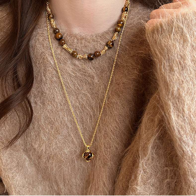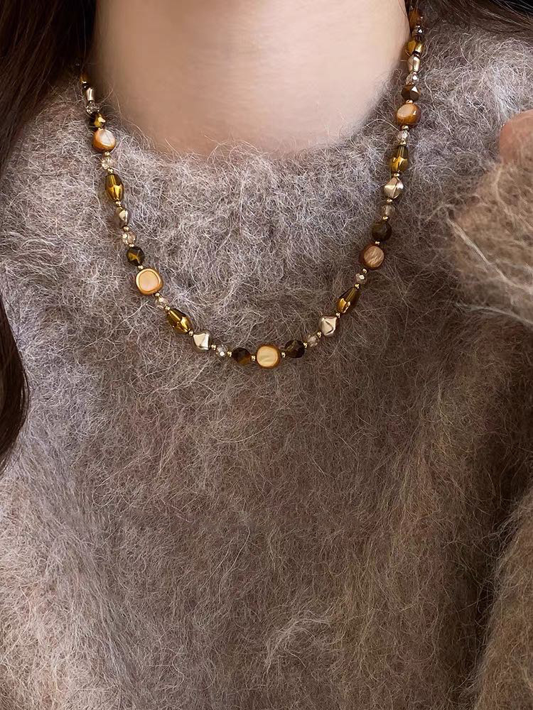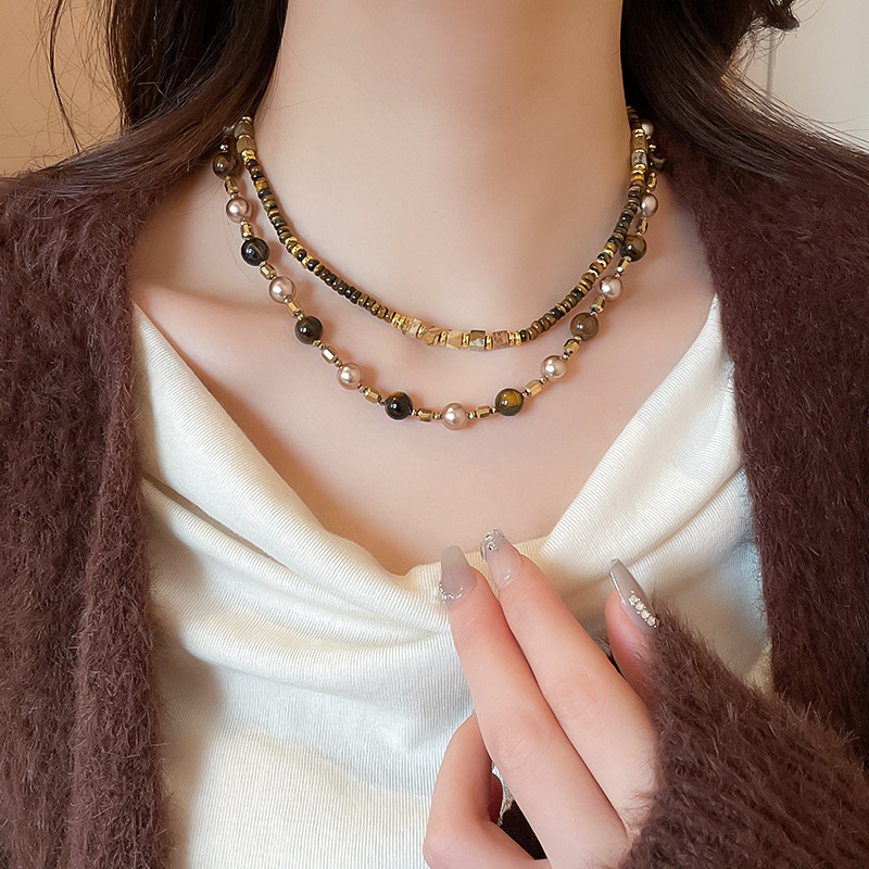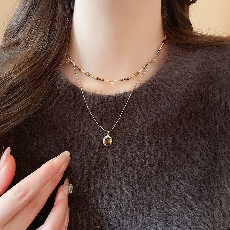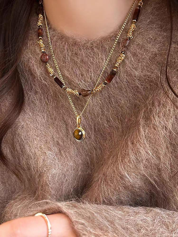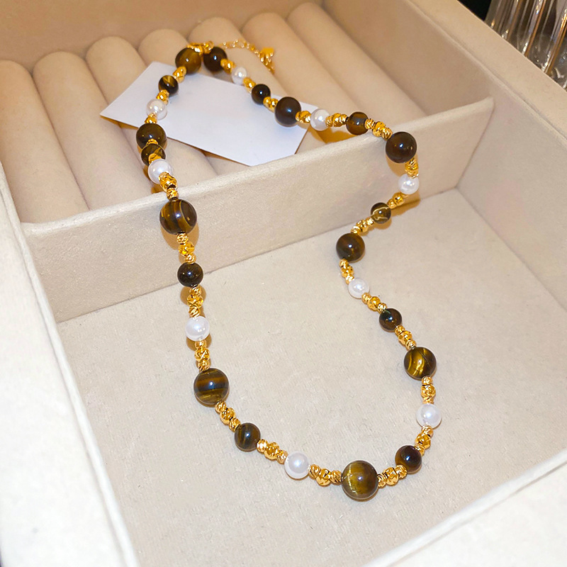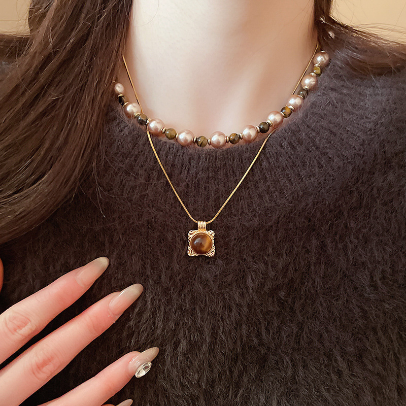 咖色美拉德虎眼石珍珠项链轻奢小众锁骨链复古气质铜百搭项饰批发