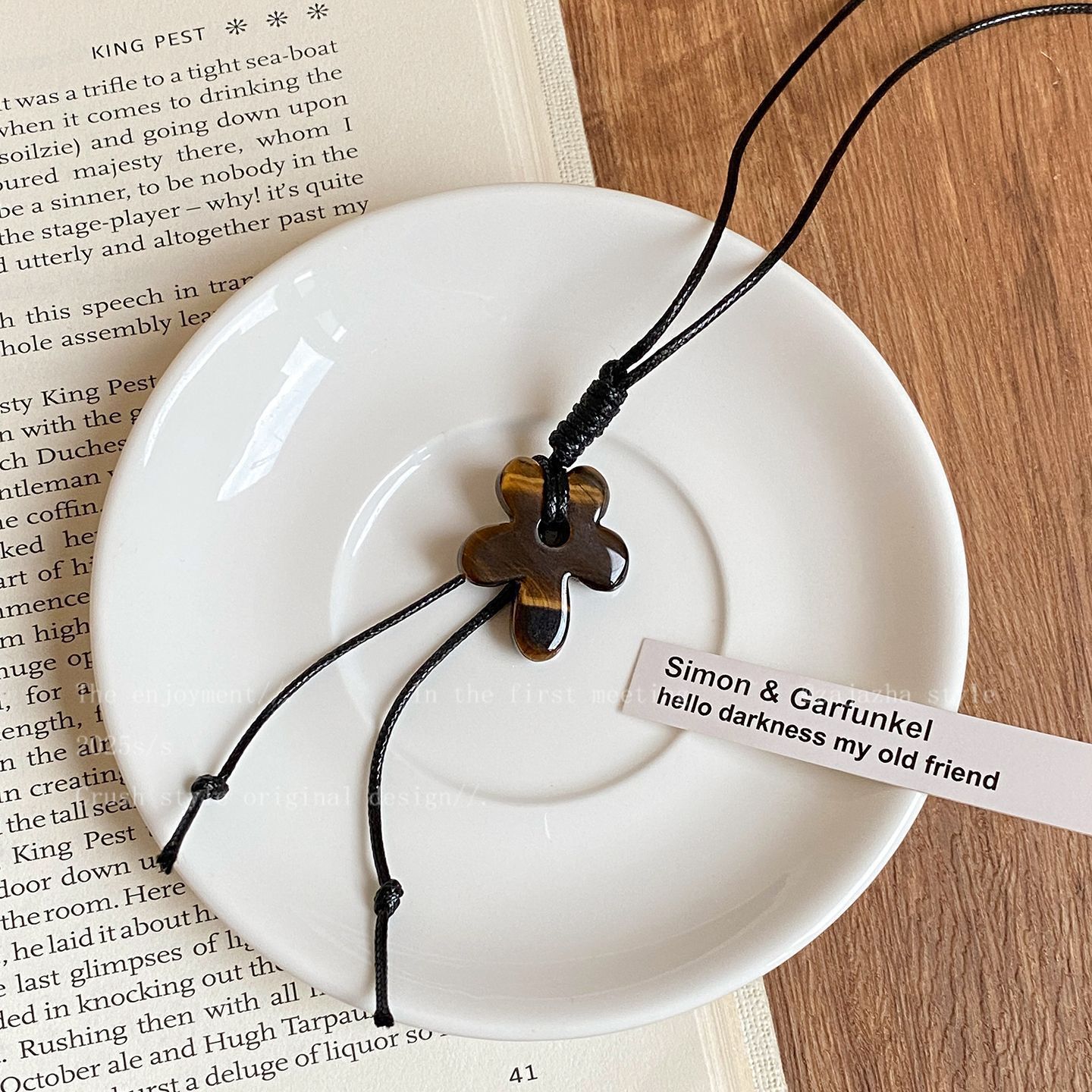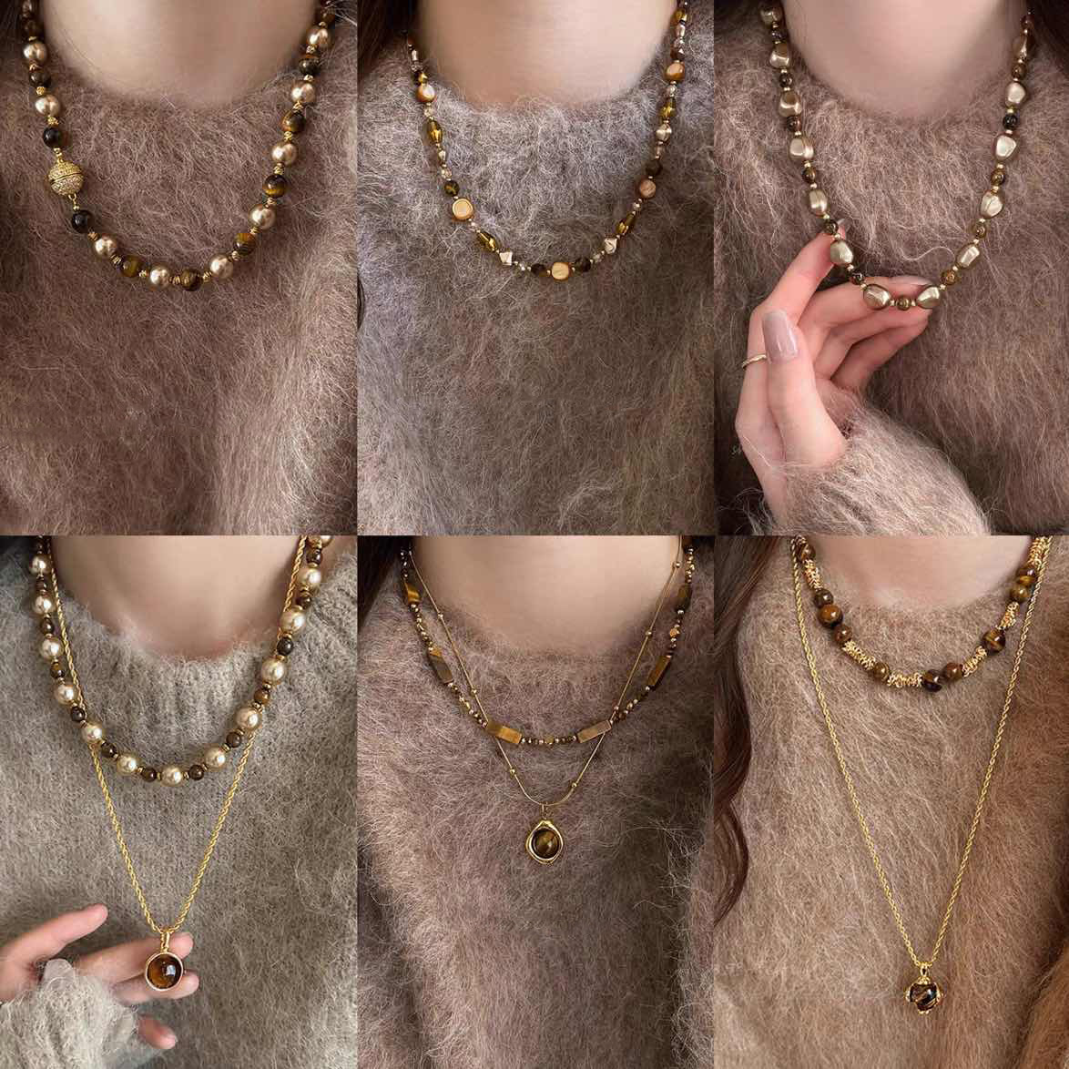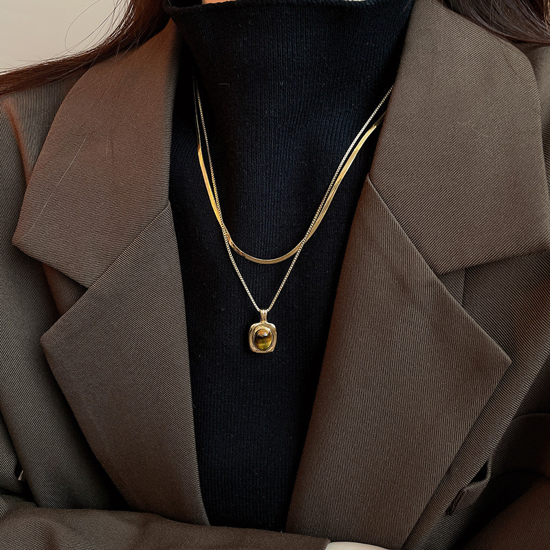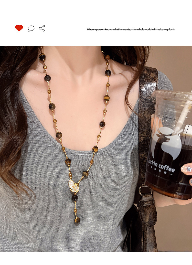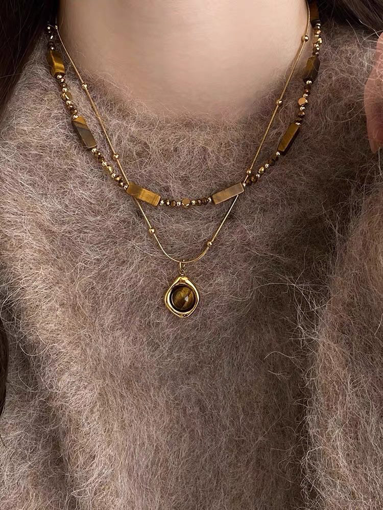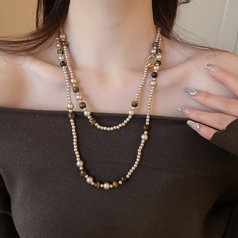 咖色美拉德虎眼石珍珠项链轻奢小众锁骨链复古气质铜百搭项饰批发