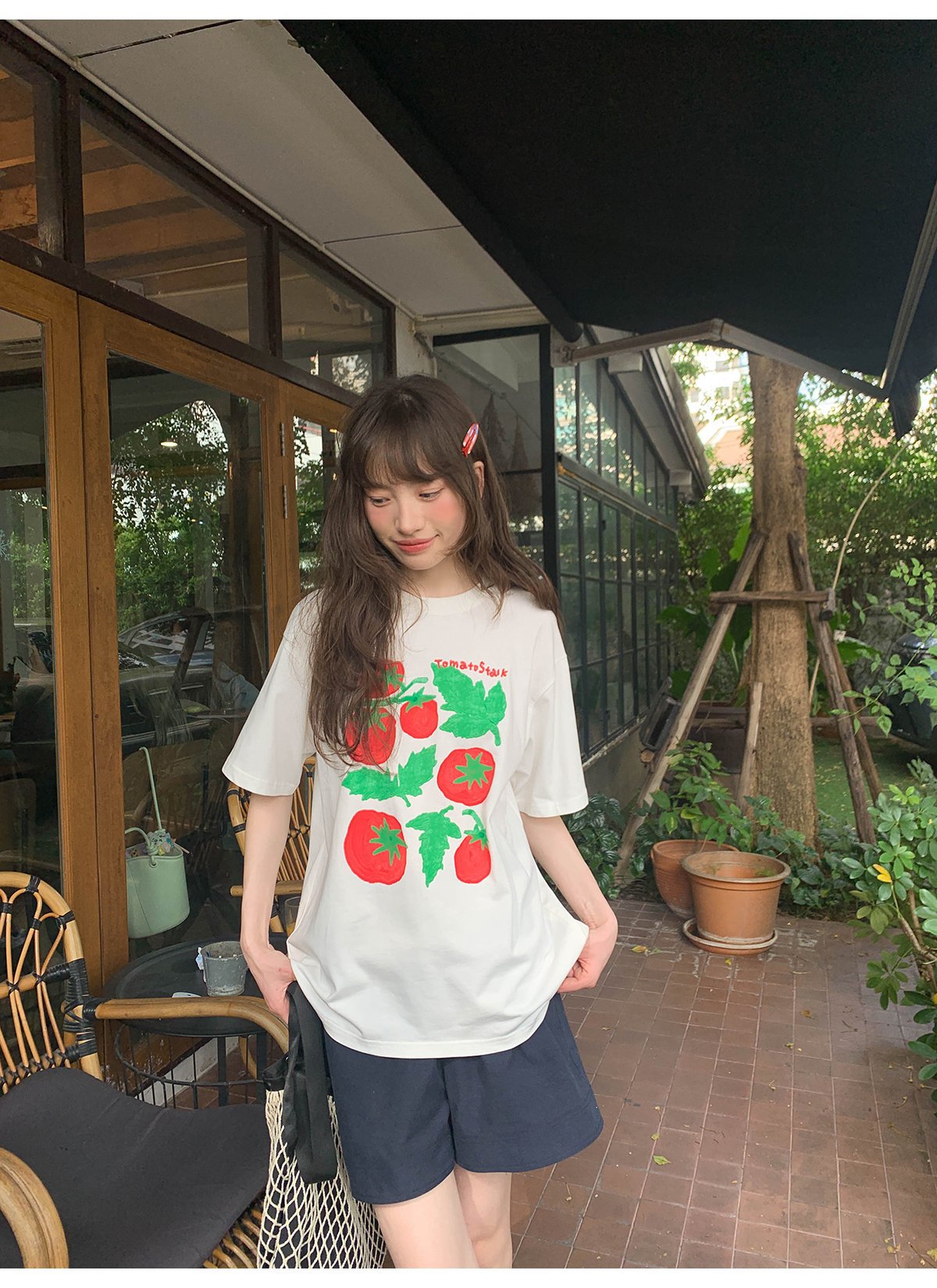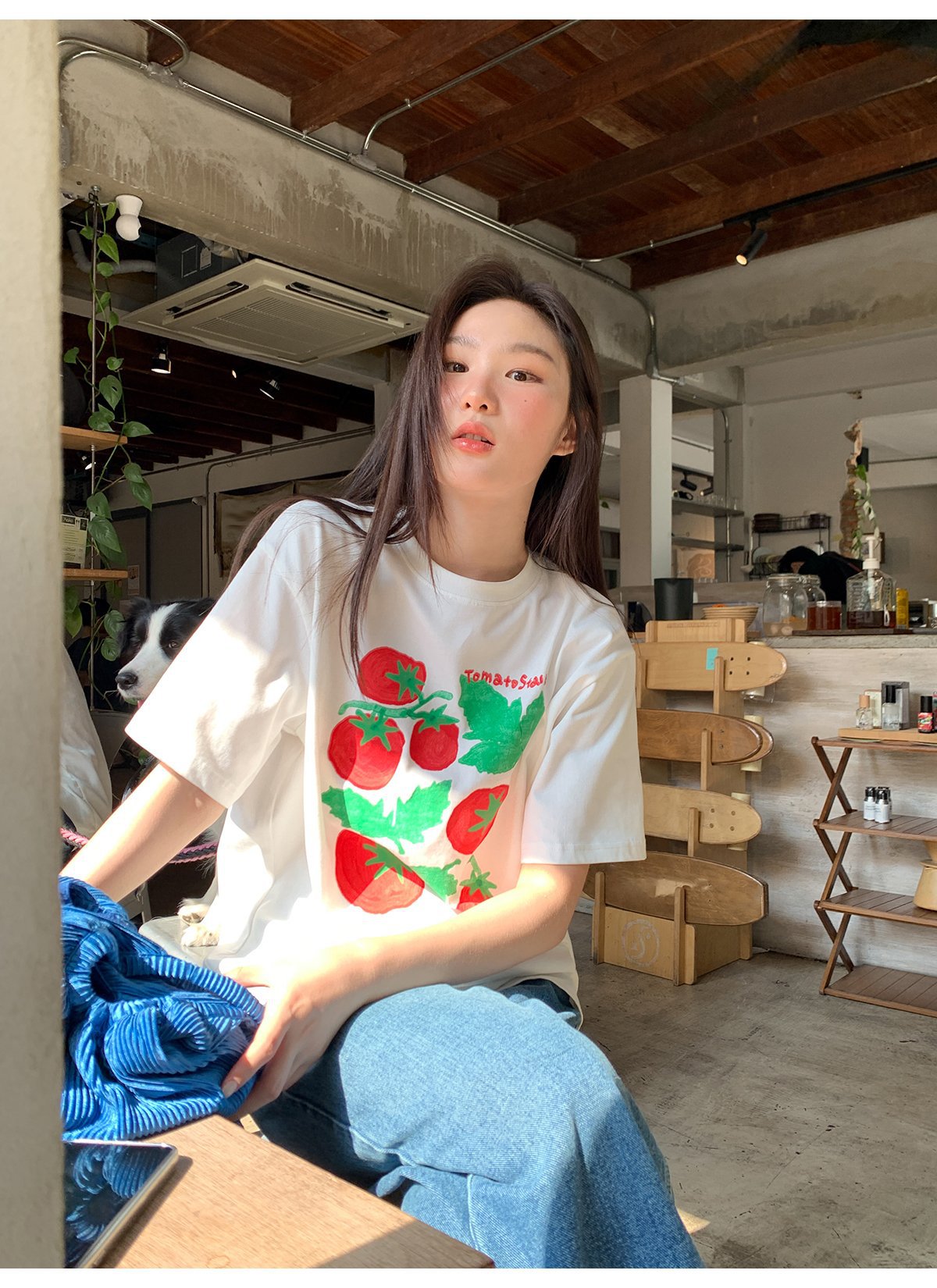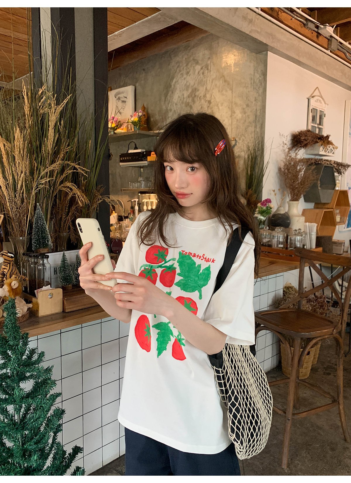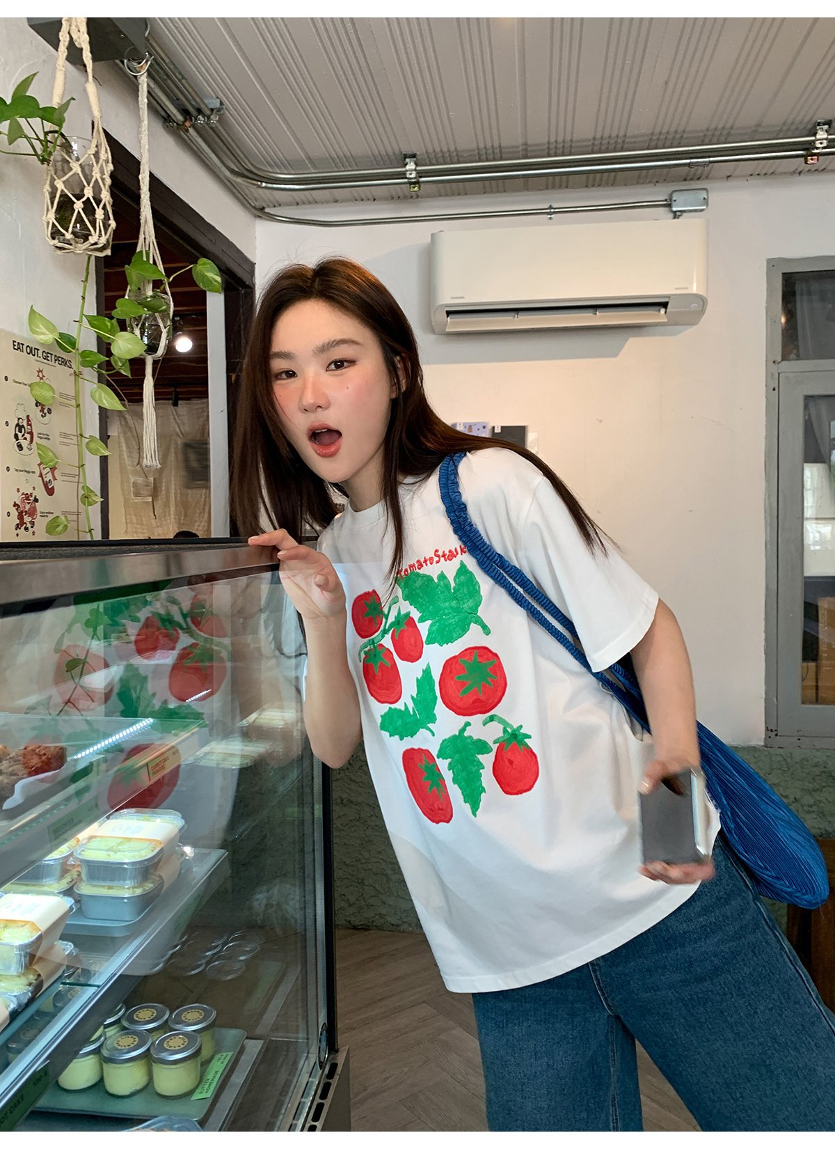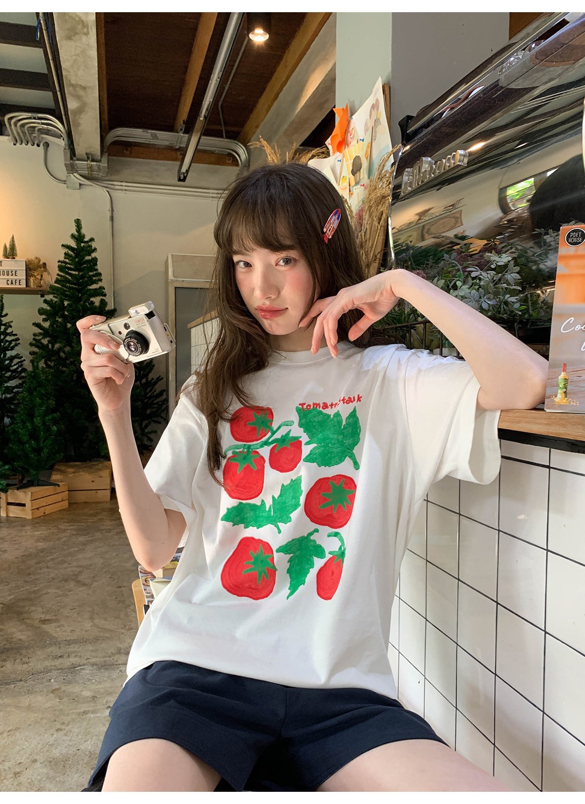 原创番茄印花休闲短袖t恤女夏新款独特宽松圆领纯棉上衣
