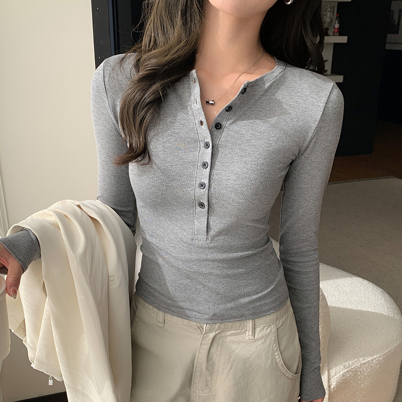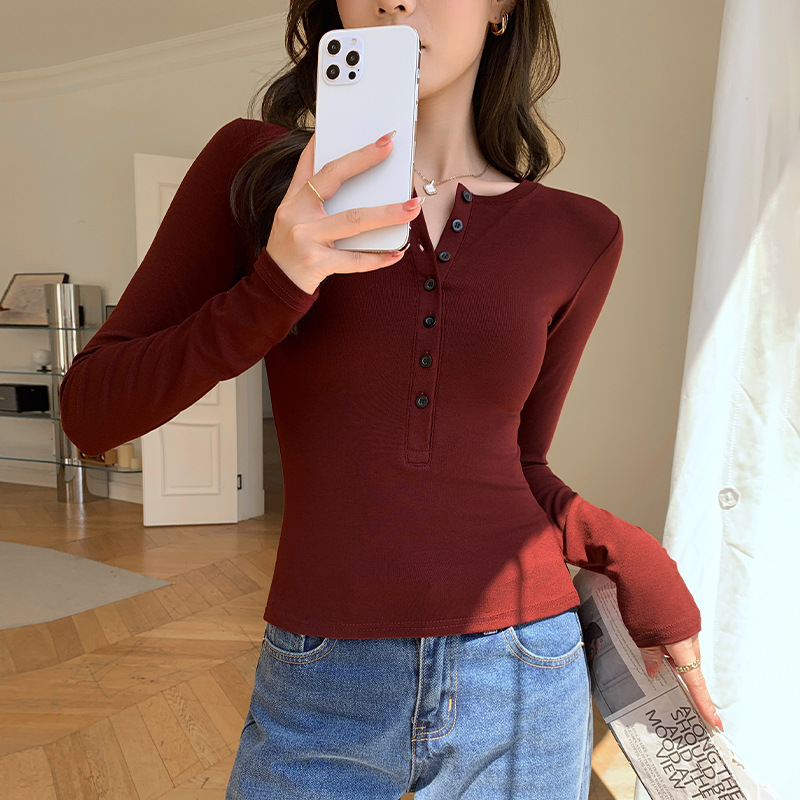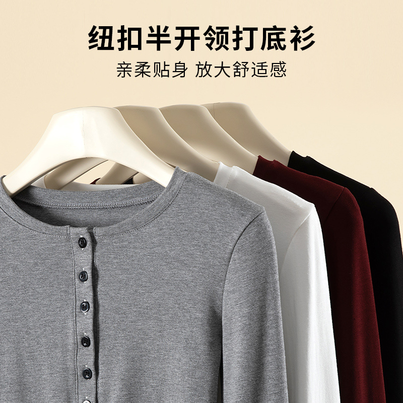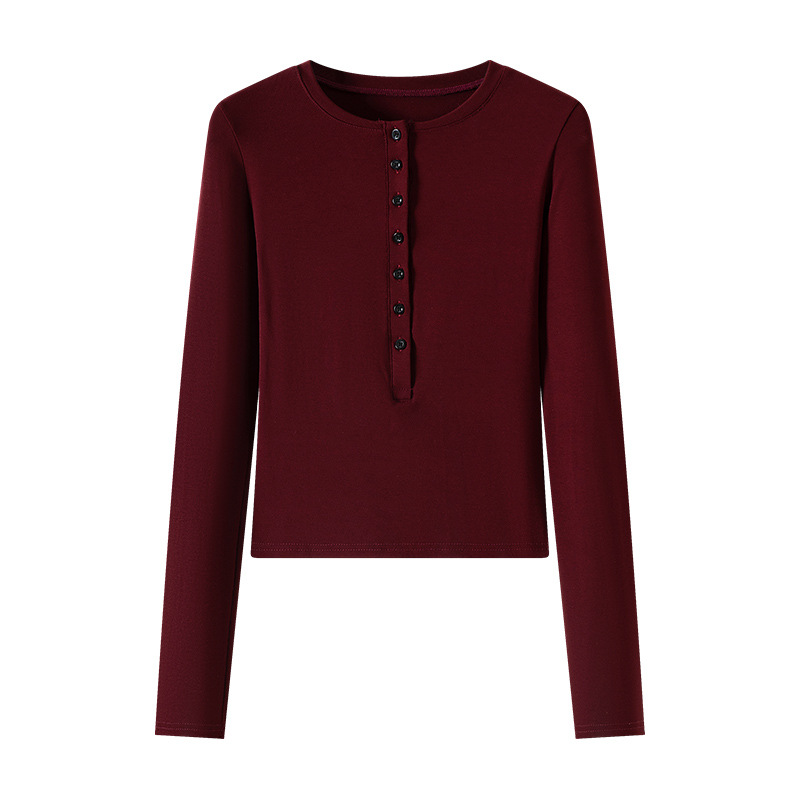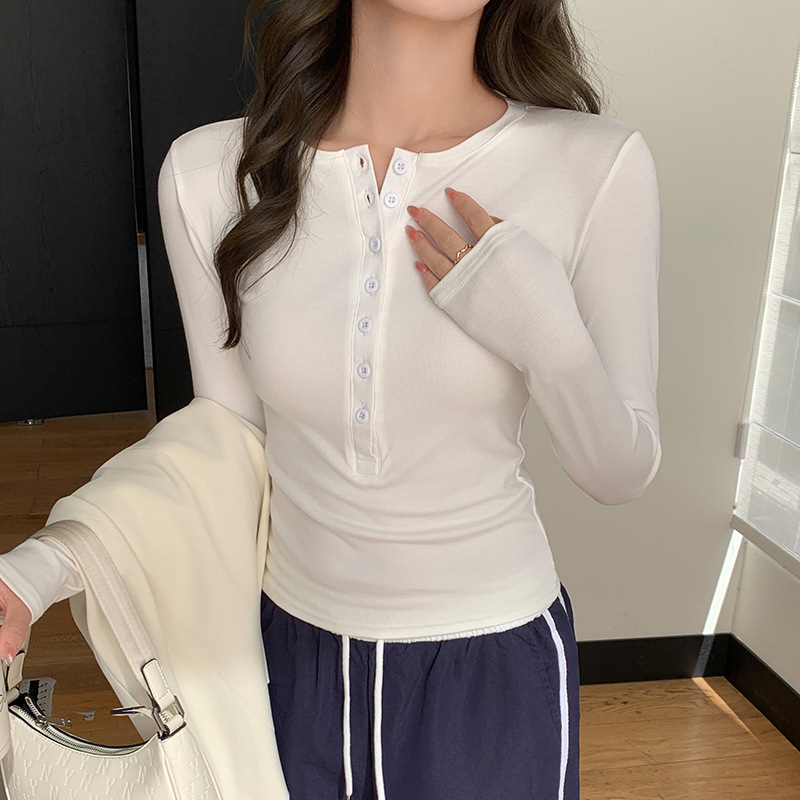K2105排扣半开领长袖内搭打底衫女士早秋新款辣妹韩系修身T恤上衣