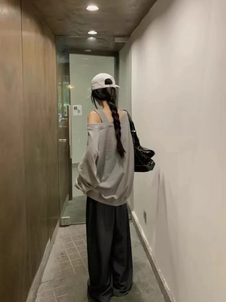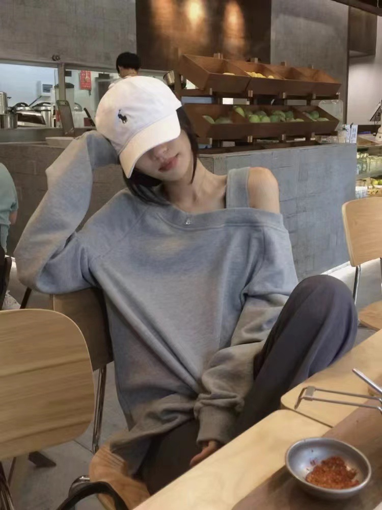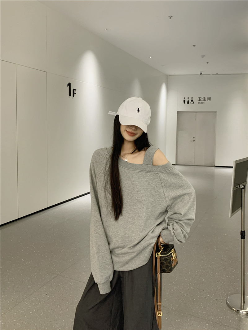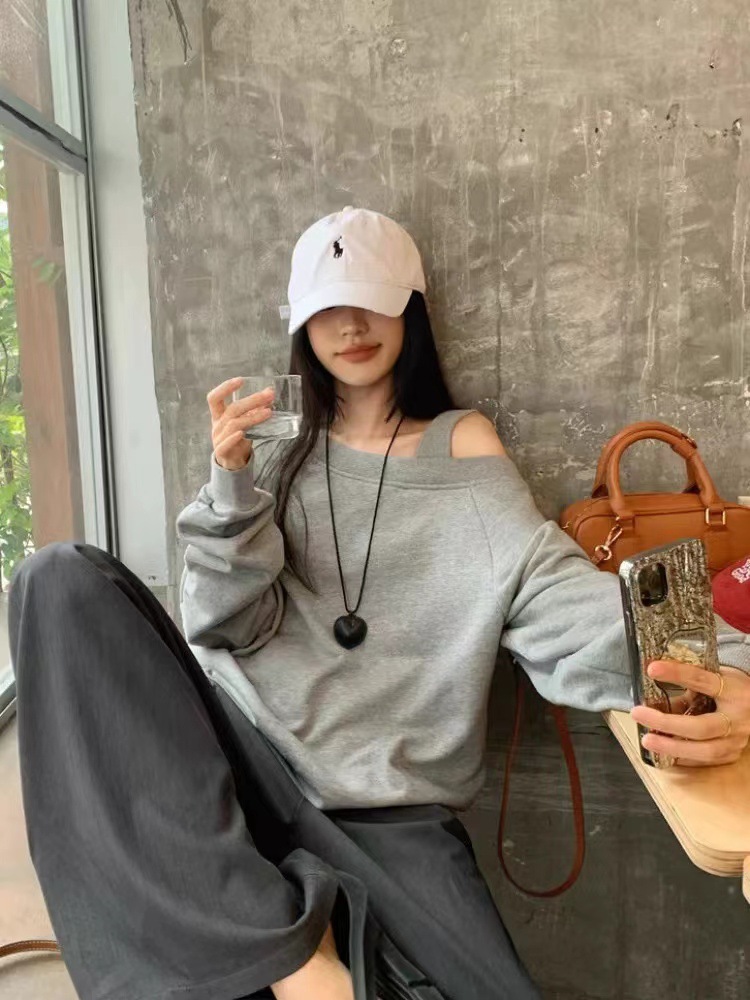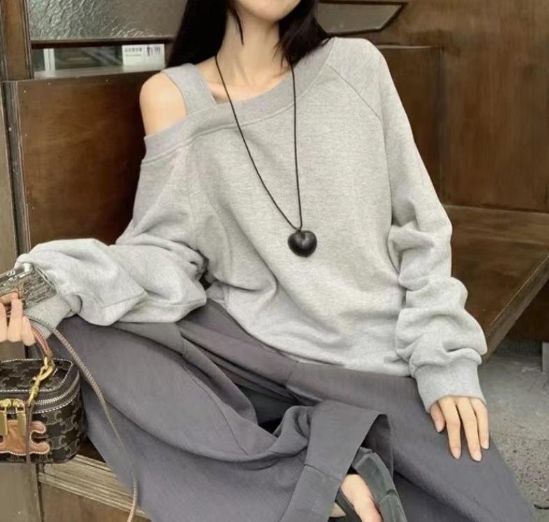美式斜肩露肩宽松套头长袖卫衣女 2024设计感辣妹宽松ins秋季上衣