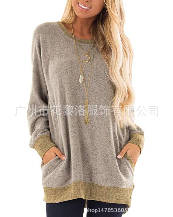 亚马逊2022秋冬女装圆领撞色口袋卫衣长袖套头运动衫休闲T恤
