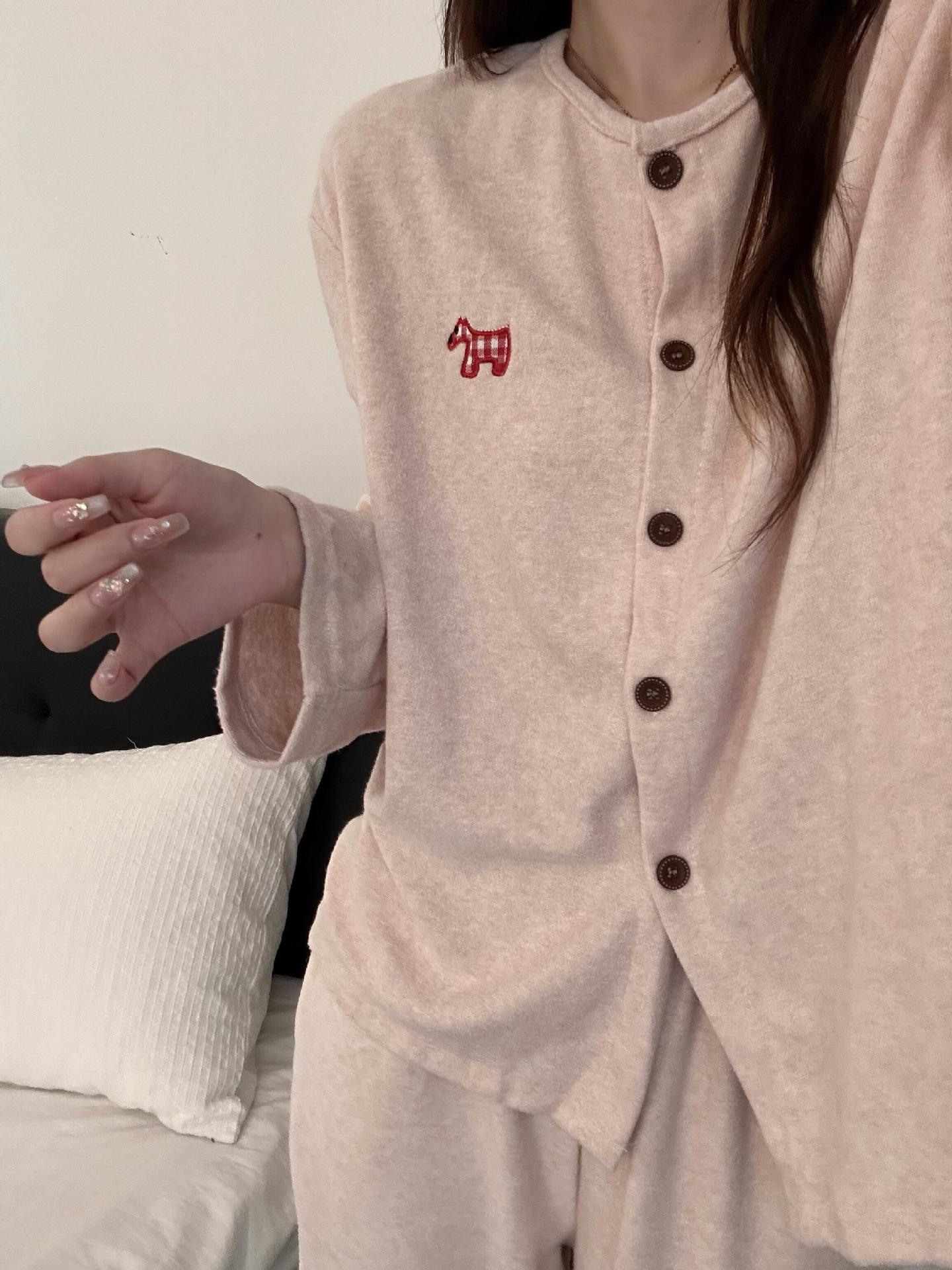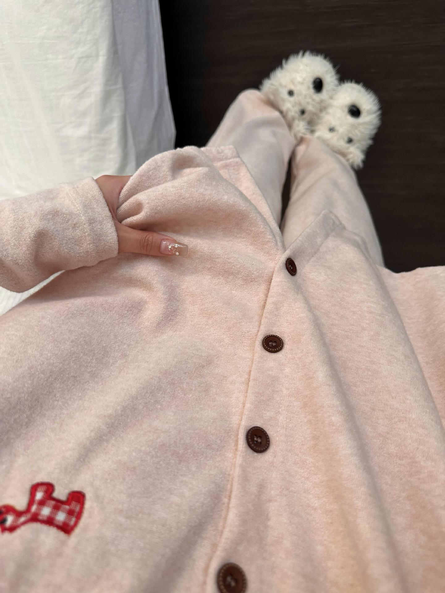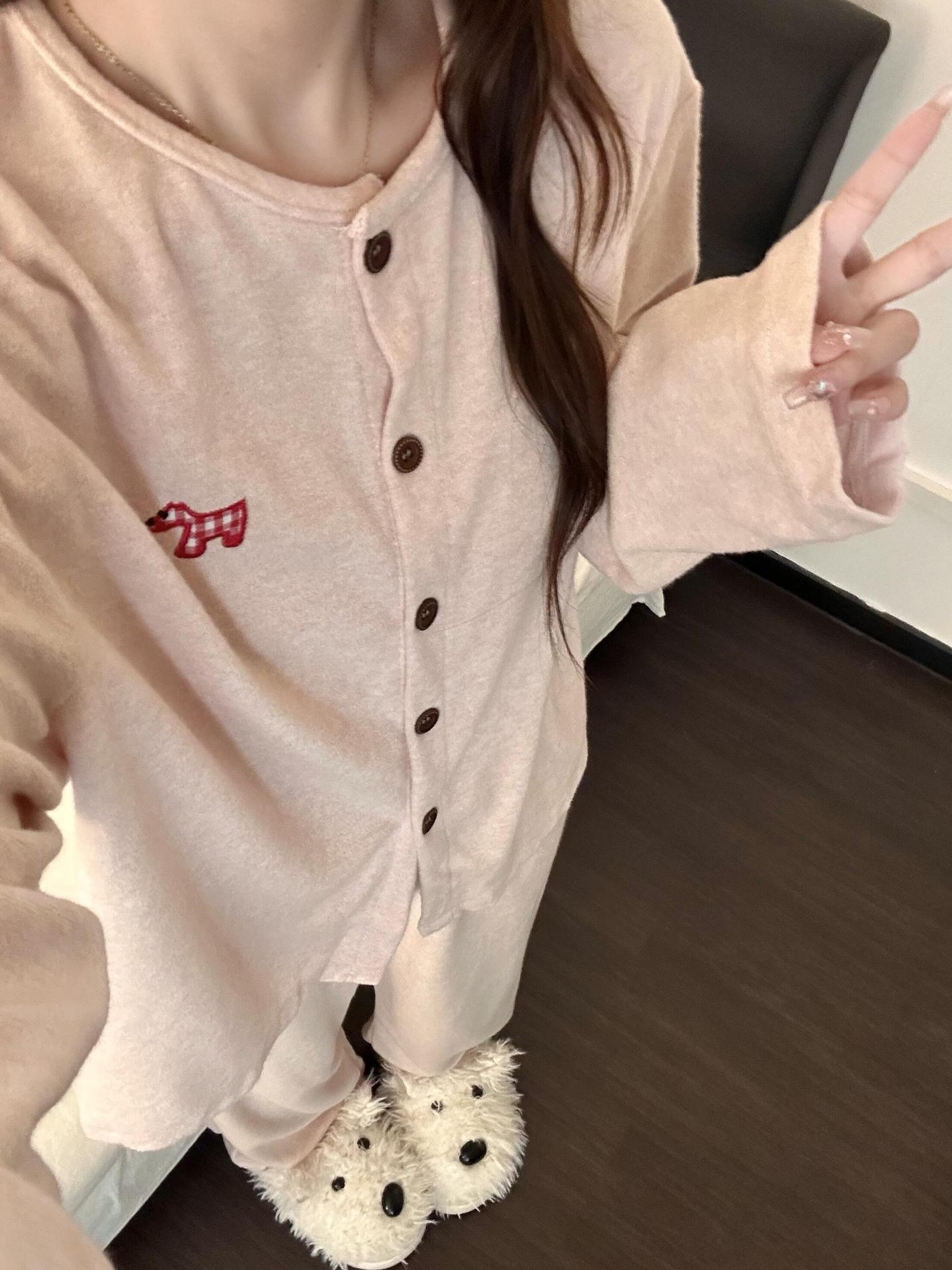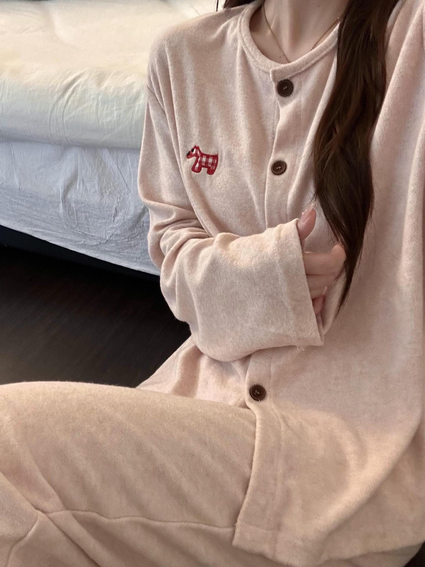 甜美小狗慵懒德绒睡衣女春秋季新款大码长袖长裤家居服套装可外穿