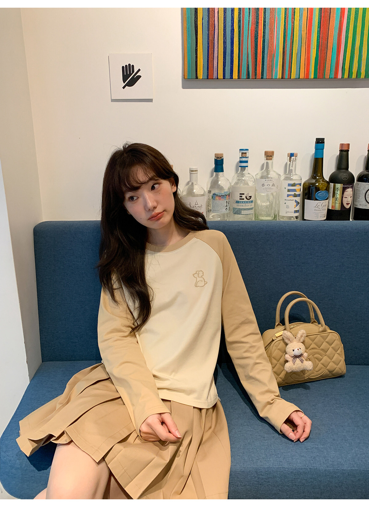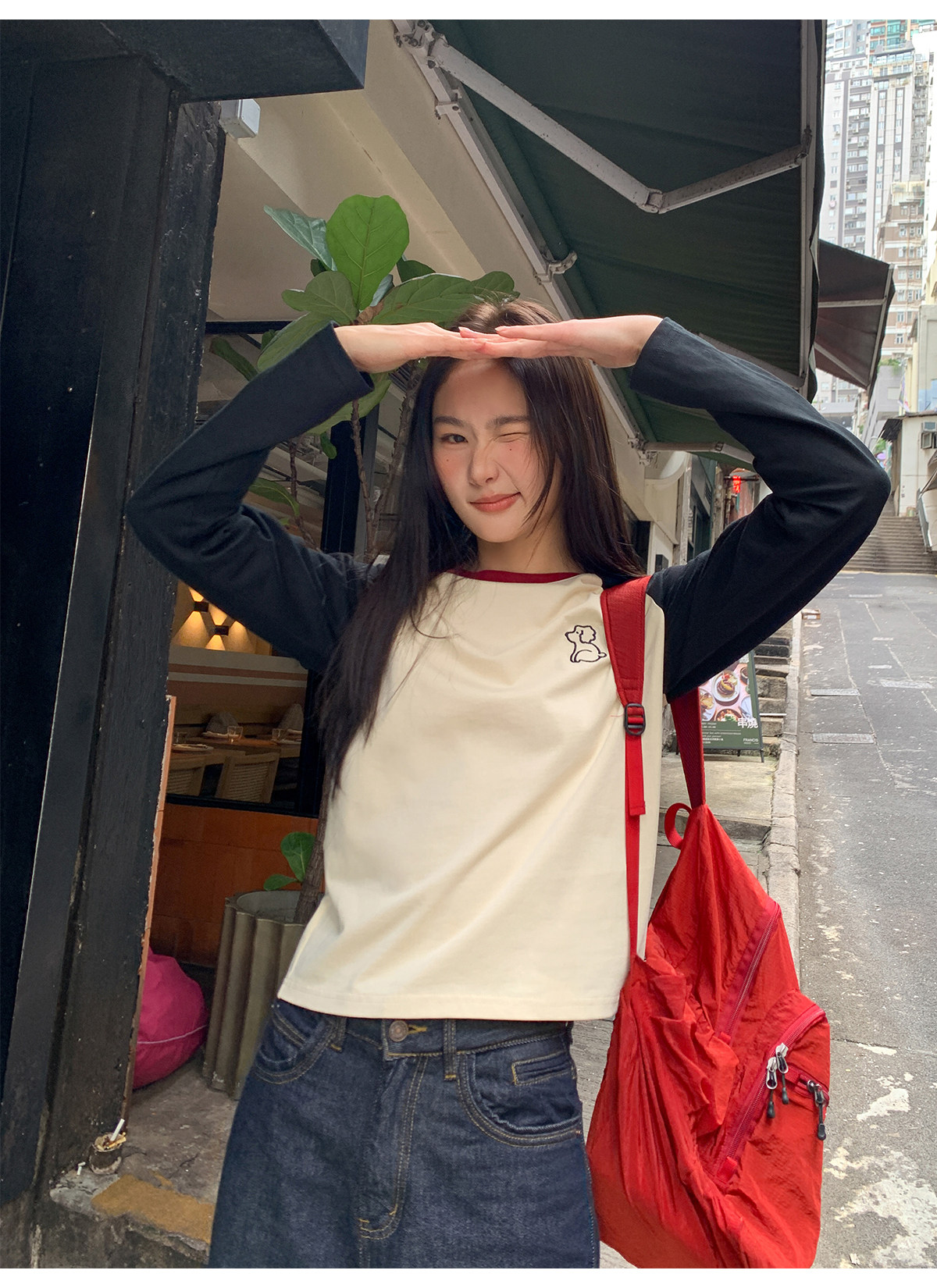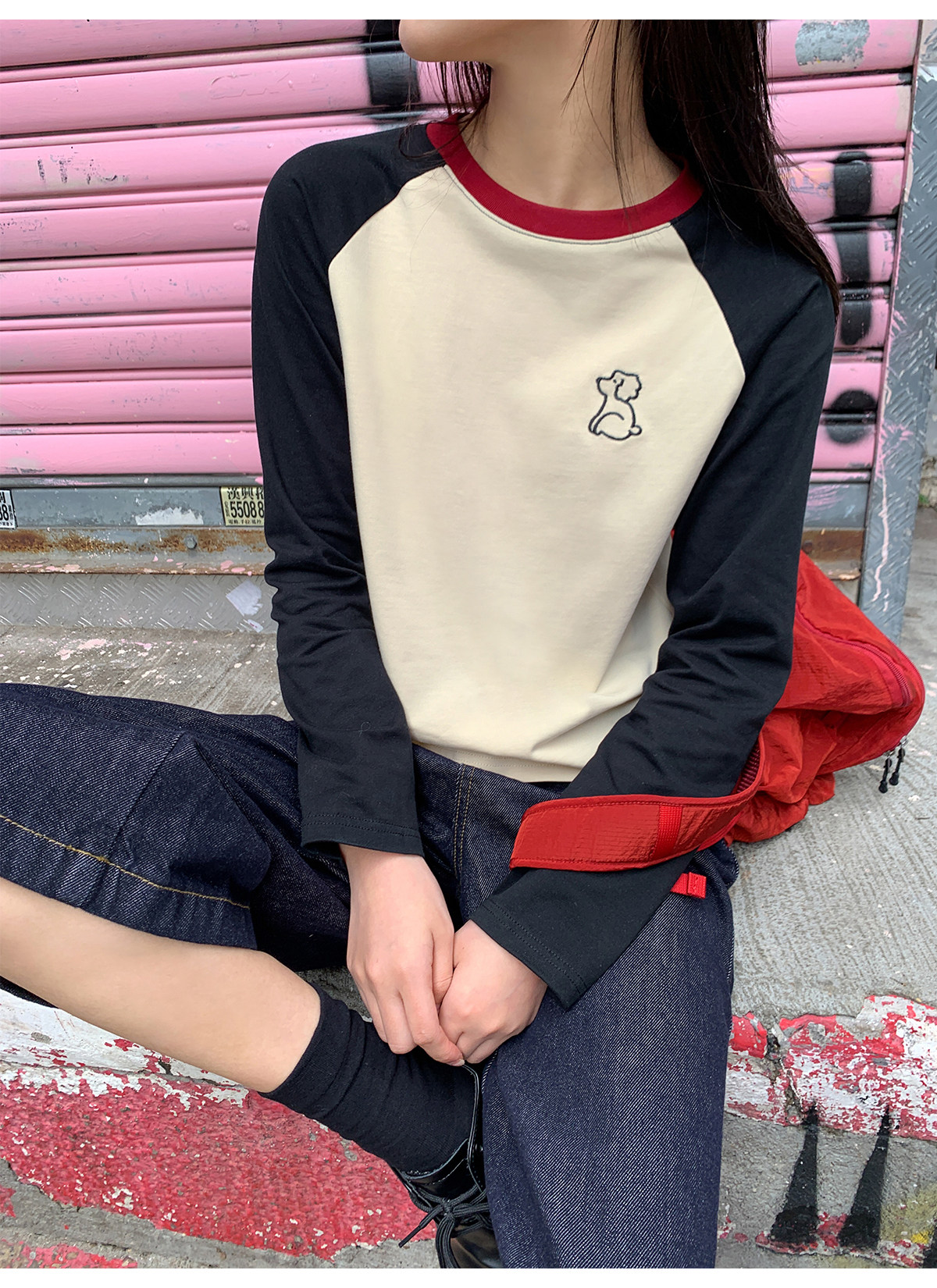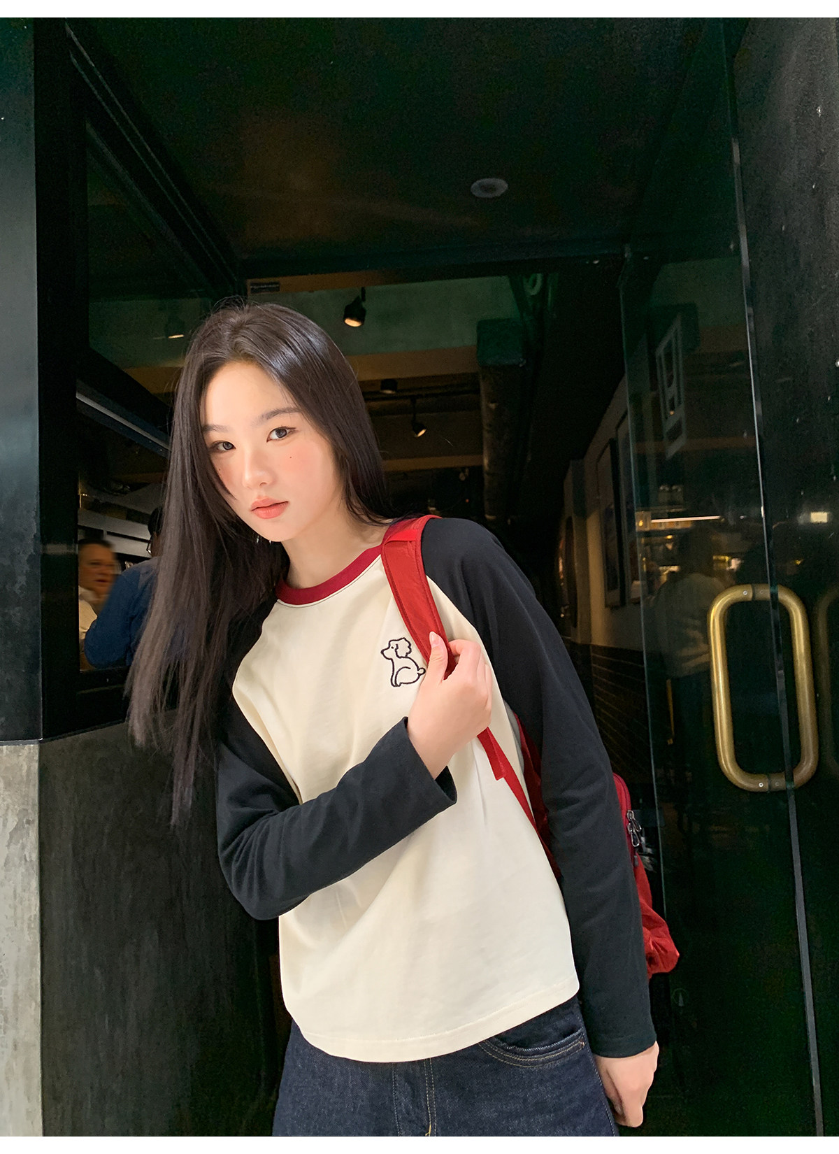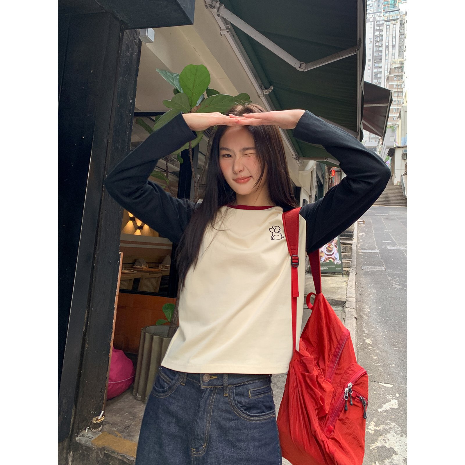 撞色美式插肩袖长袖t恤女2025新款宽松圆领纯棉体恤上衣