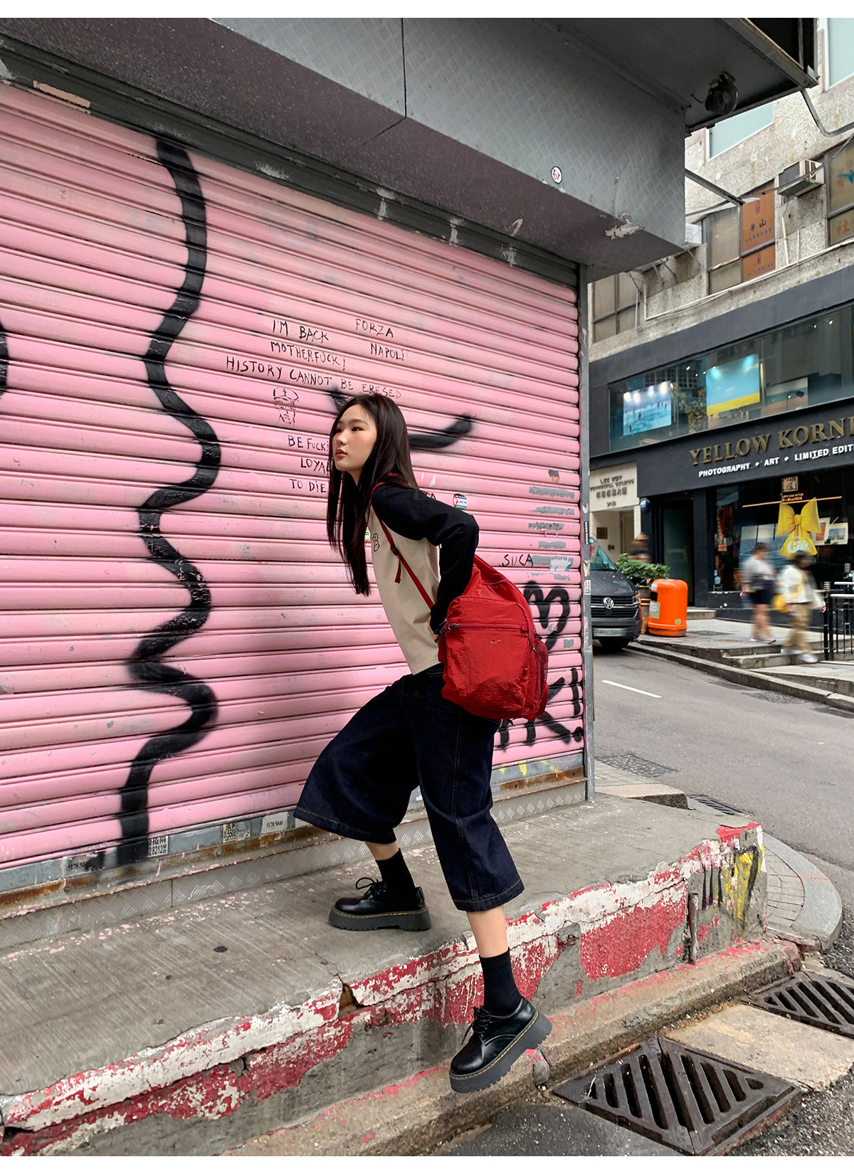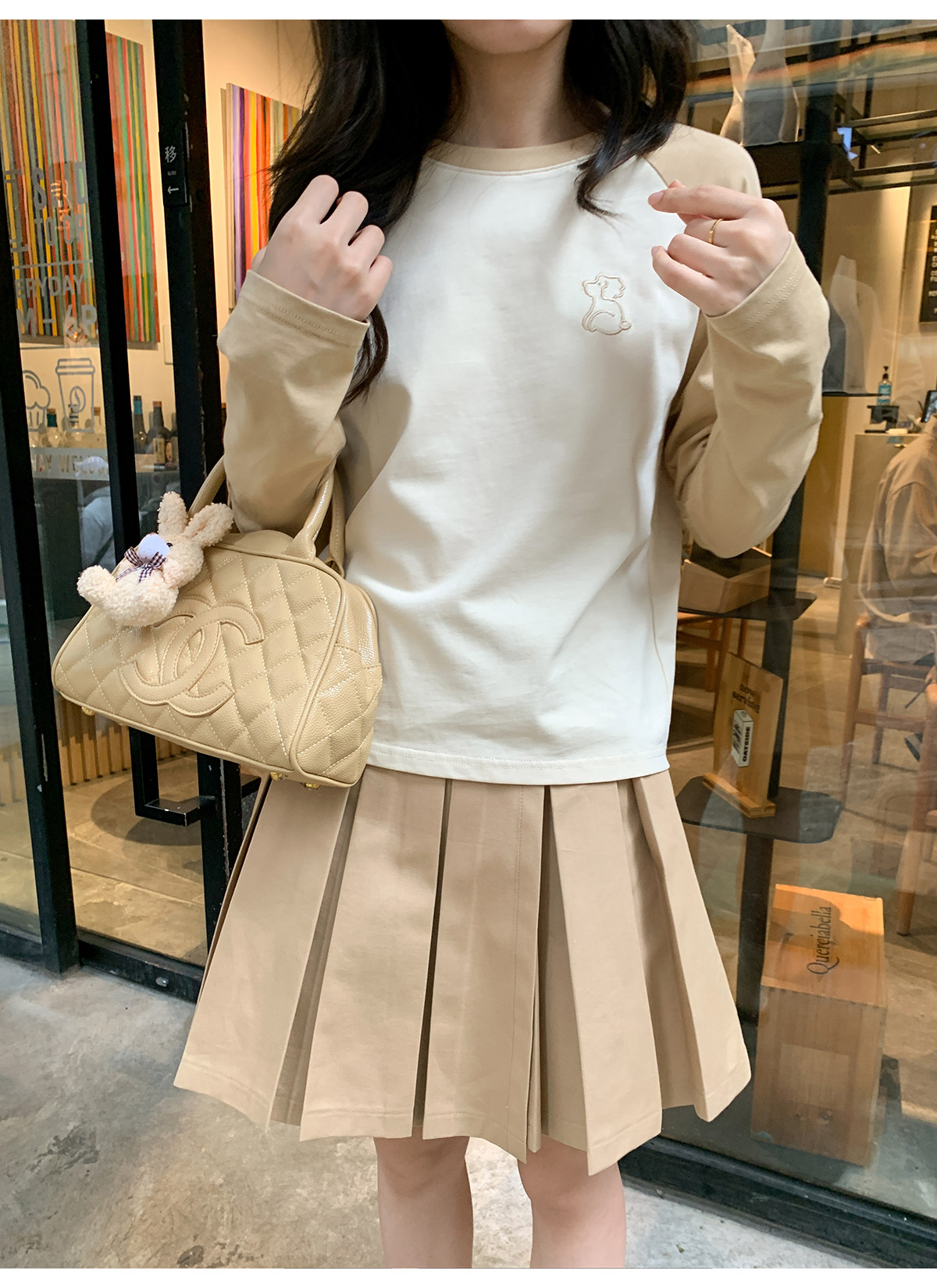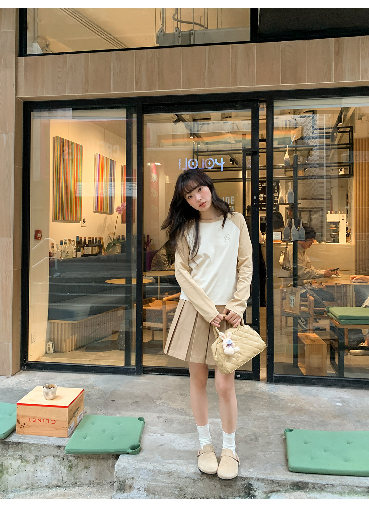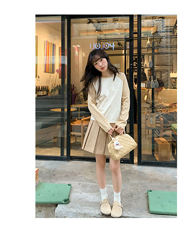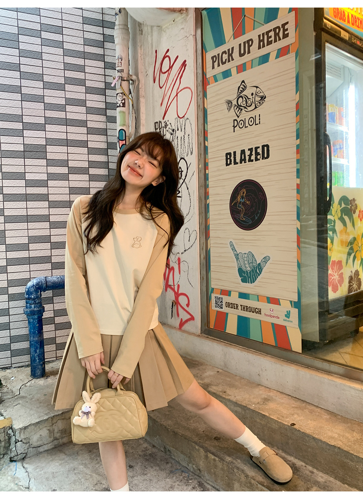 撞色美式插肩袖长袖t恤女2025新款宽松圆领纯棉体恤上衣