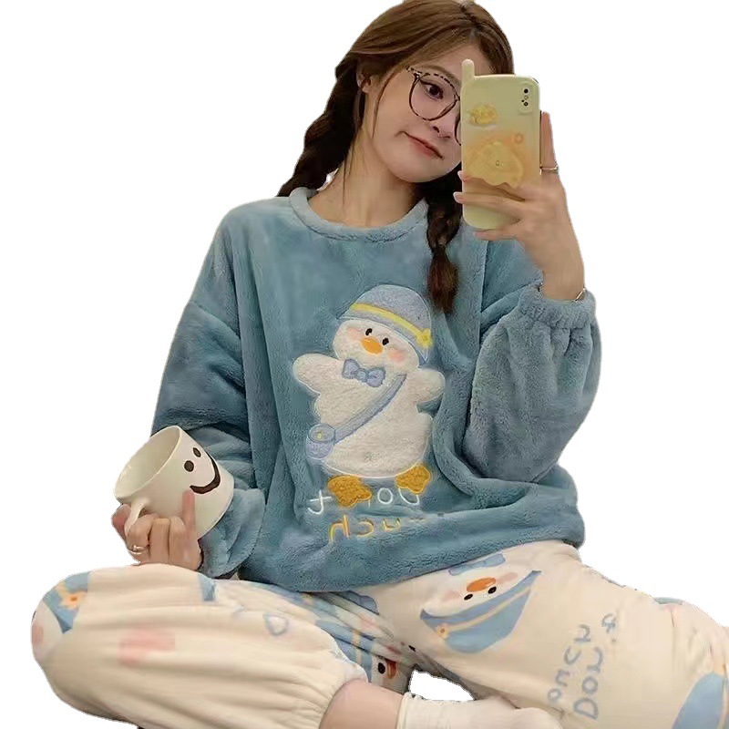 睡衣女秋冬季长袖珊瑚绒加厚加绒学生冬天法兰绒加大码家居服套装