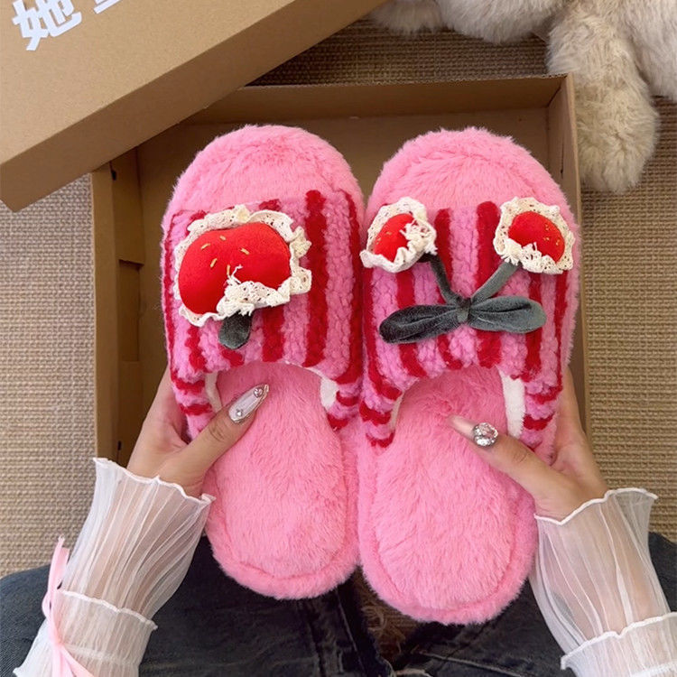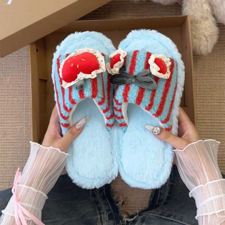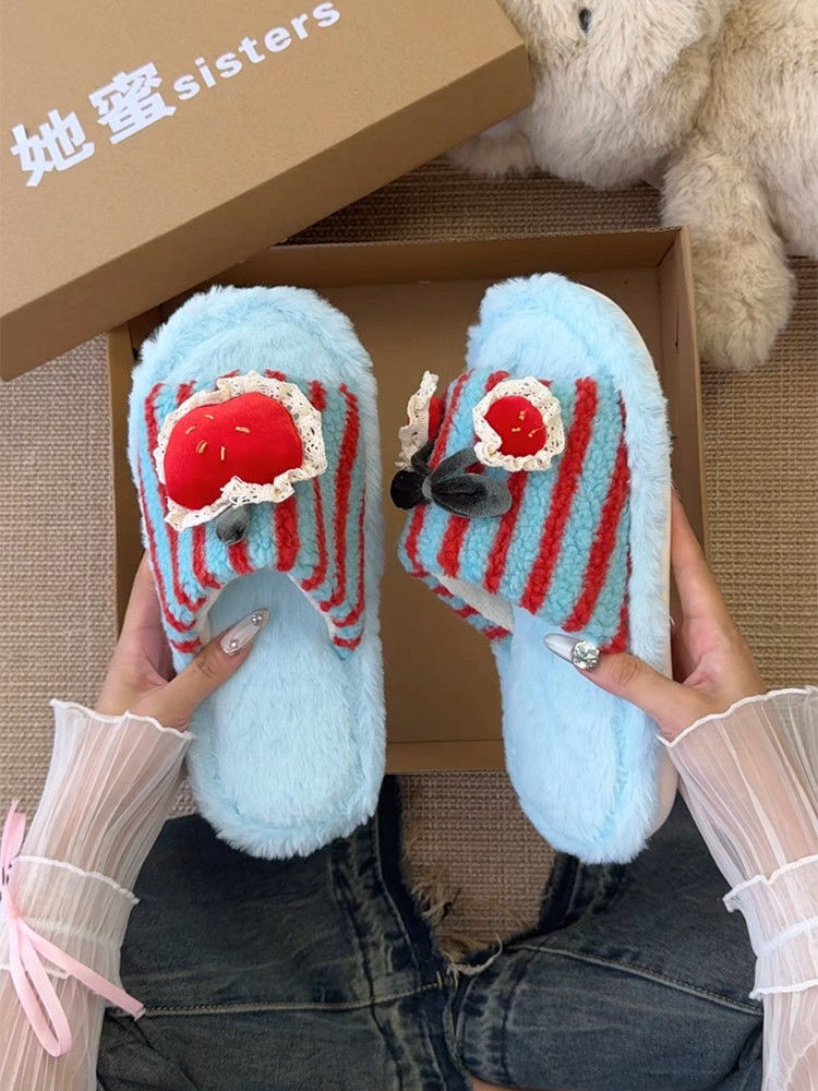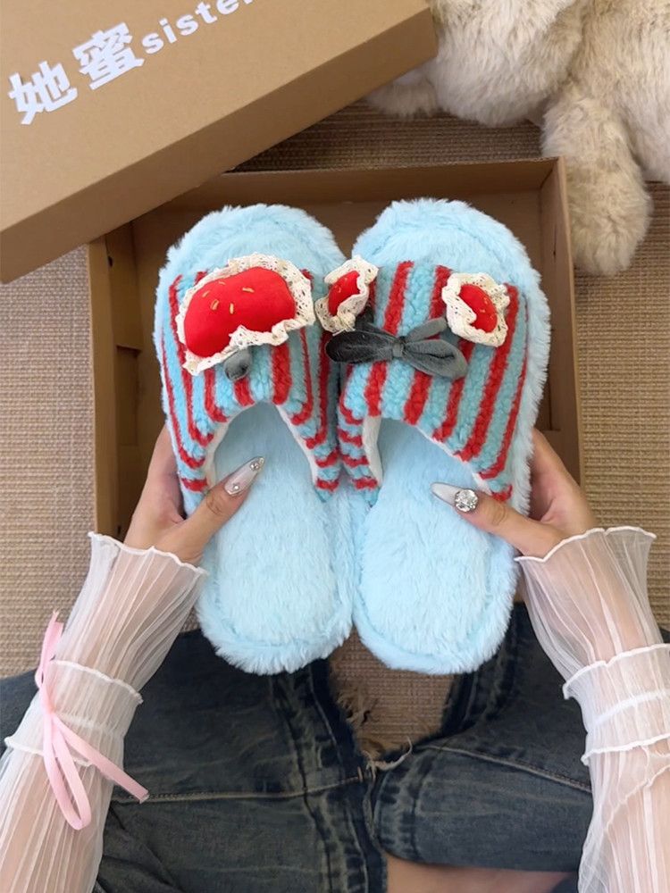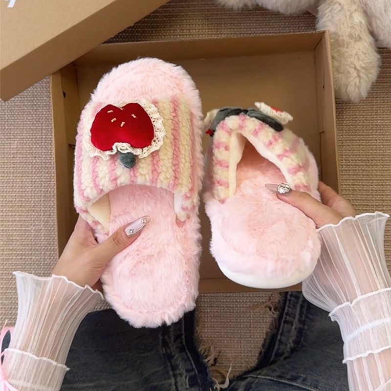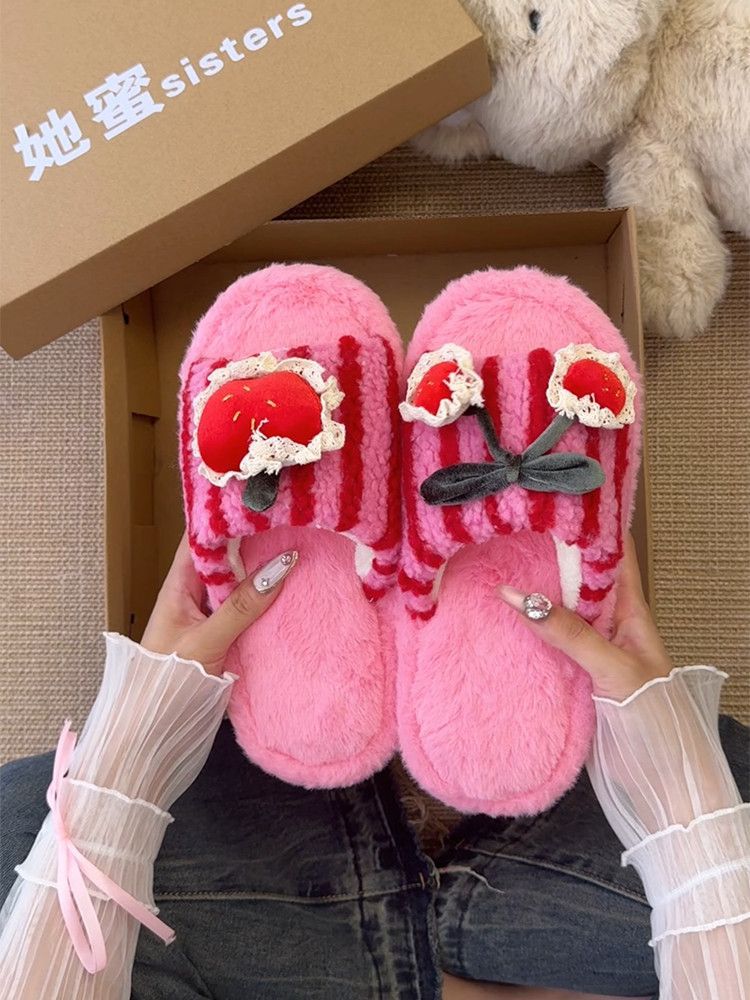 可爱卡通条纹殷桃配饰毛毛拖鞋女2025冬新款外穿居家棉拖鞋一字拖
