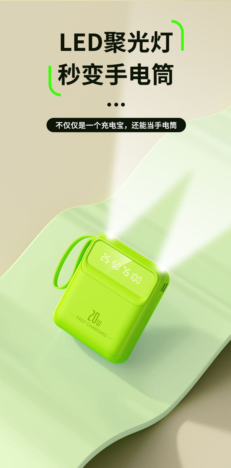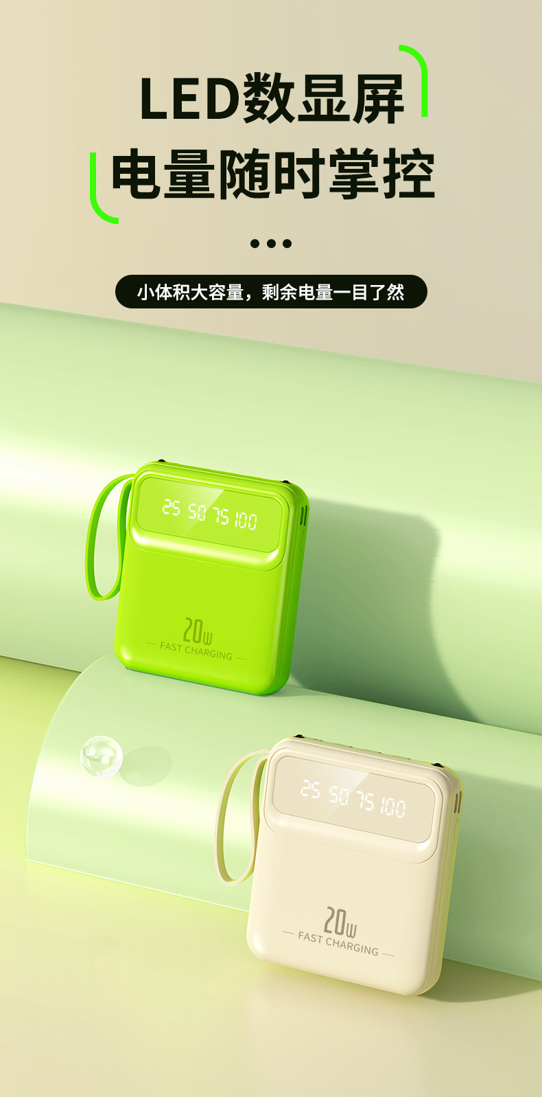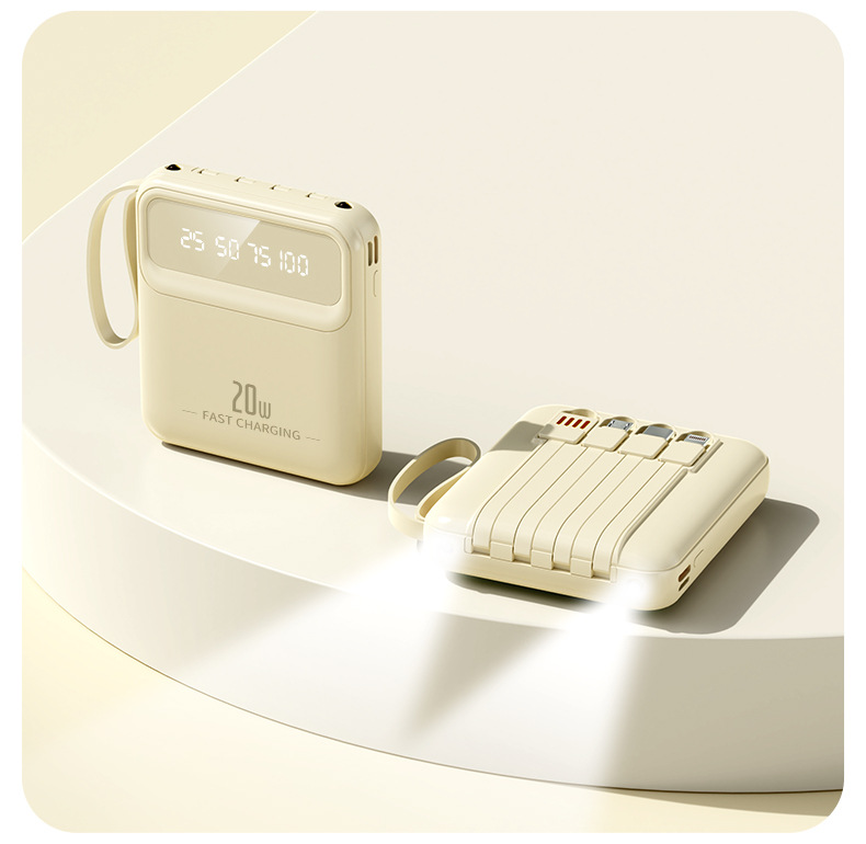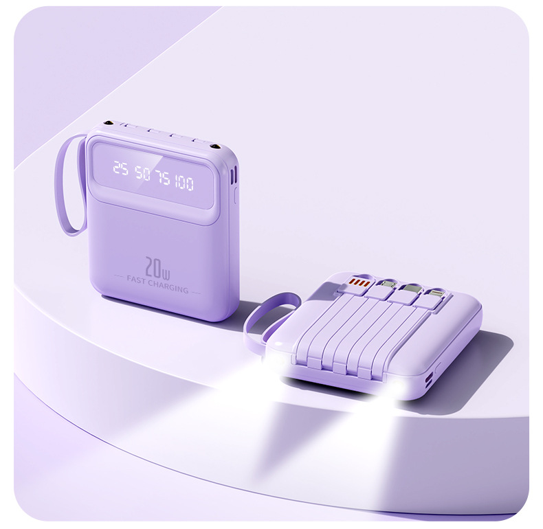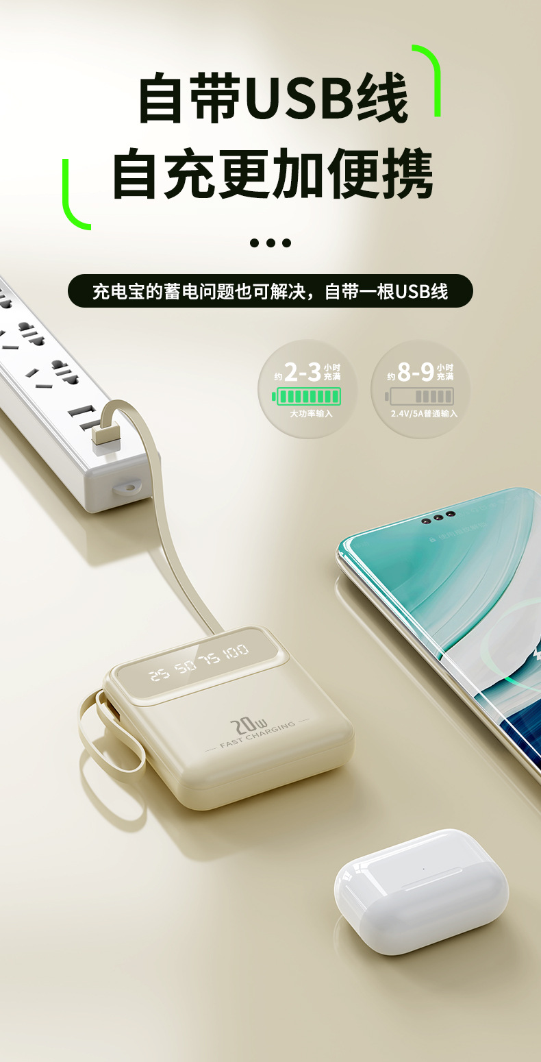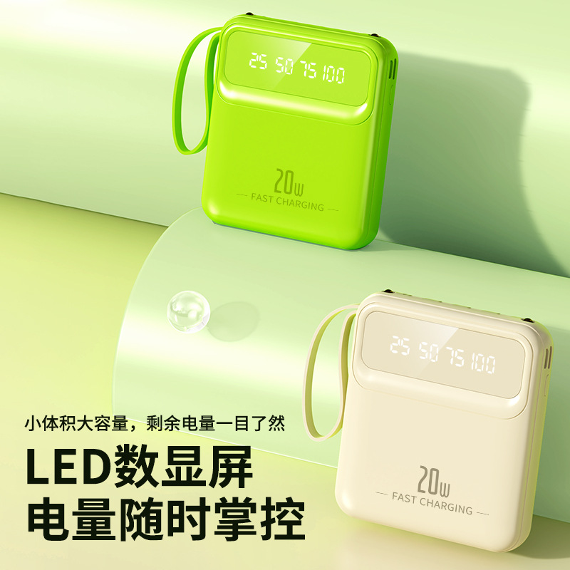 便携自带线充电宝大容量20000mAh数显镜面移动电源礼品定制LOGO