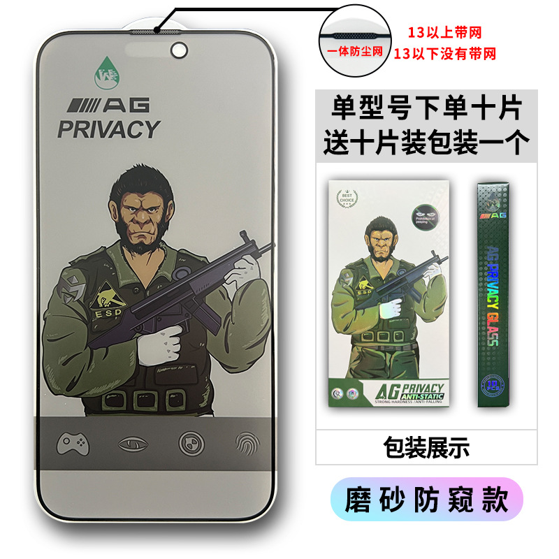 大猩猩钢化膜适用iPhone16苹果17防窥13防指纹15磨砂14手机玻璃膜