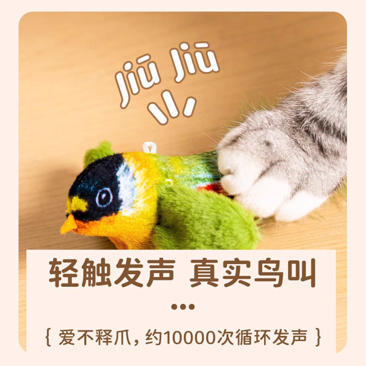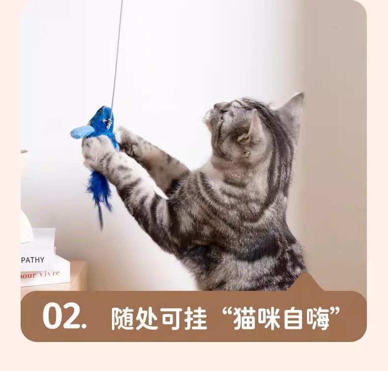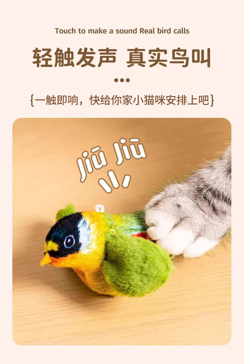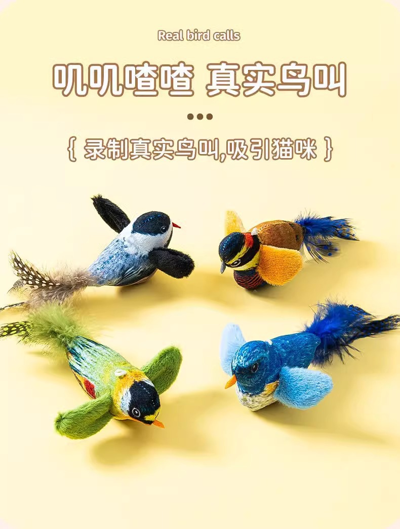 跨境猫玩具仿真发声小鸟爆款真羽毛可悬挂自嗨解闷小猫咪宠物玩具