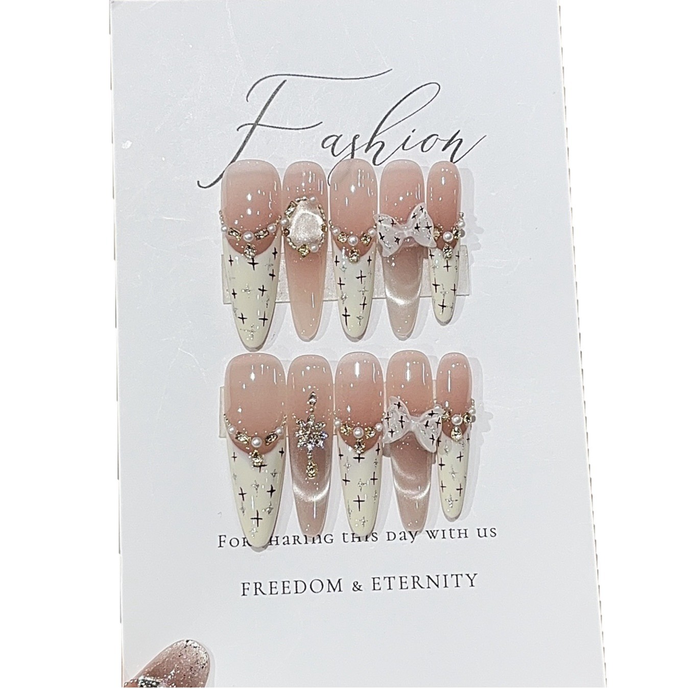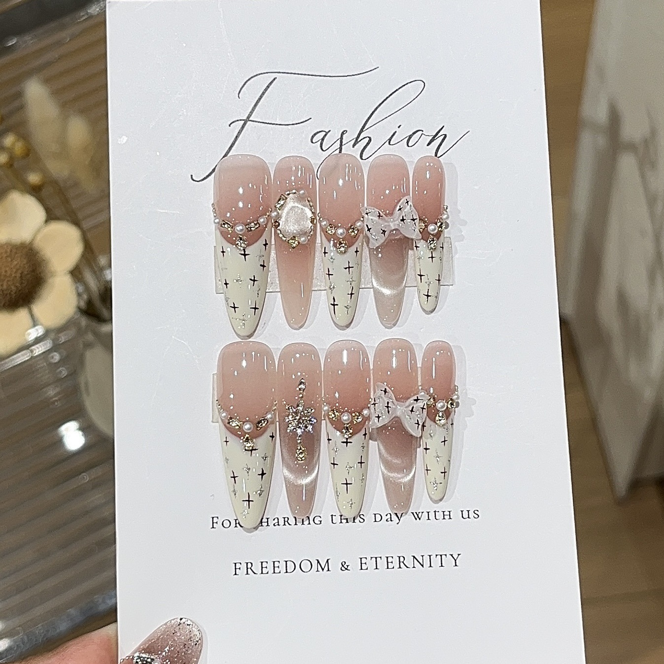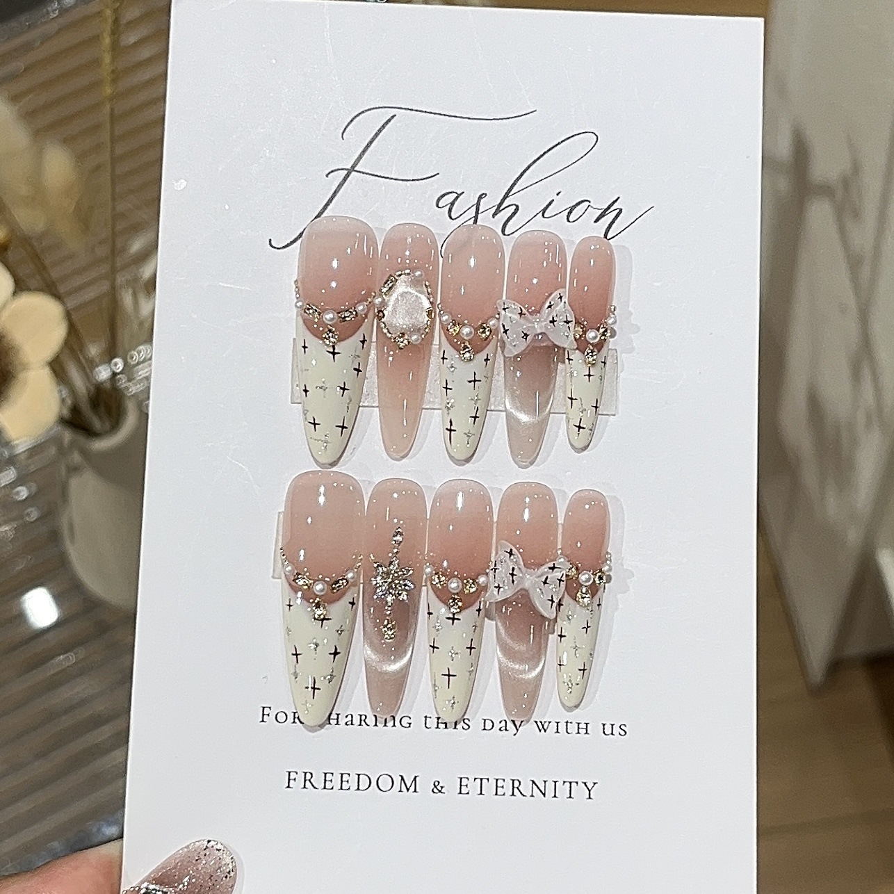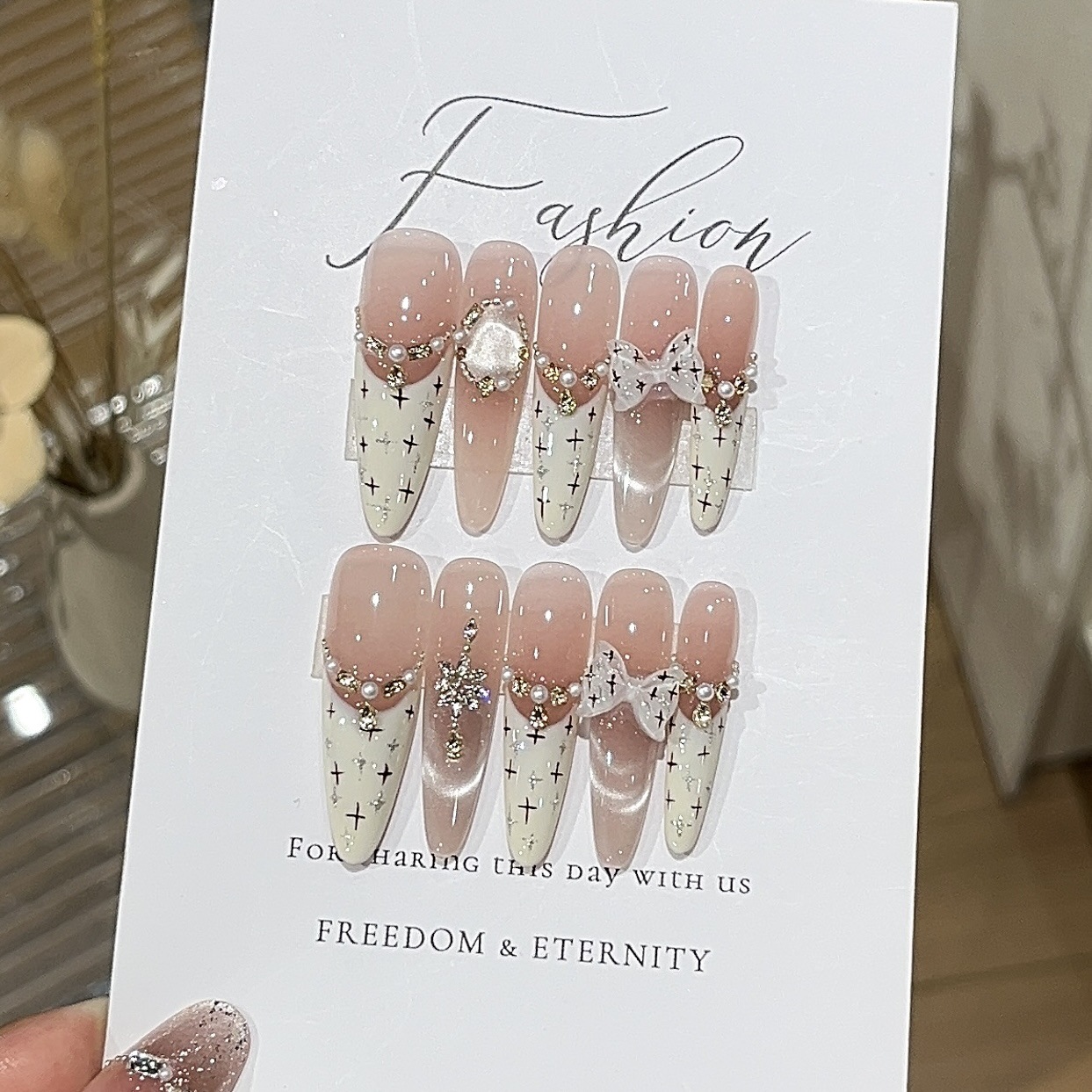一只顾【香香公主】千金风奶油白法式猫眼蝴蝶结锆石贴钻穿戴甲