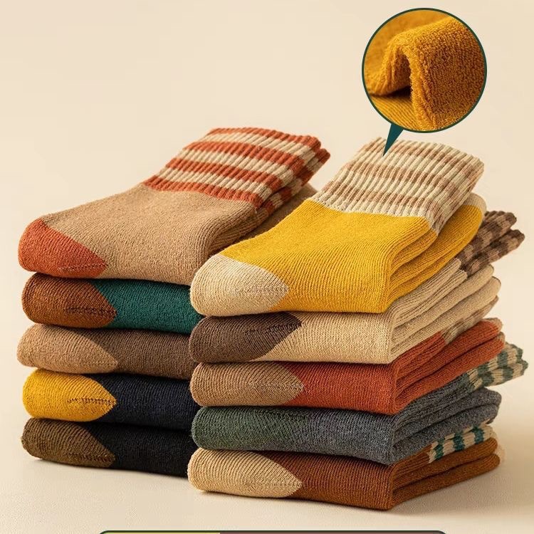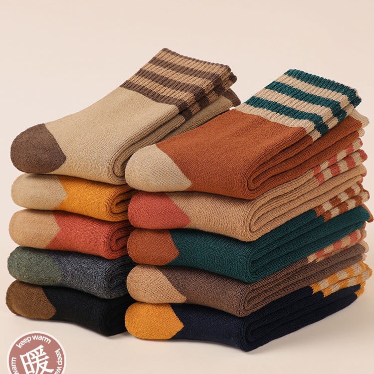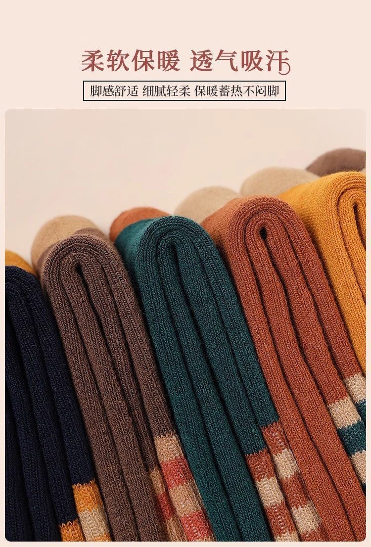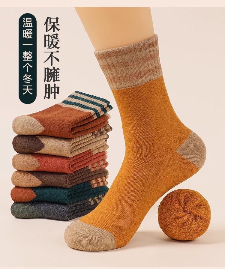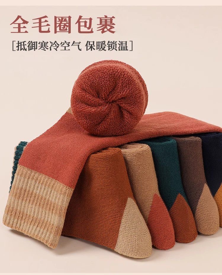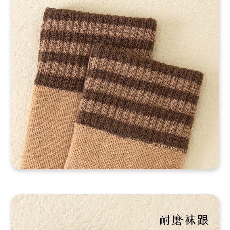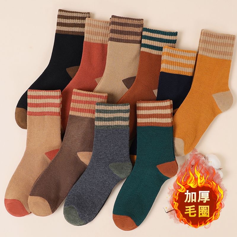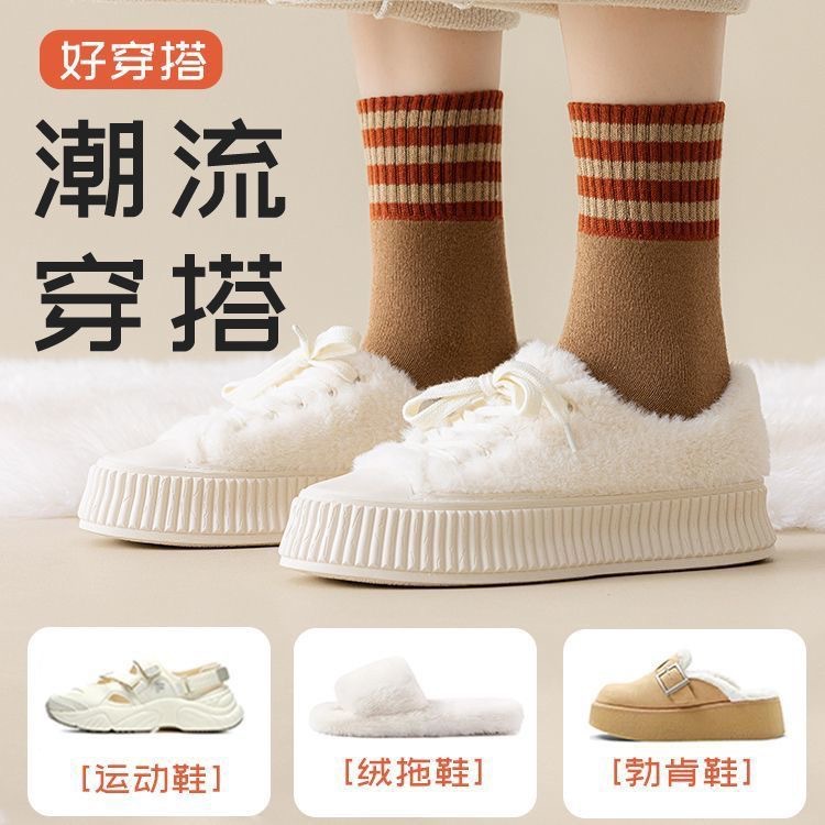 袜子女中筒袜加绒加厚保暖拼色毛圈袜秋冬款休闲罗口横杠款地板袜