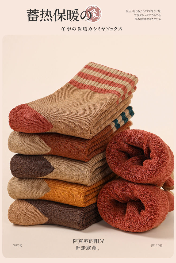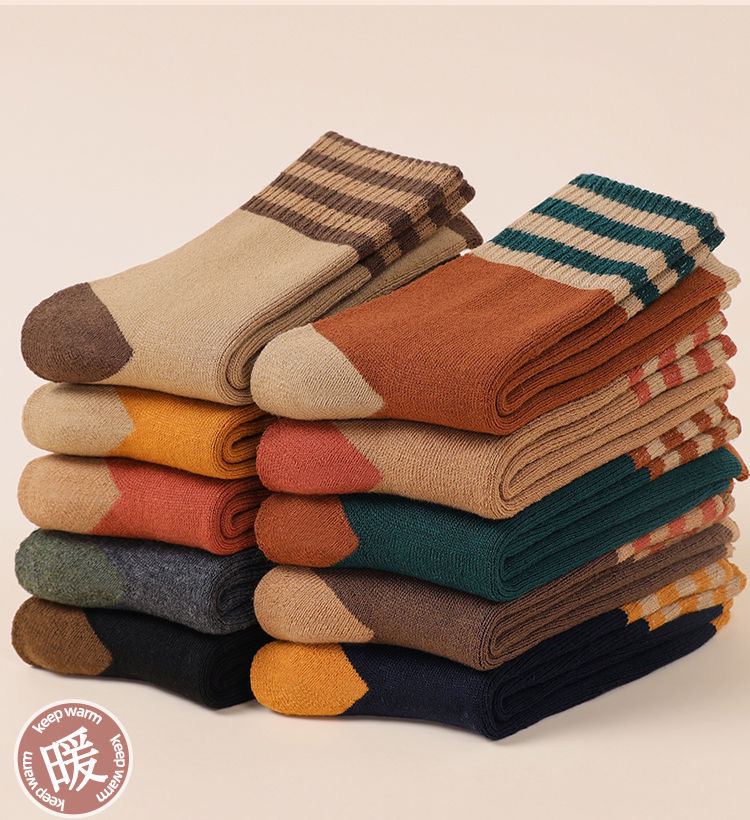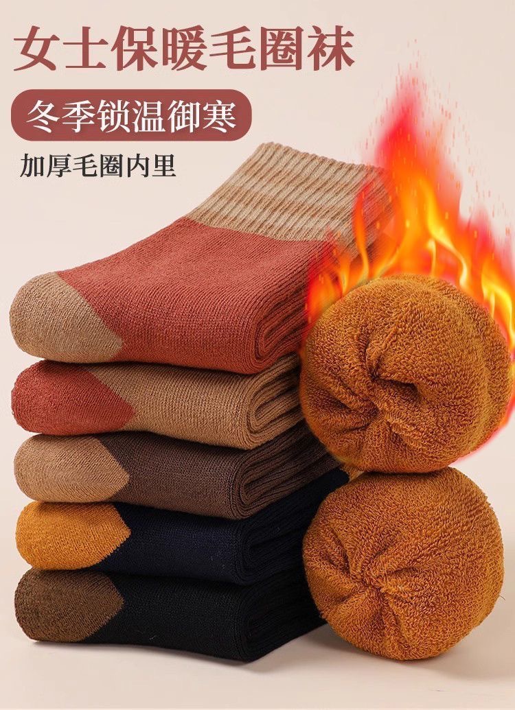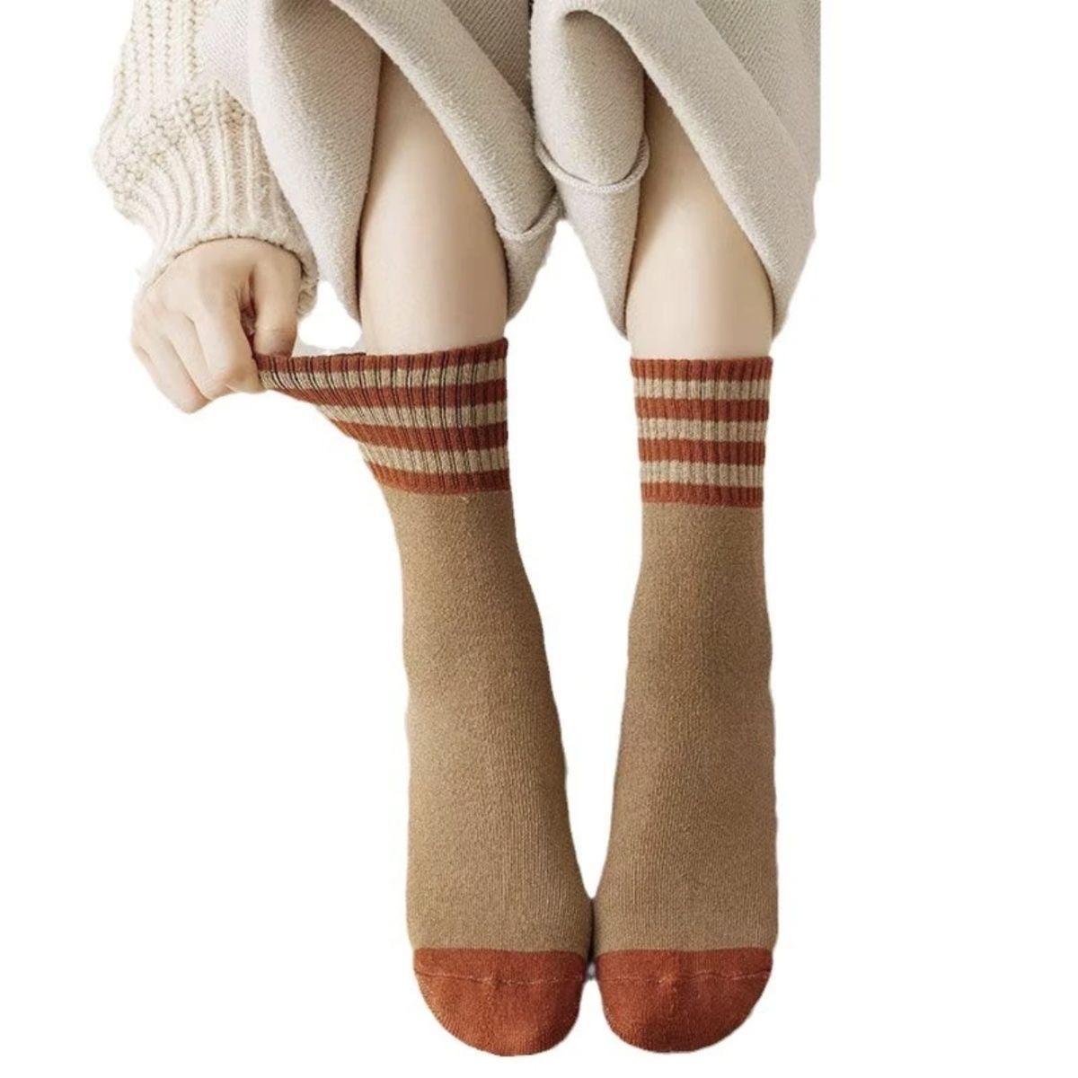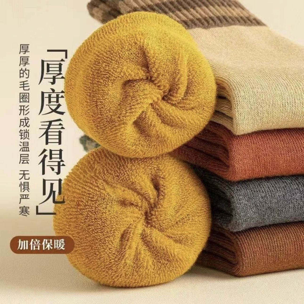 袜子女中筒袜加绒加厚保暖拼色毛圈袜秋冬款休闲罗口横杠款地板袜