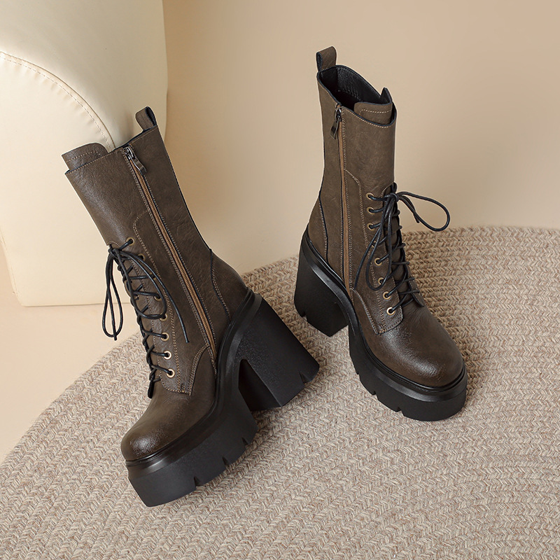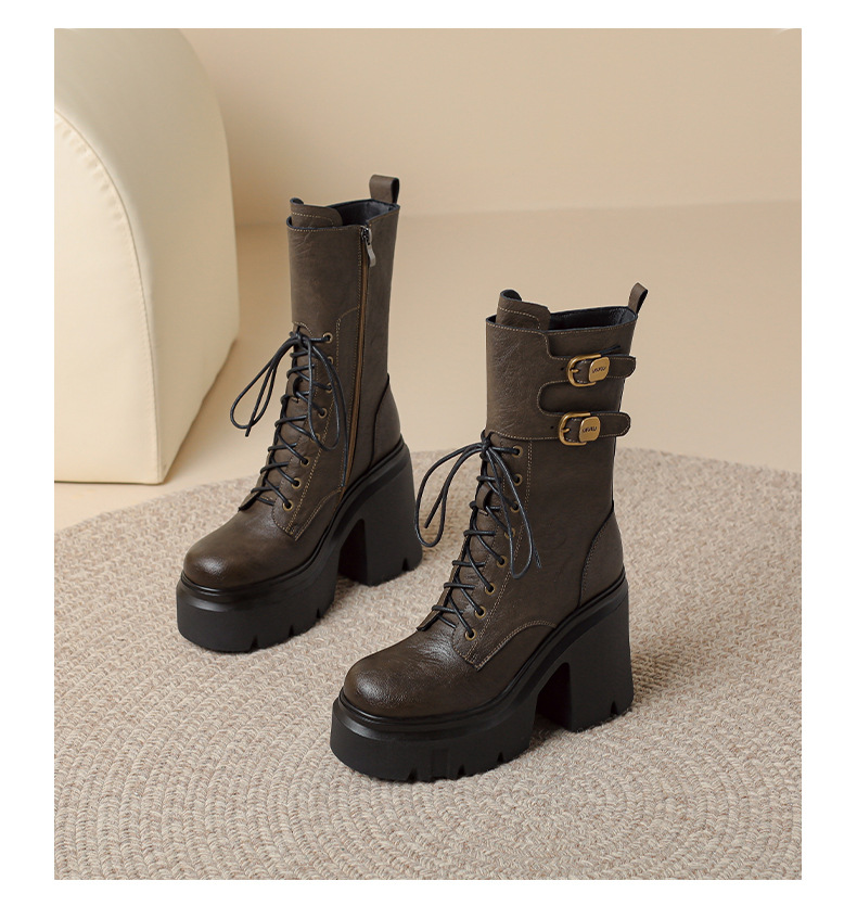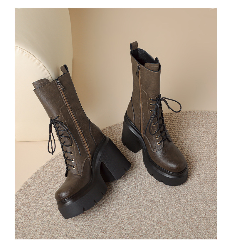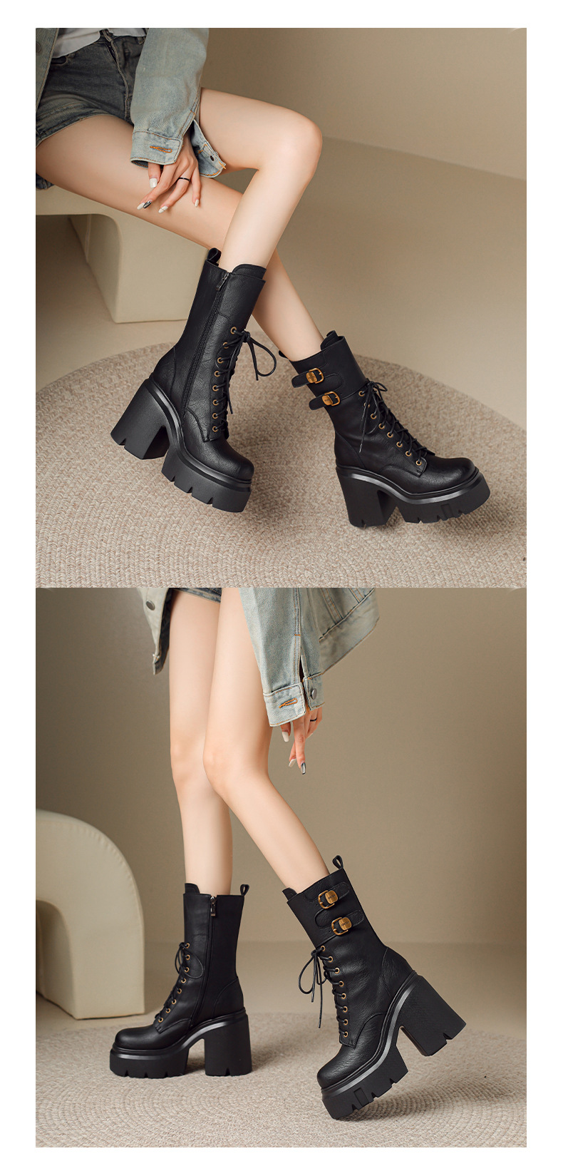 12cm超高跟厚底全真皮中筒靴女秋冬小个子增高短靴潮粗跟马丁靴子