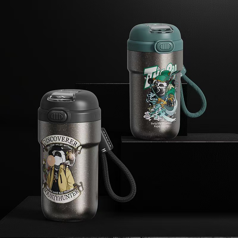 TAI-SU酷潮熊猫纯钛咖啡杯男女生卡通双饮吸管水杯车载保温杯子