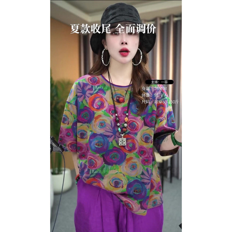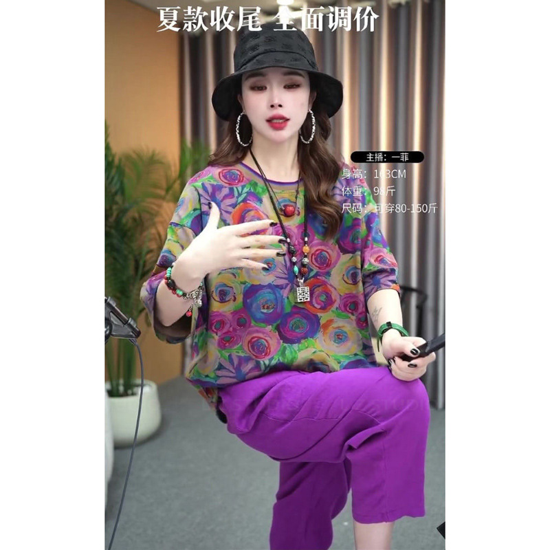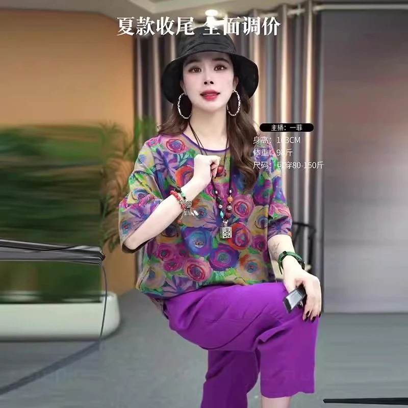 夏季新款女装高端品牌休闲套装紫色小香风印花T恤裤子两件套