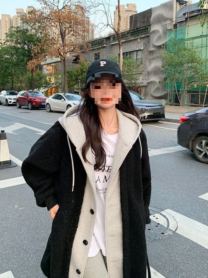 秋冬新款韩系拼接假两件长款外套 连帽羊羔绒宽松加绒美拉徳女装