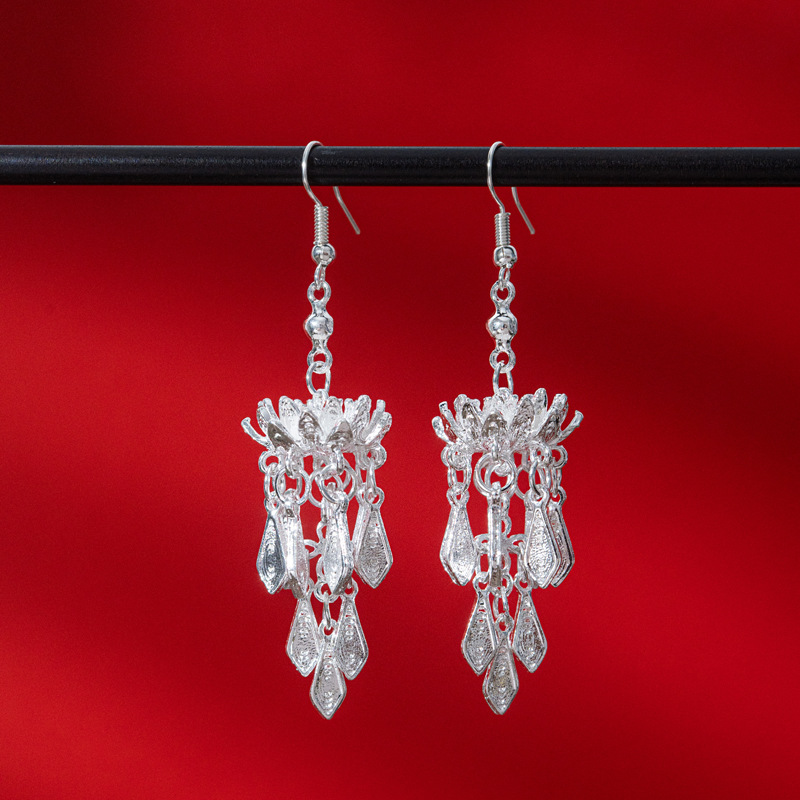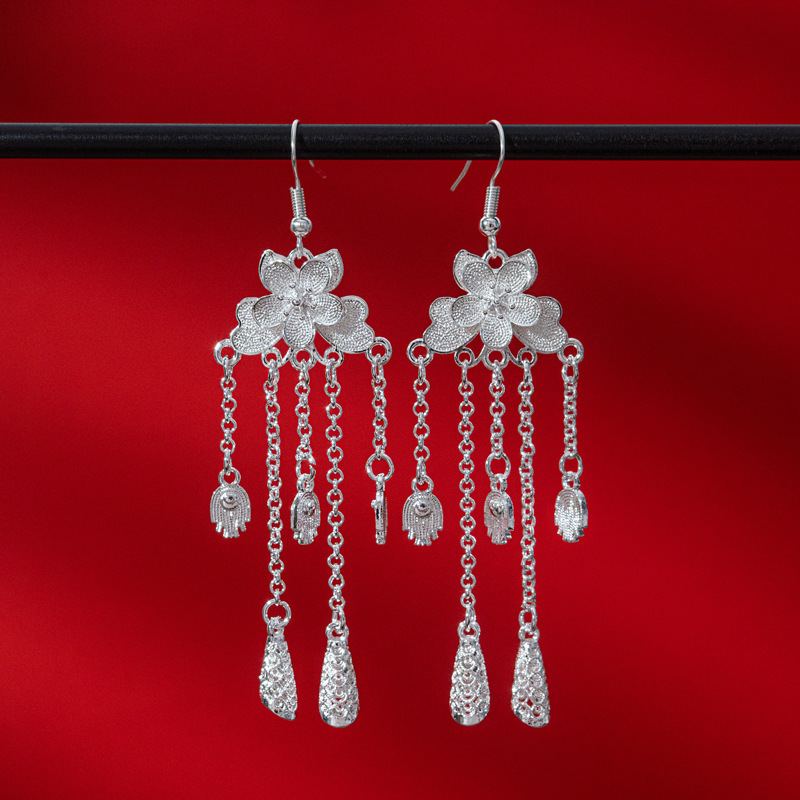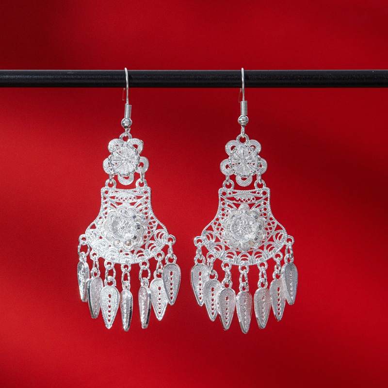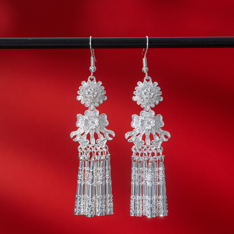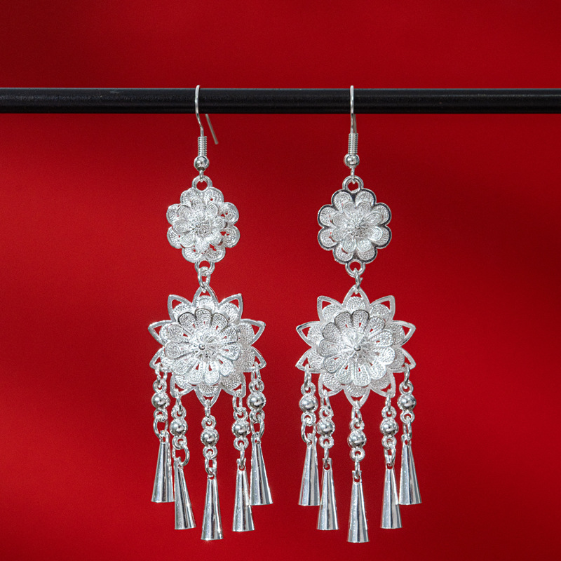 新中式苗银花丝耳环复古国风长款流苏高级感云南贵州民族风女耳饰