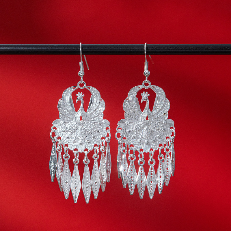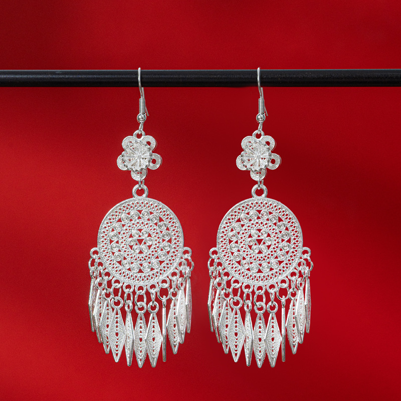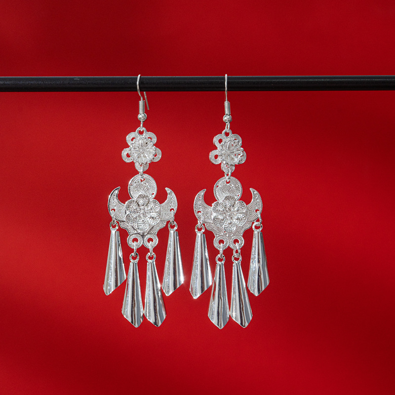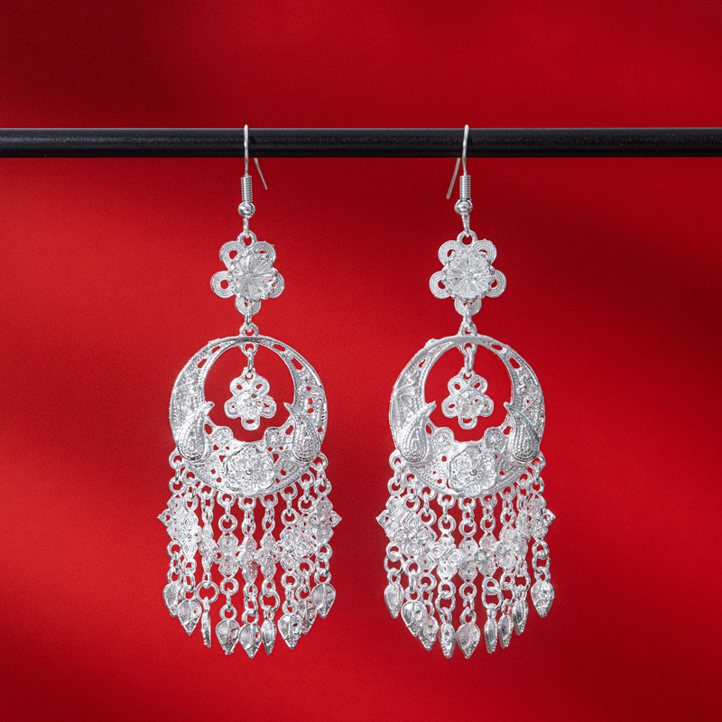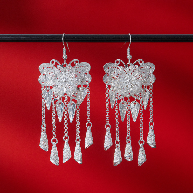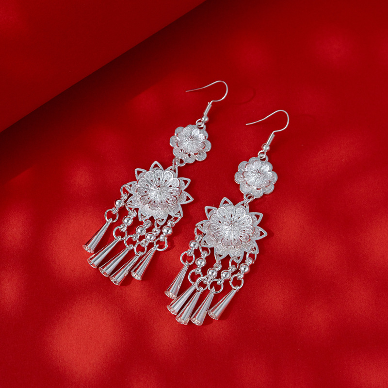 新中式苗银花丝耳环复古国风长款流苏高级感云南贵州民族风女耳饰