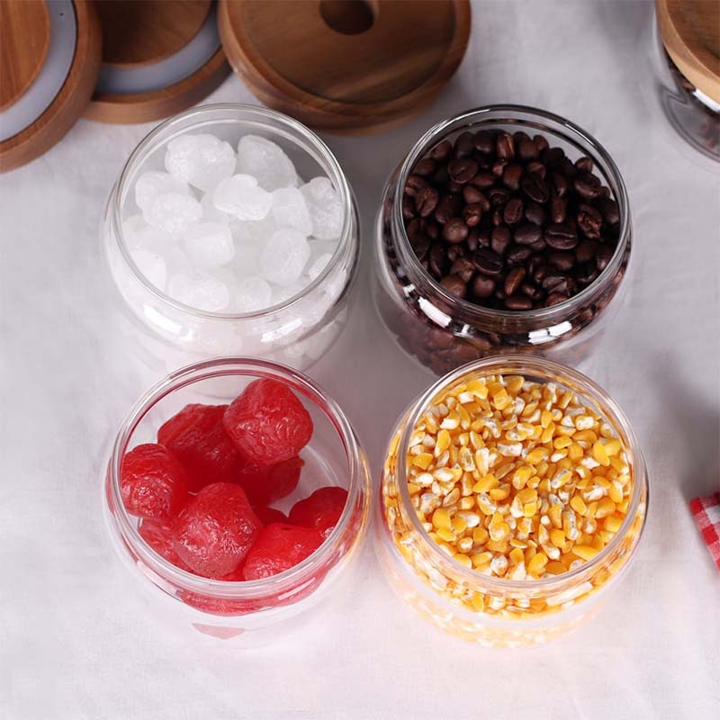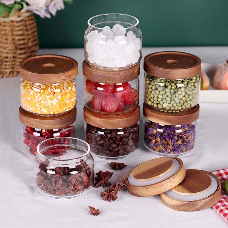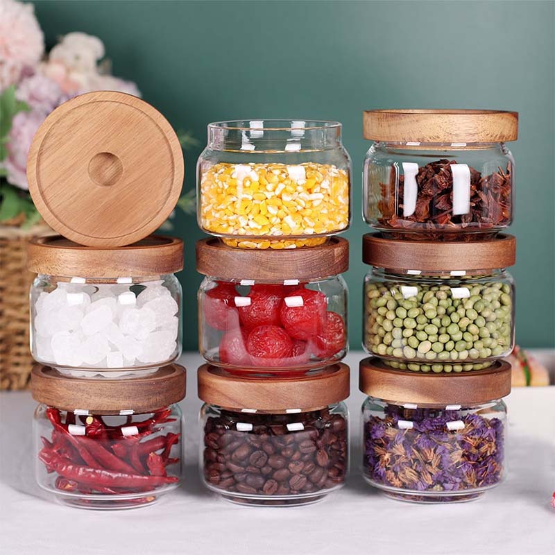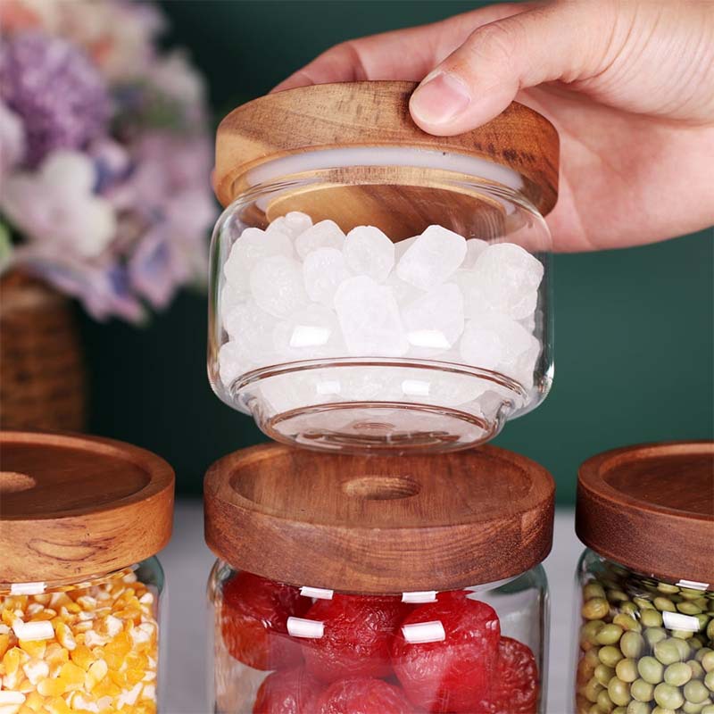 亚马逊透明圆形相思木盖玻璃储物罐厨房收纳水果零食防潮密封罐子