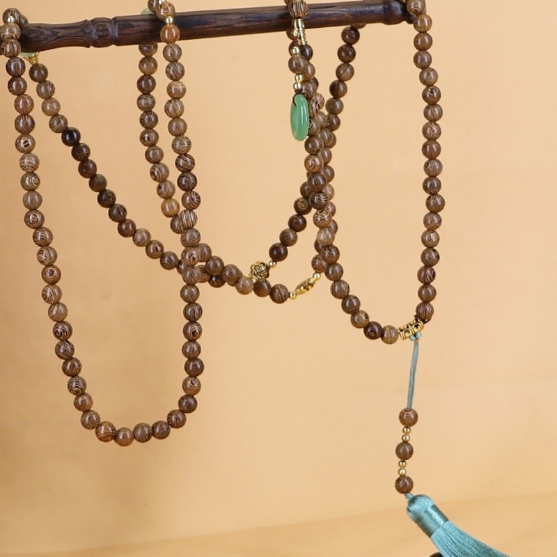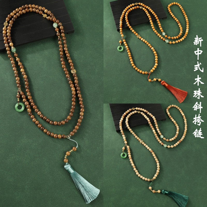 原创新中式国风斜挎链崖柏佛珠流苏项链复古毛衣链背背链旗袍配饰