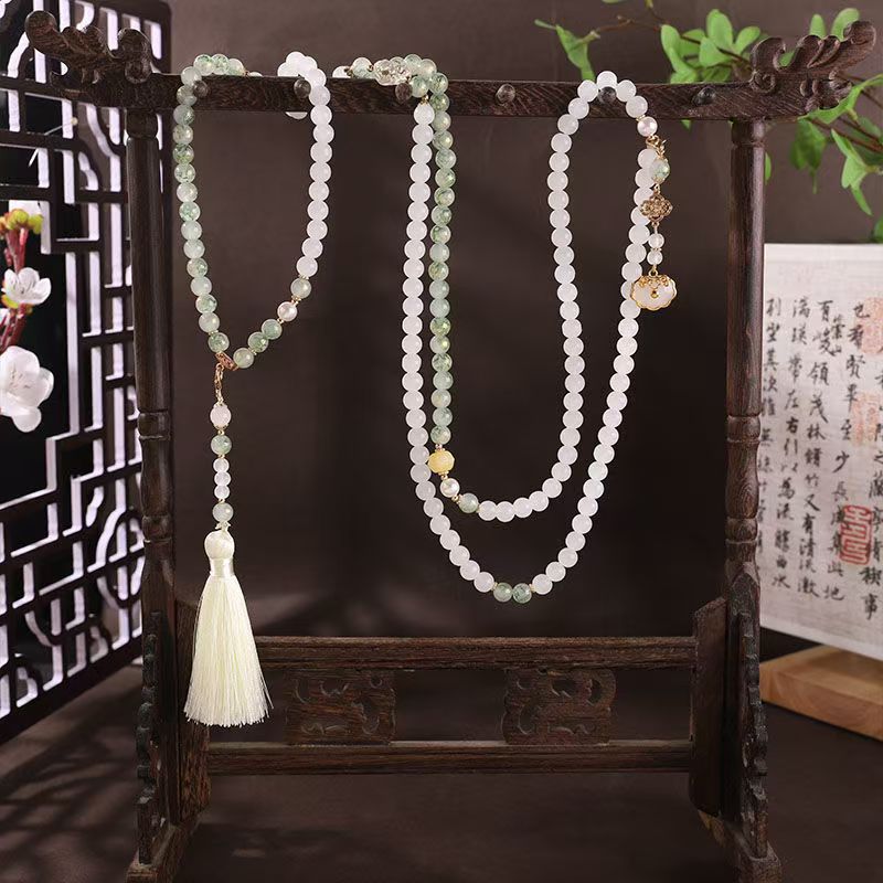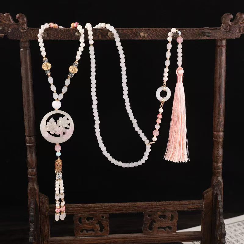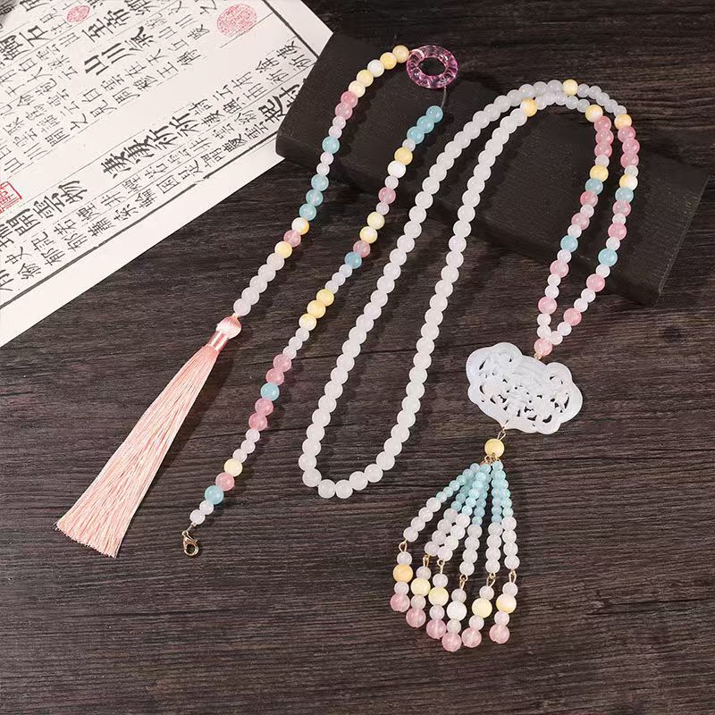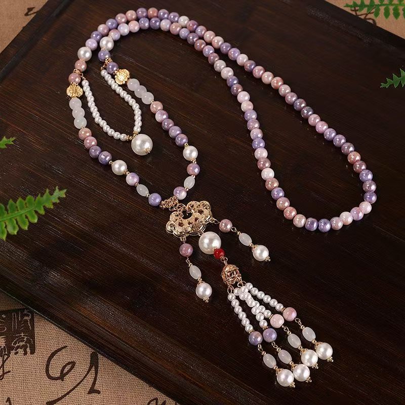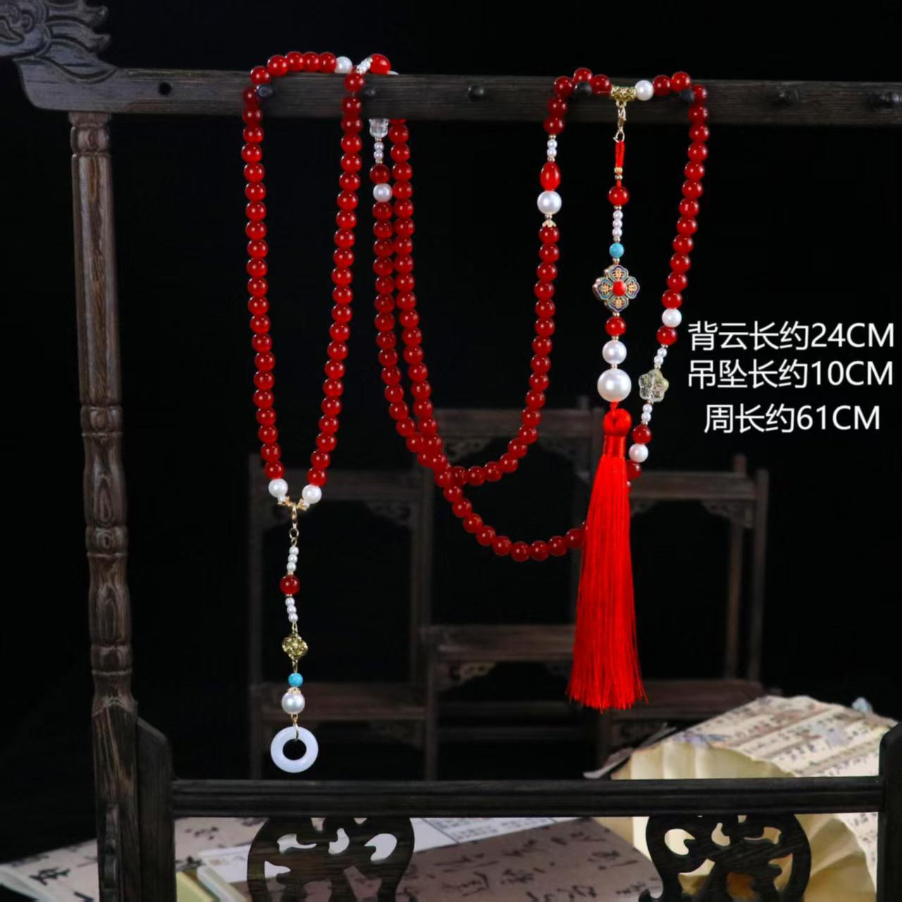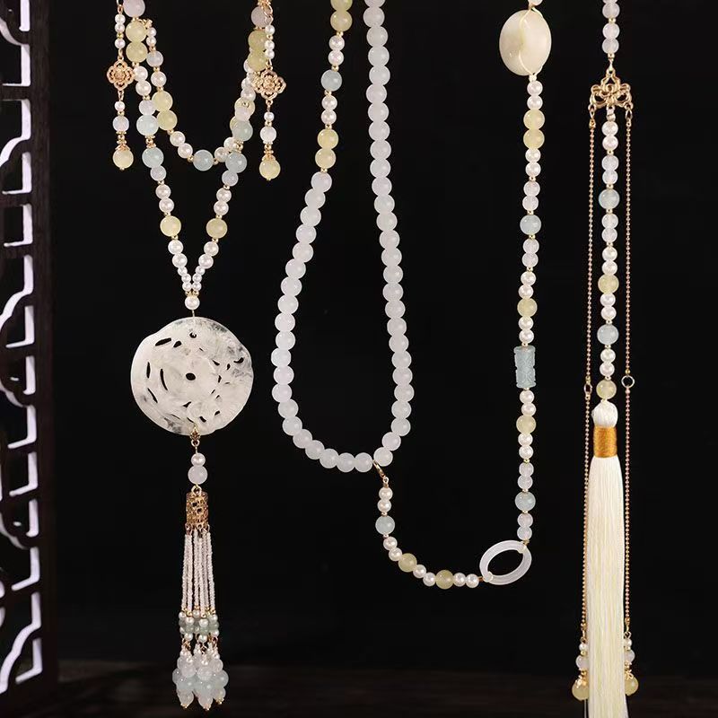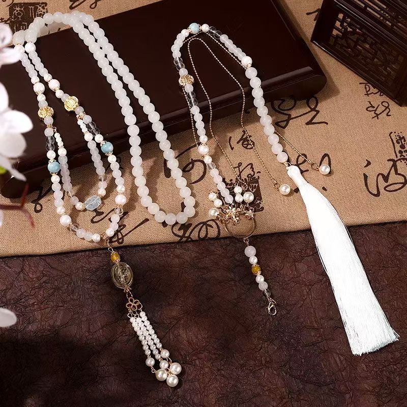中式古法旗袍璎珞项链项圈长流苏背云长款白色贝珠毛衣链新配饰女
