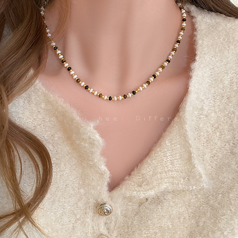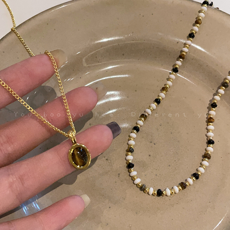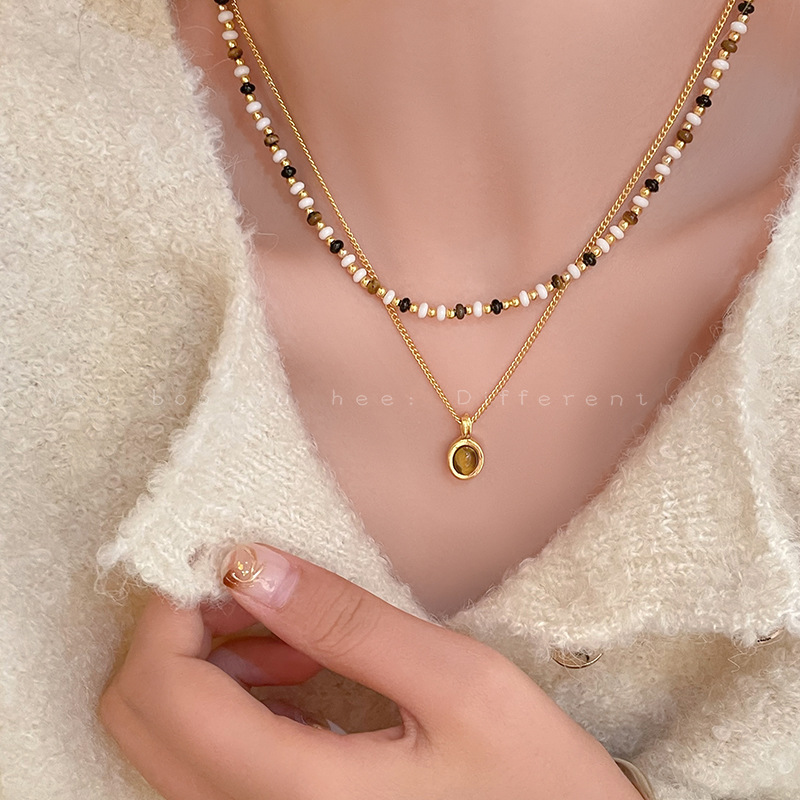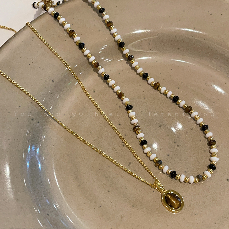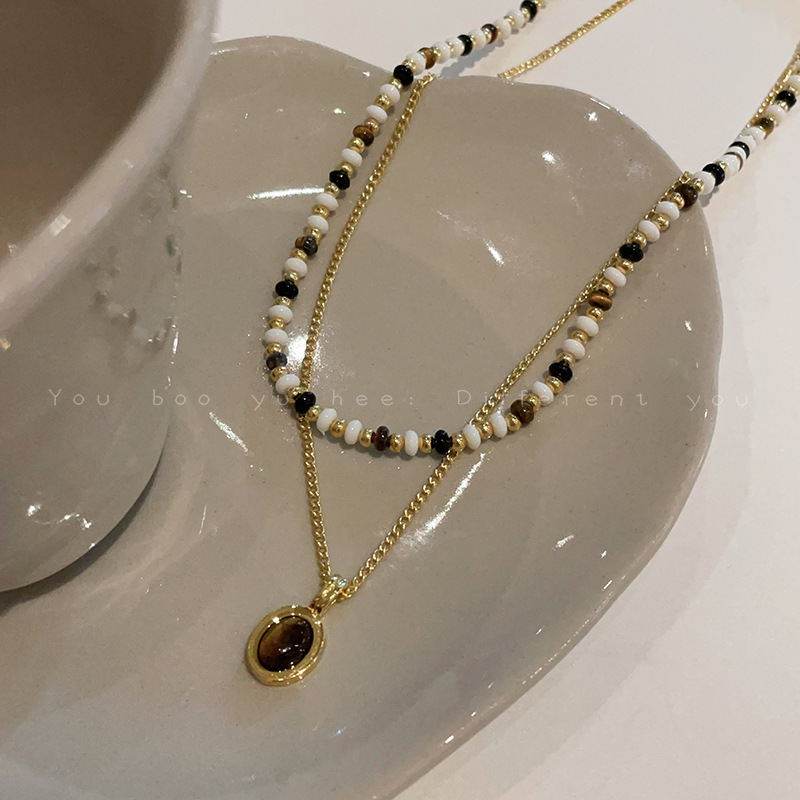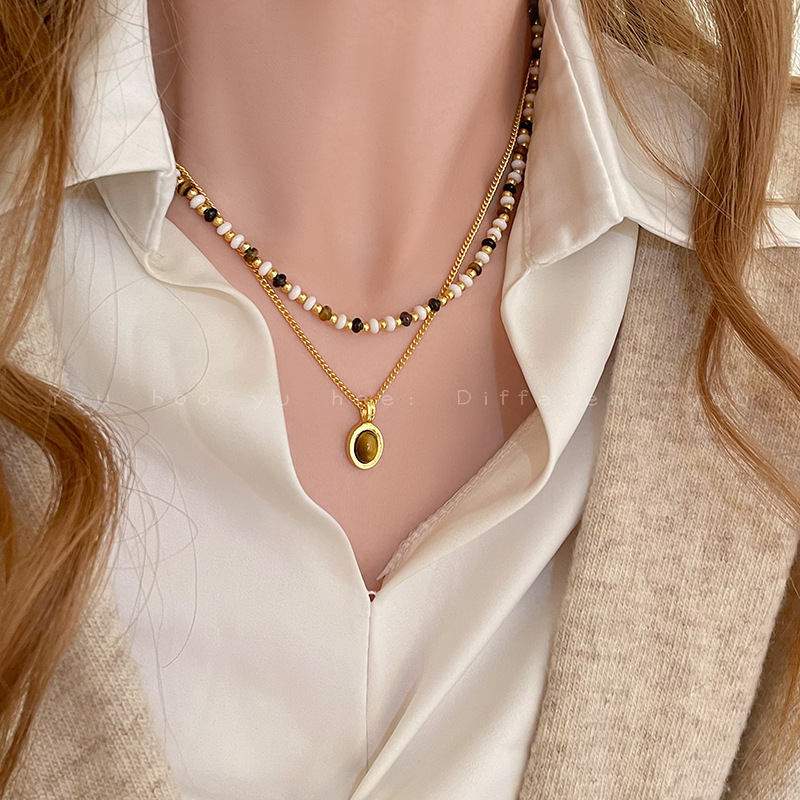 双层叠戴虎睛石吊坠项链女款复古高级感毛衣链2024新款串珠卫衣链