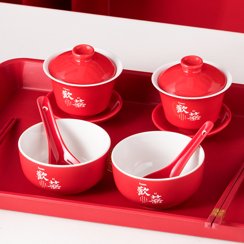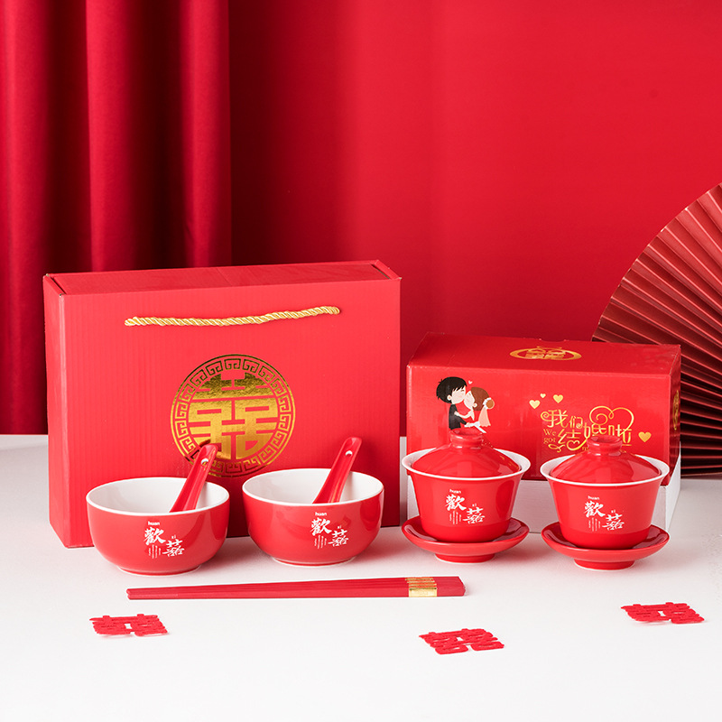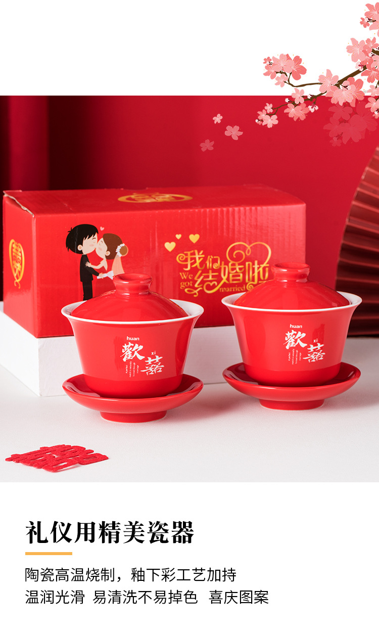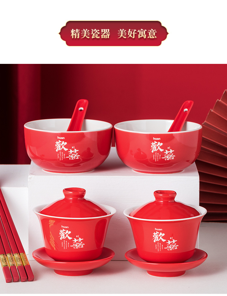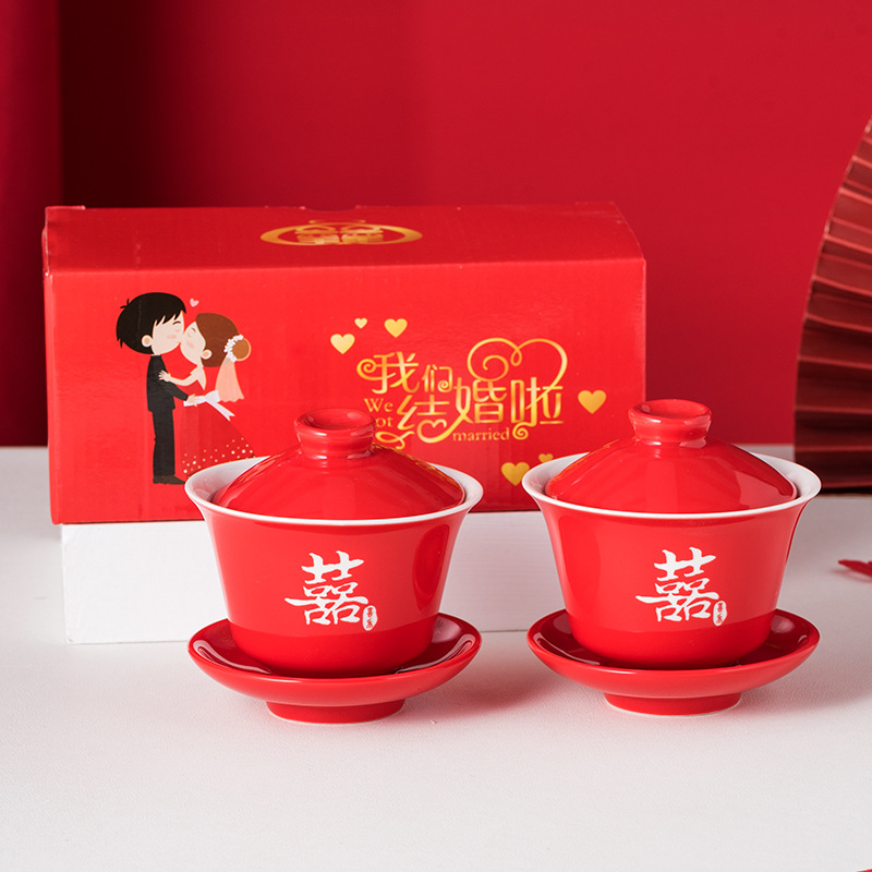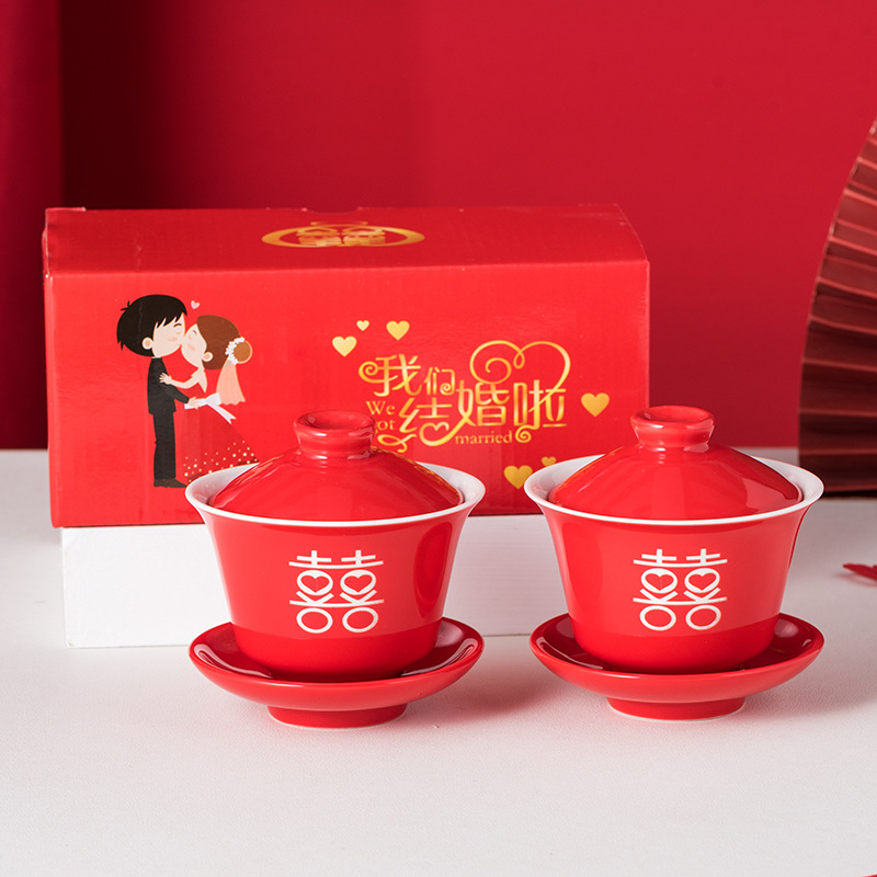 茶杯结婚改口陪嫁喜碗敬酒碗筷茶具套装一对红色喜庆婚礼杯子用品
