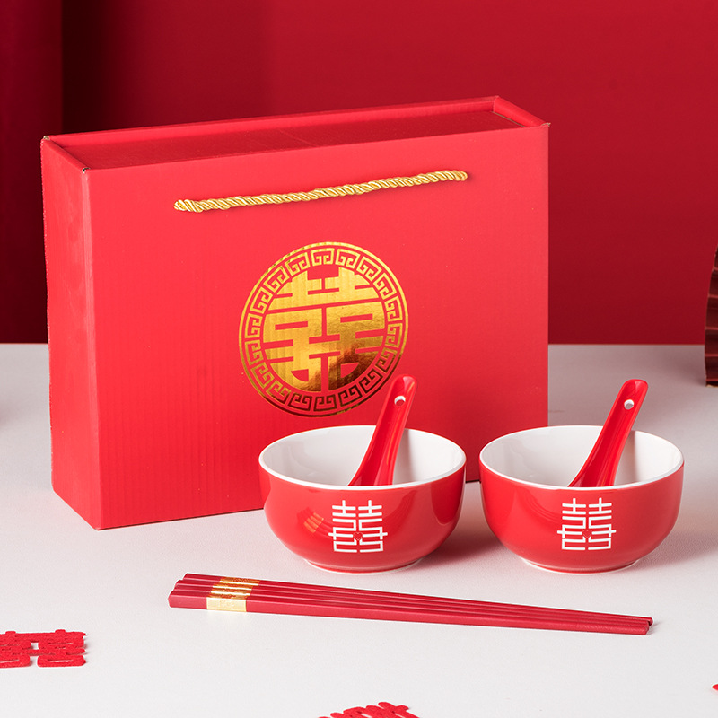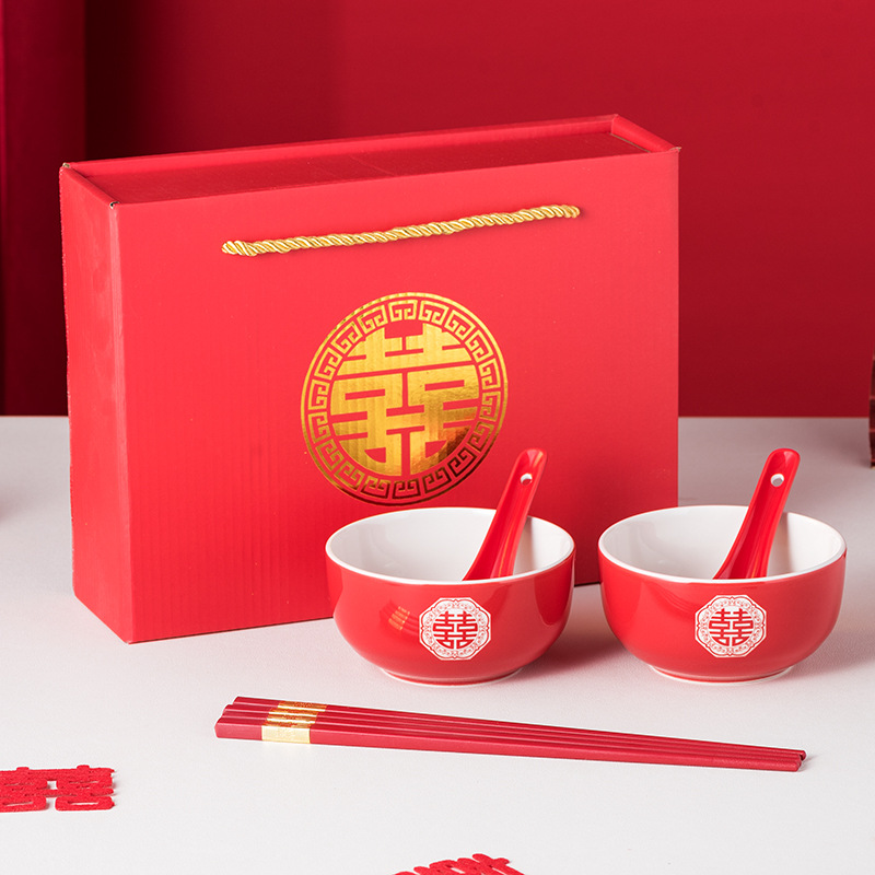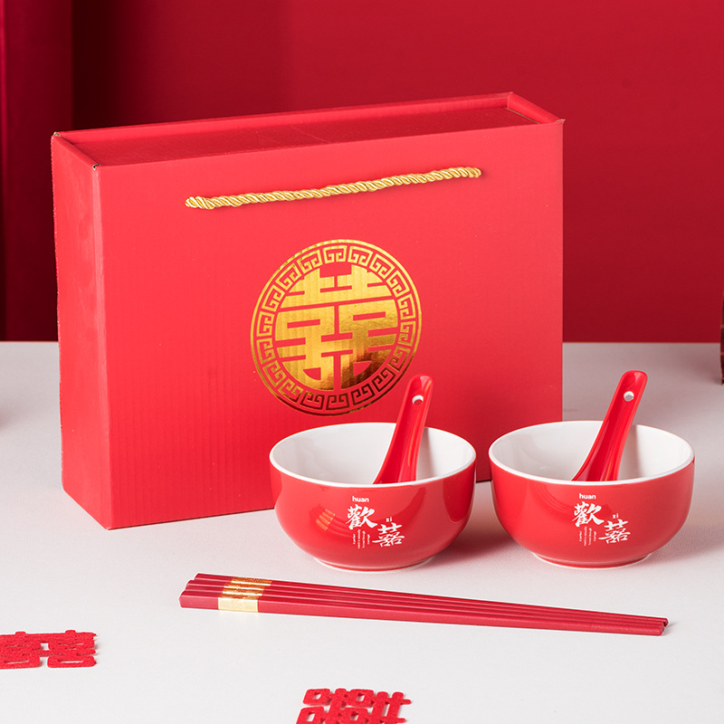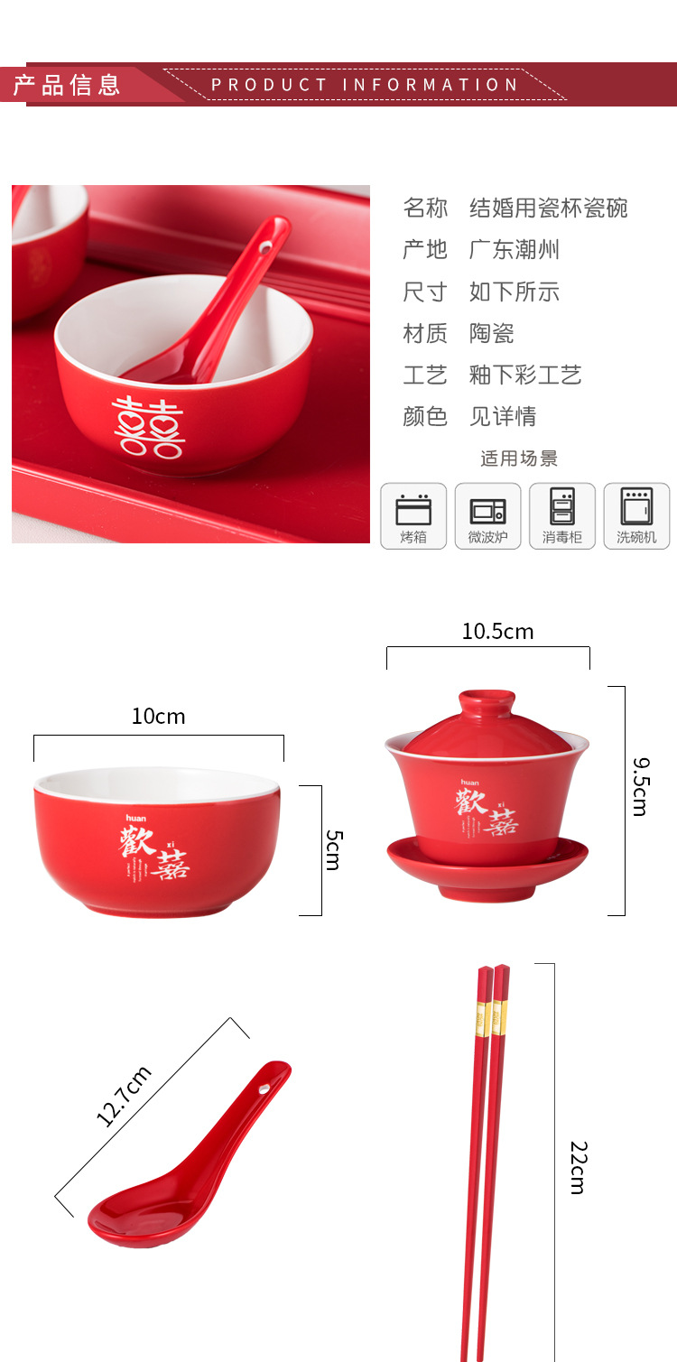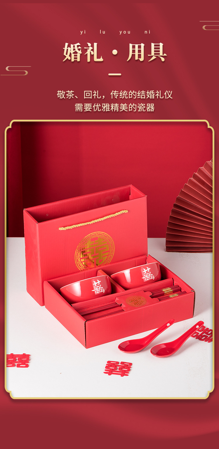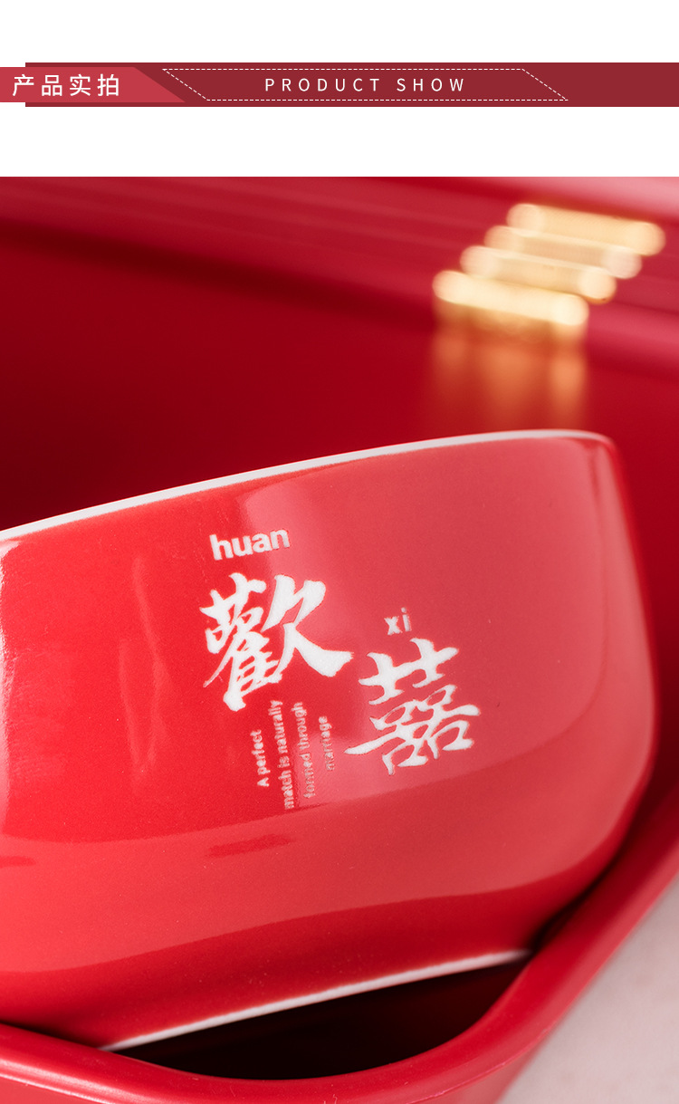 茶杯结婚改口陪嫁喜碗敬酒碗筷茶具套装一对红色喜庆婚礼杯子用品