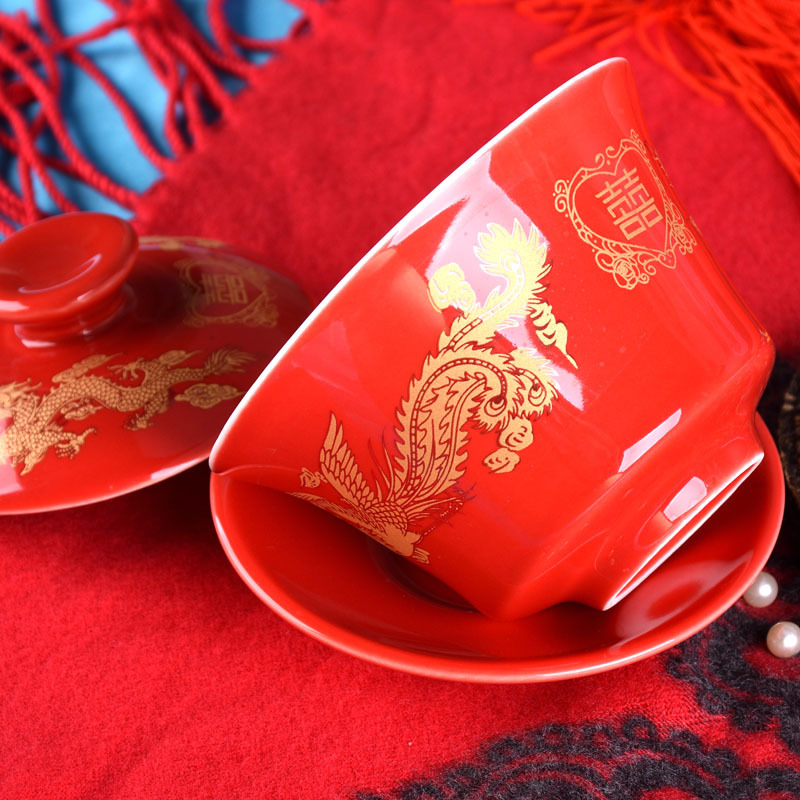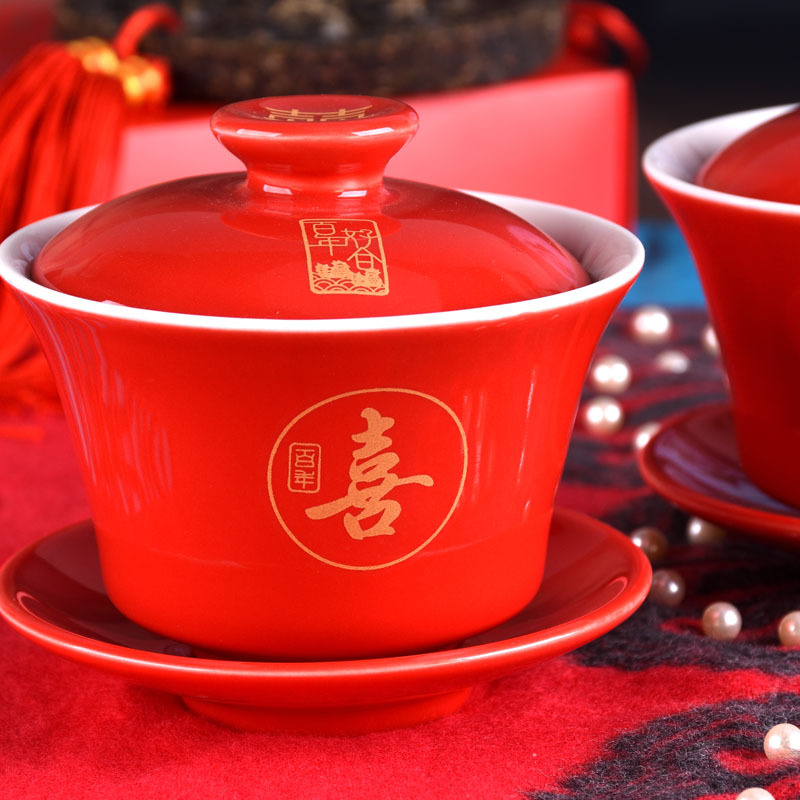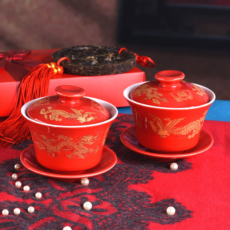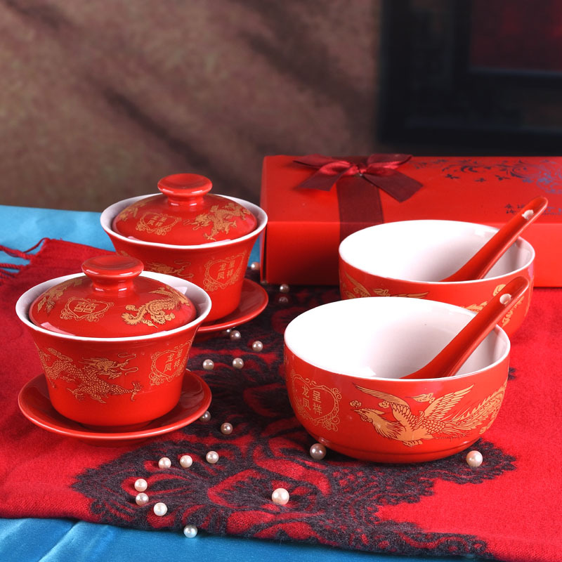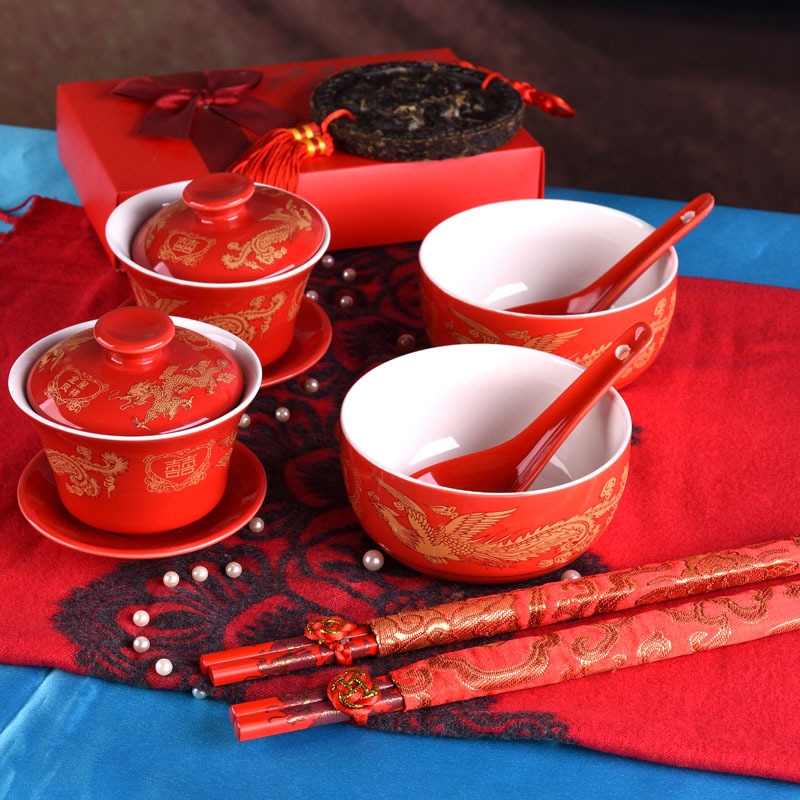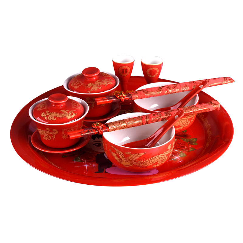 结婚喜庆敬茶杯子陶瓷对碗筷套装婚礼茶具托盘组合批发可加印LOGO