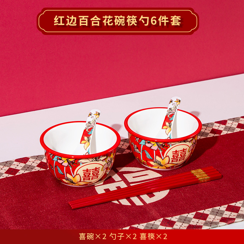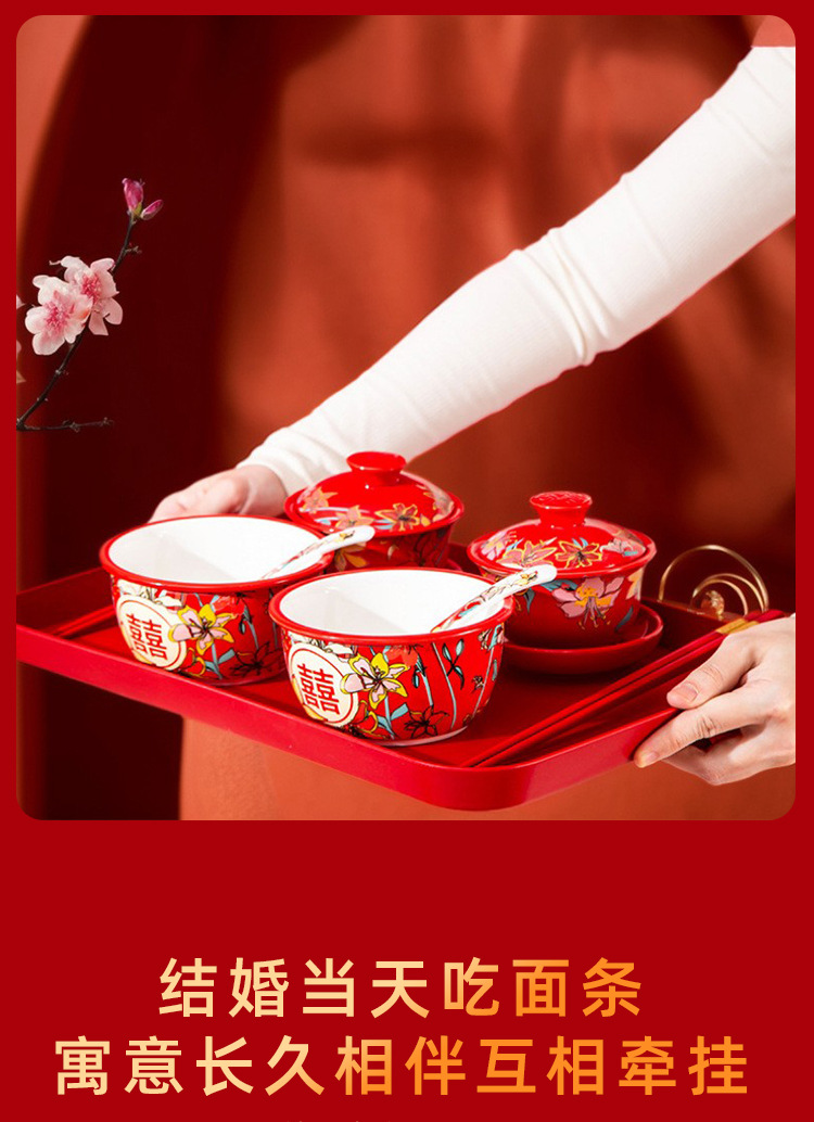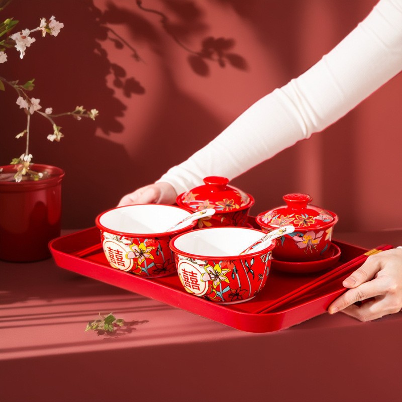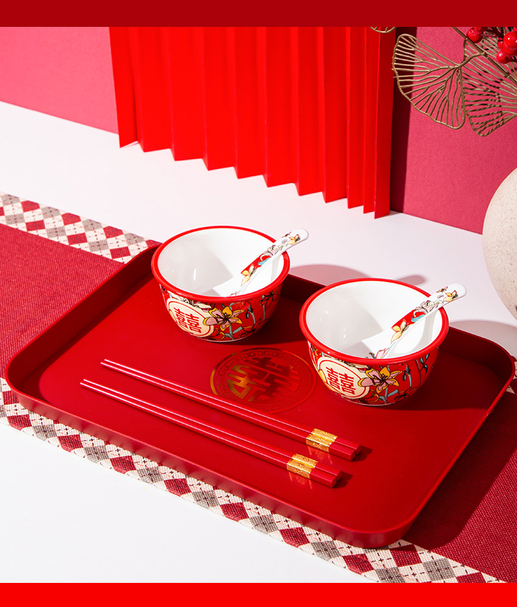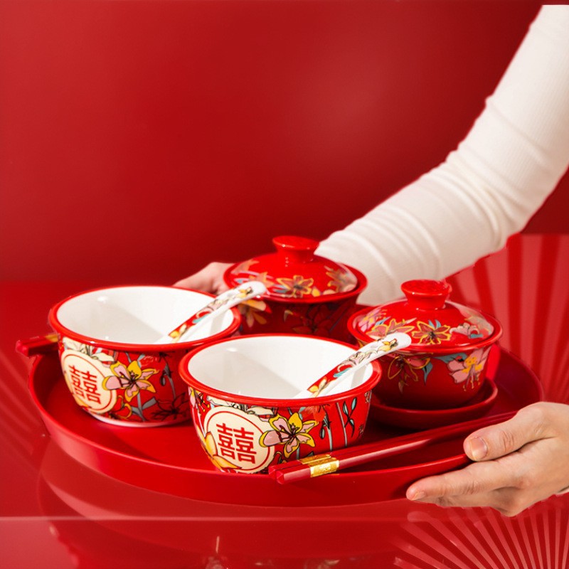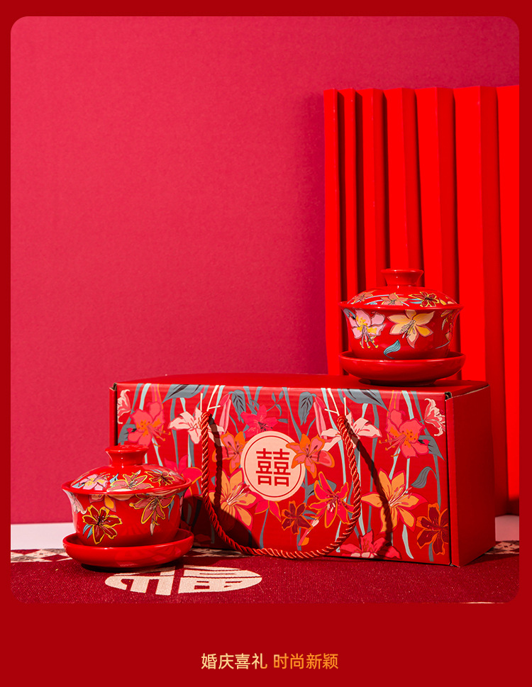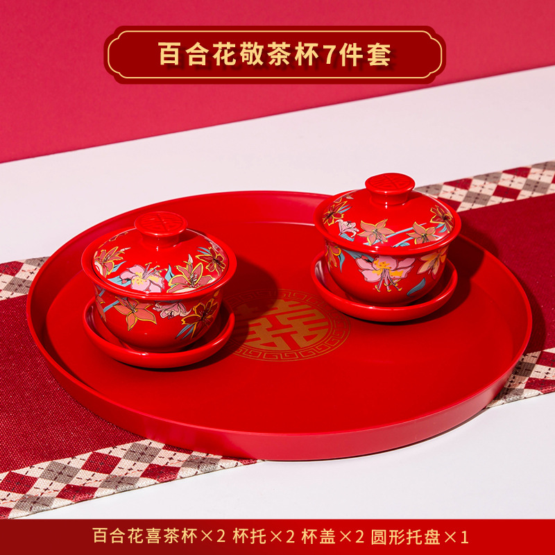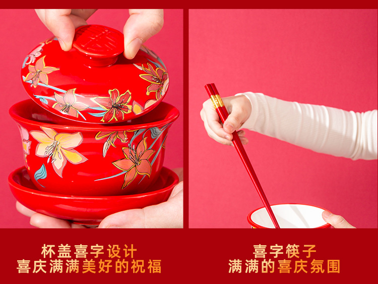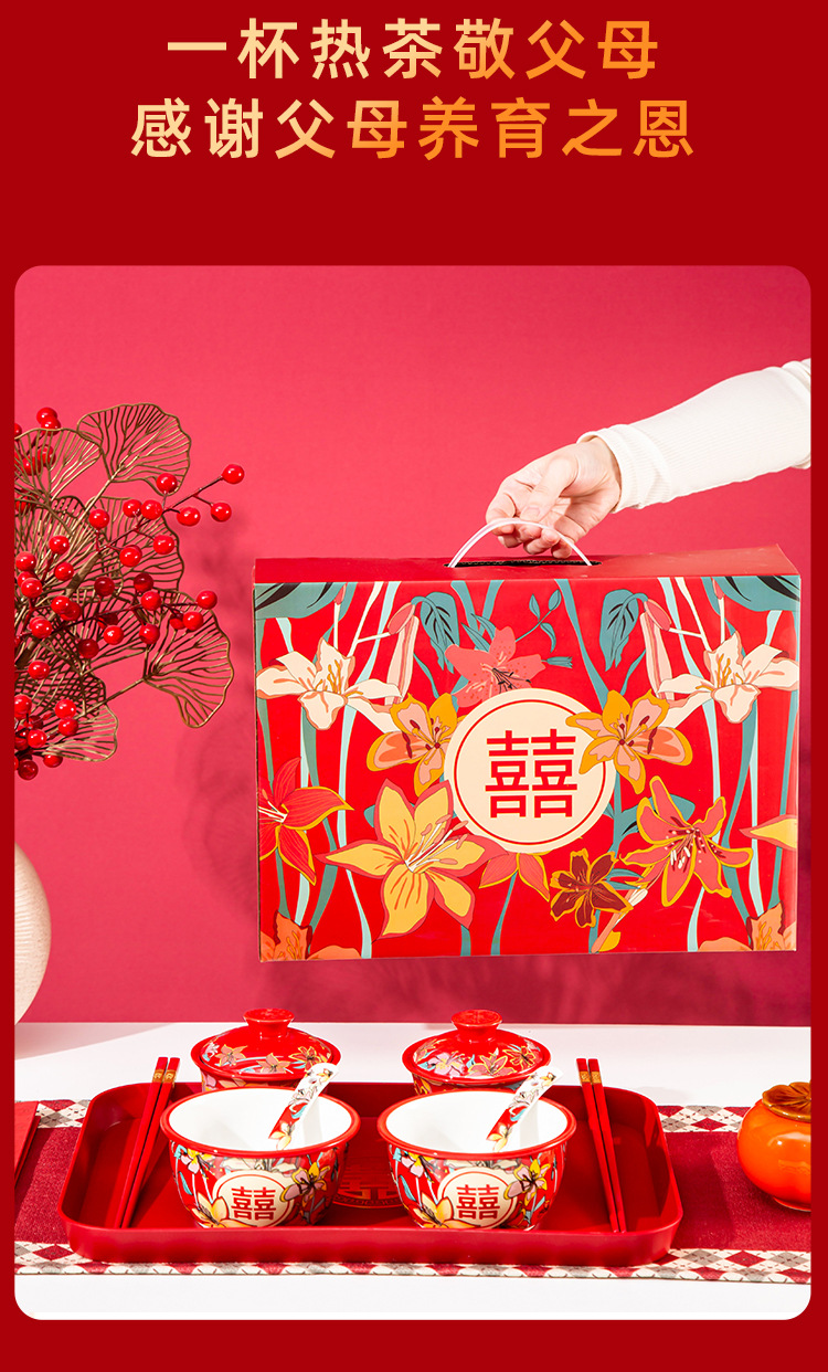 婚庆陶瓷餐具结婚用品敬茶杯新人改口一对红色茶具喜碗筷茶杯套装