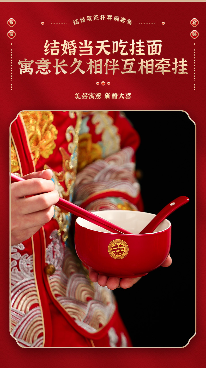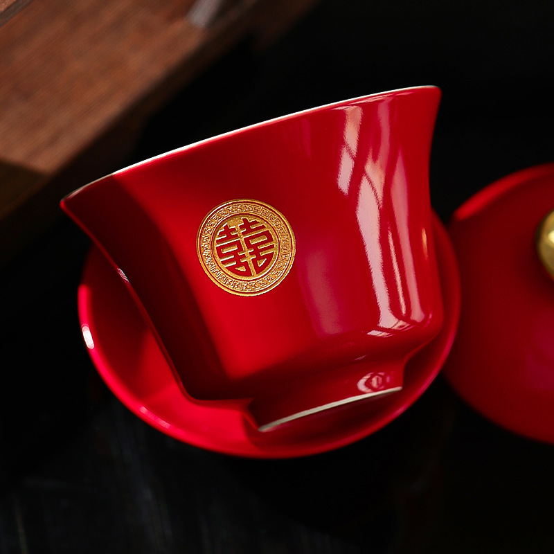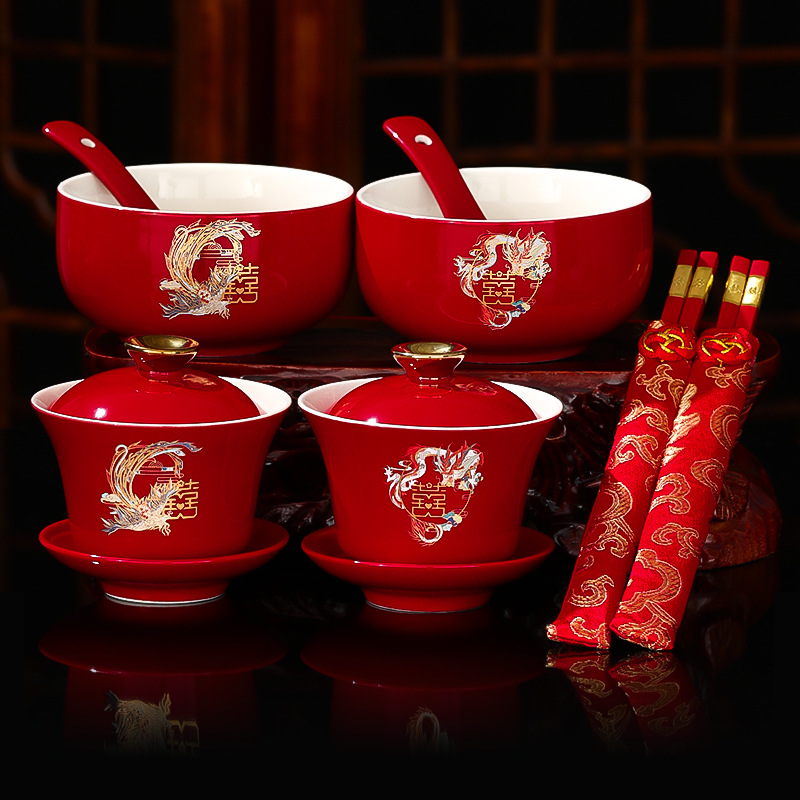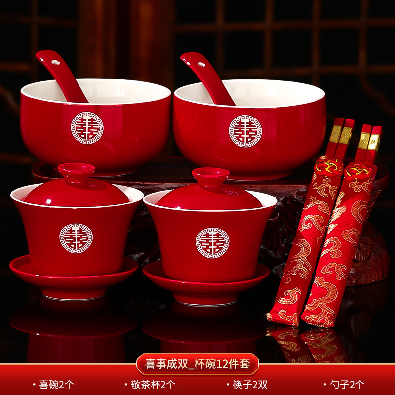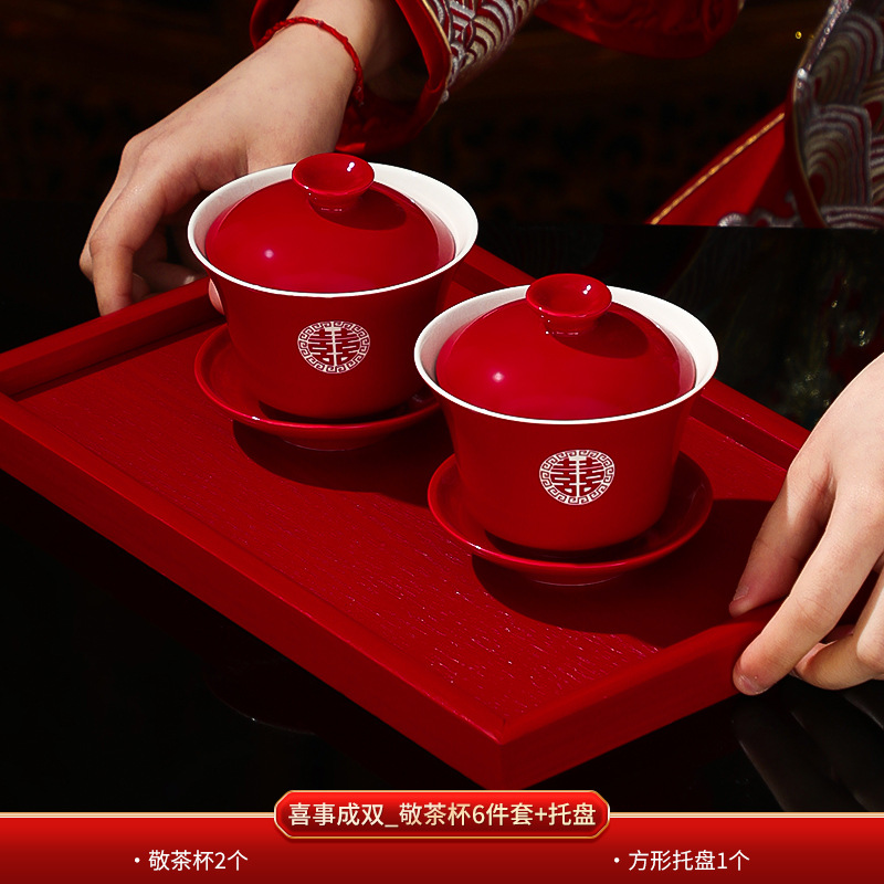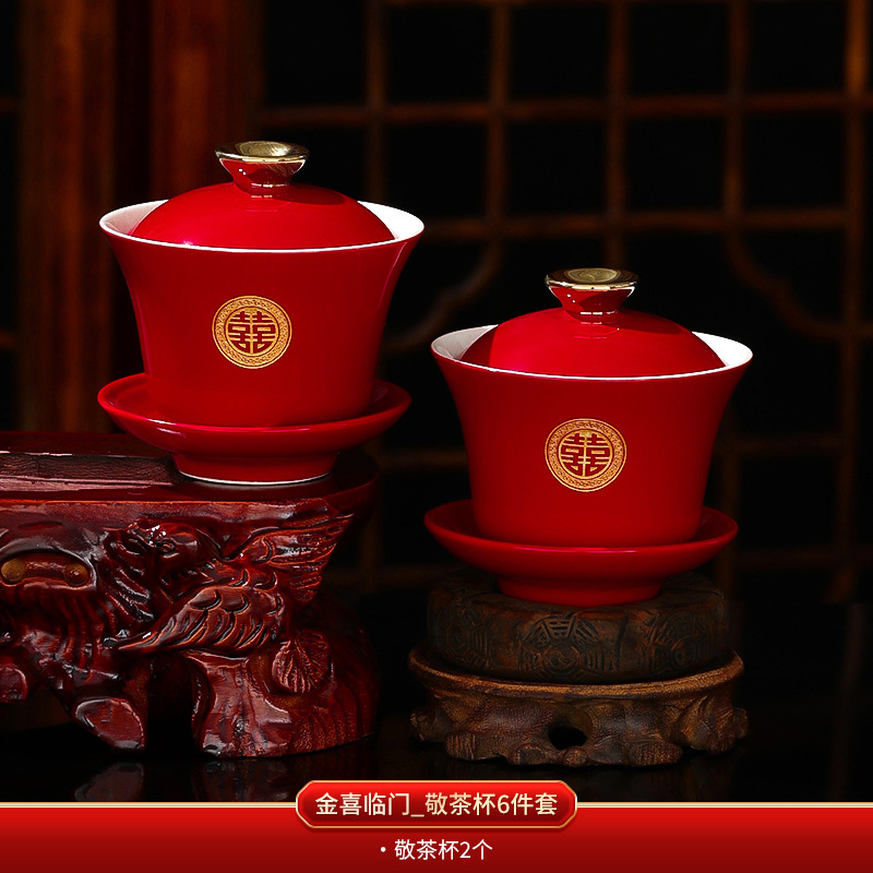 改口敬茶杯结婚套装一对盖碗筷红色喜庆喜碗陪嫁茶具婚礼敬酒杯子