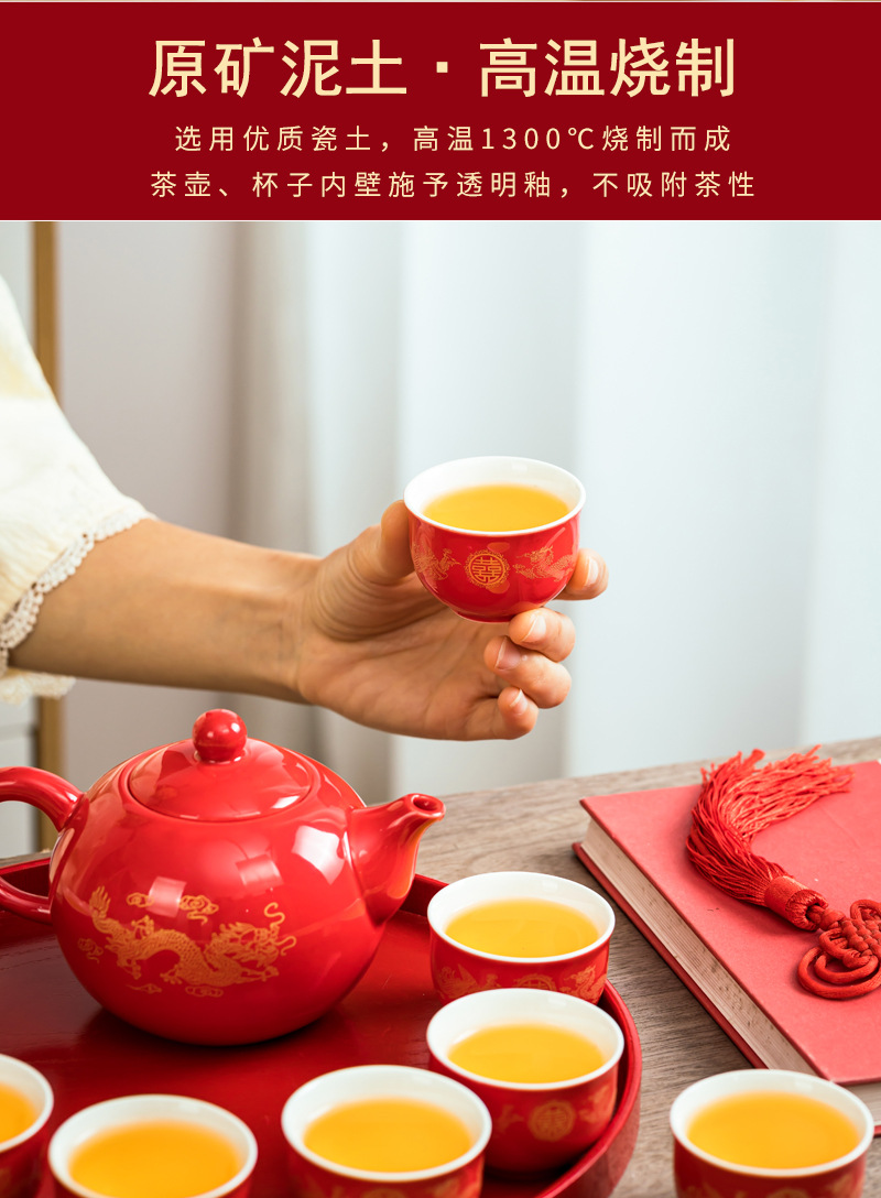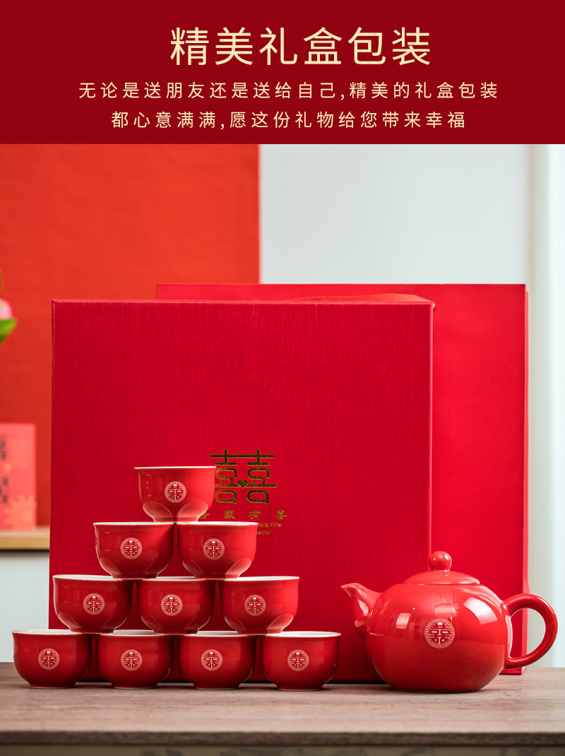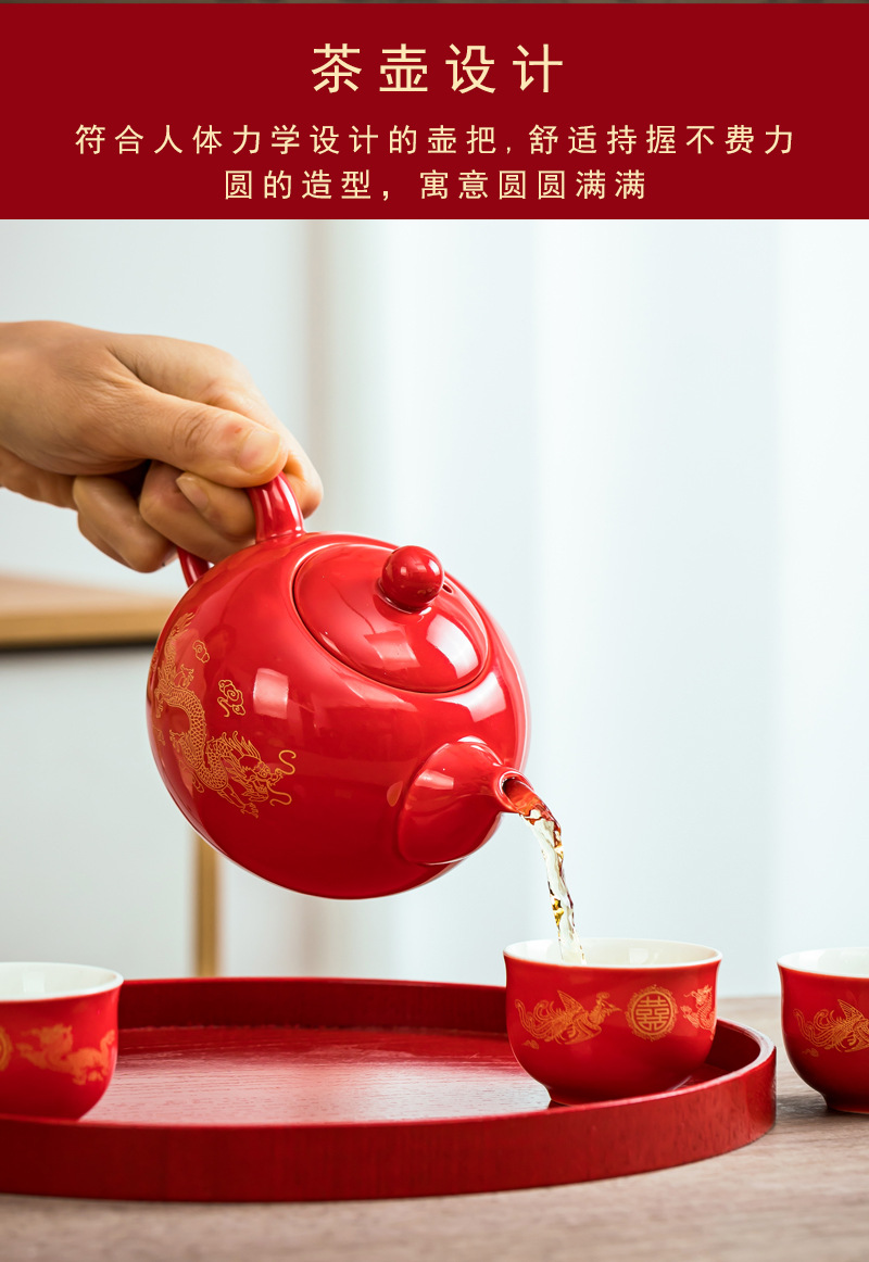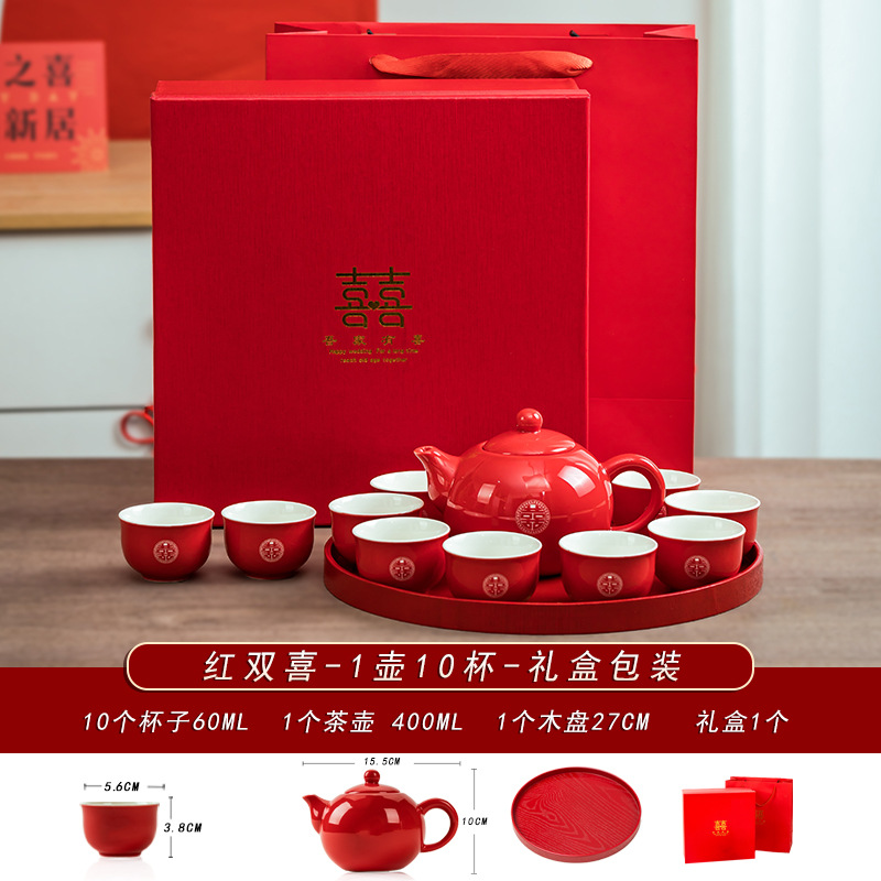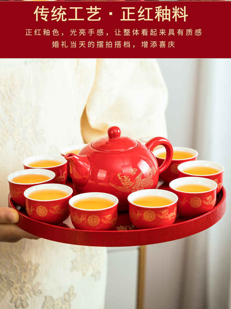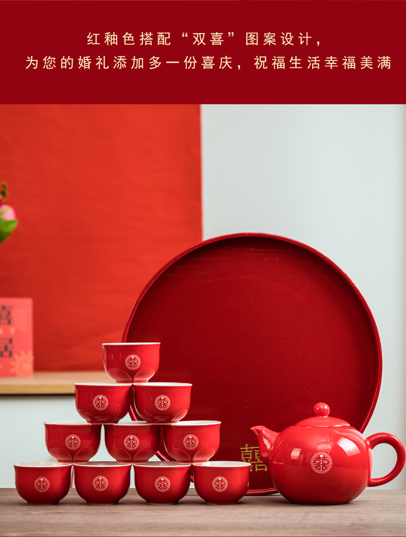 结婚茶具套装双喜壶组合婚礼敬茶杯红色陶瓷婚庆礼品托盘改口茶杯