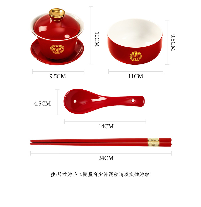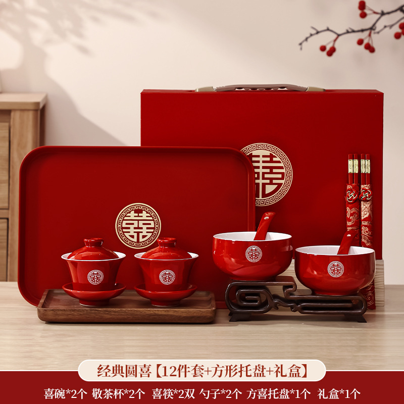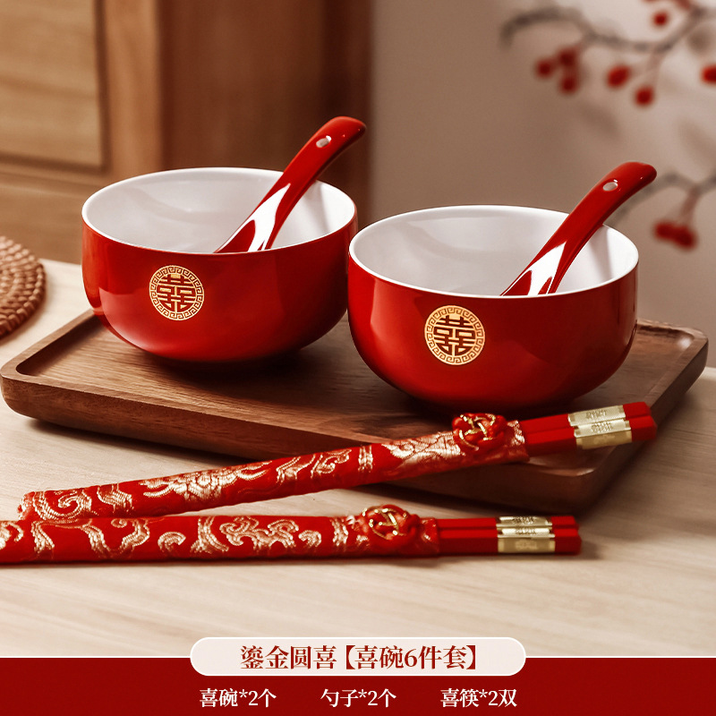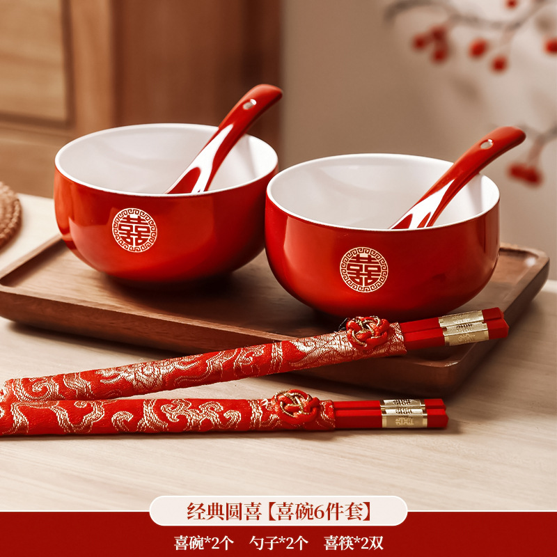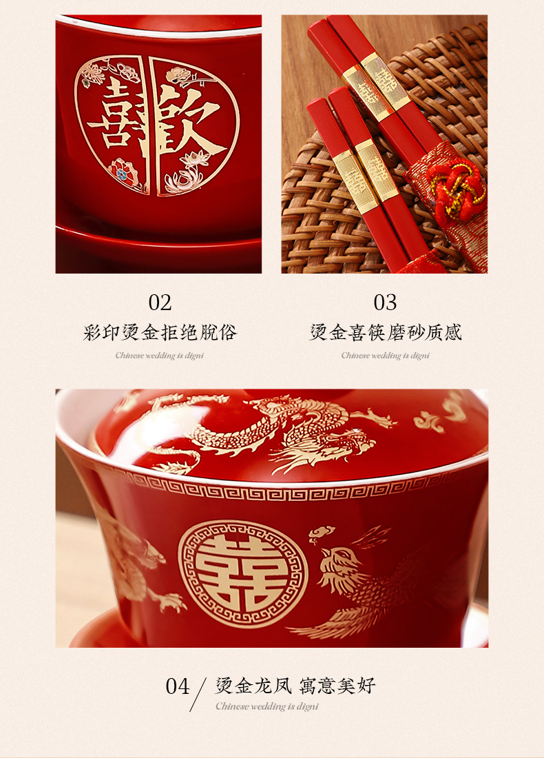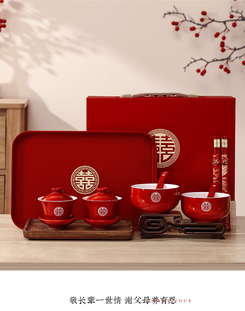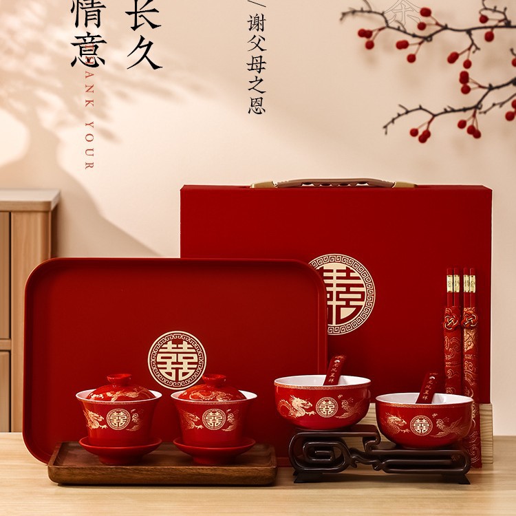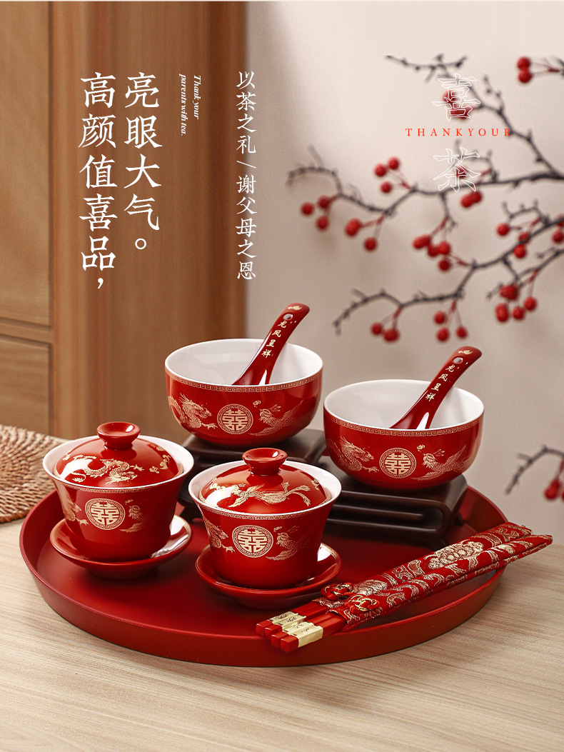 结婚碗筷套装喜碗改口敬酒茶具敬茶杯一对碗红色婚礼陪嫁用品大全
