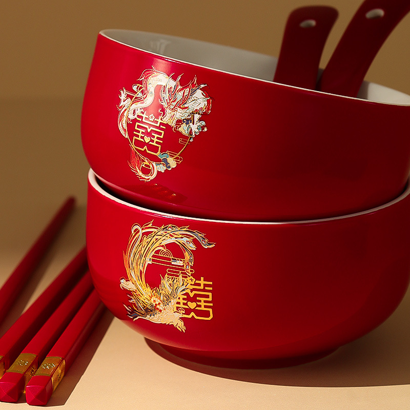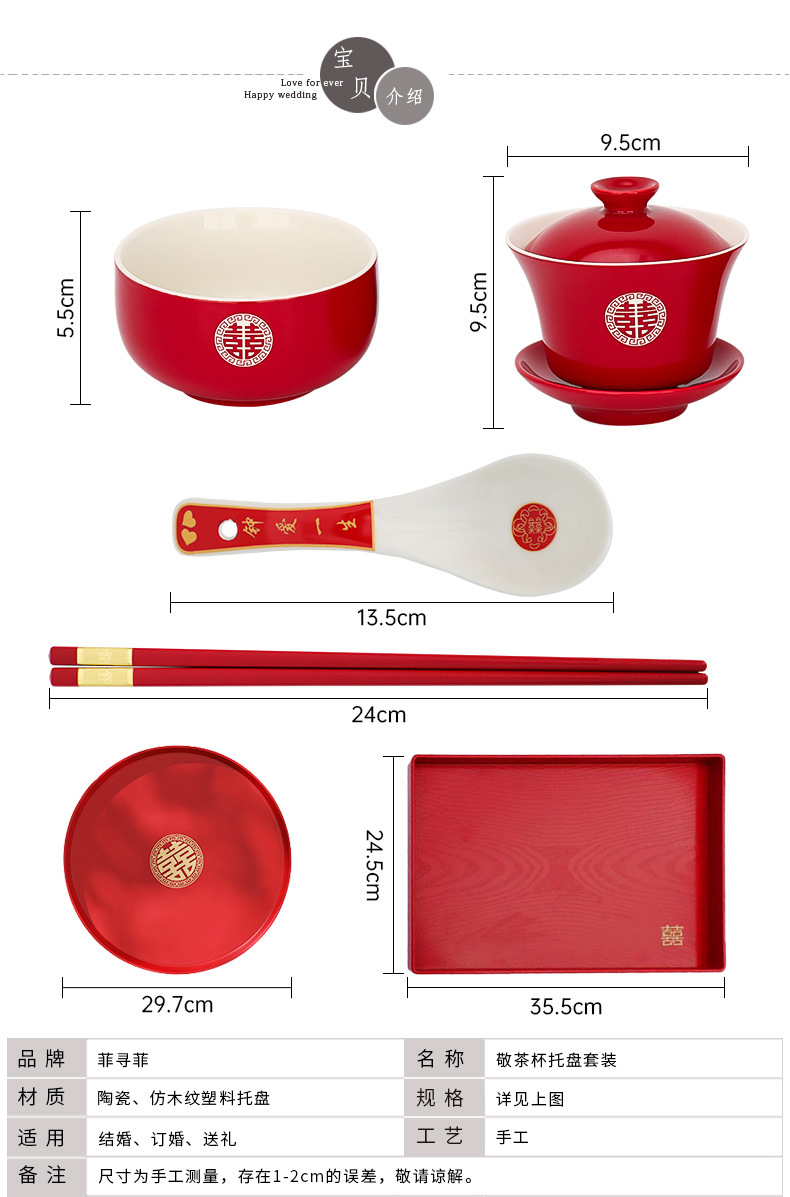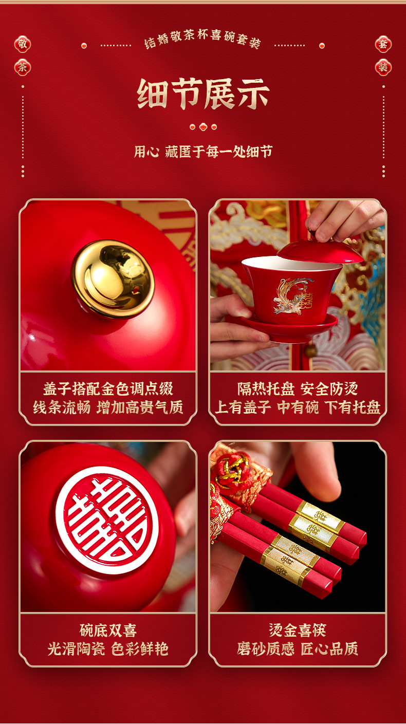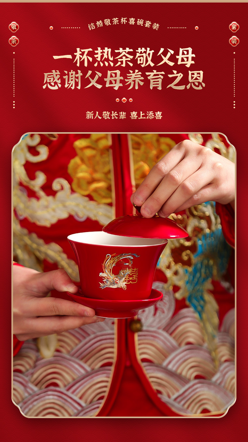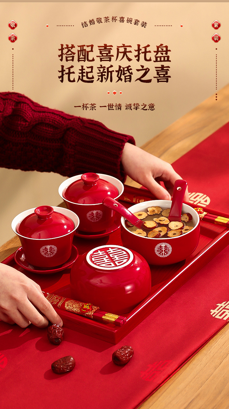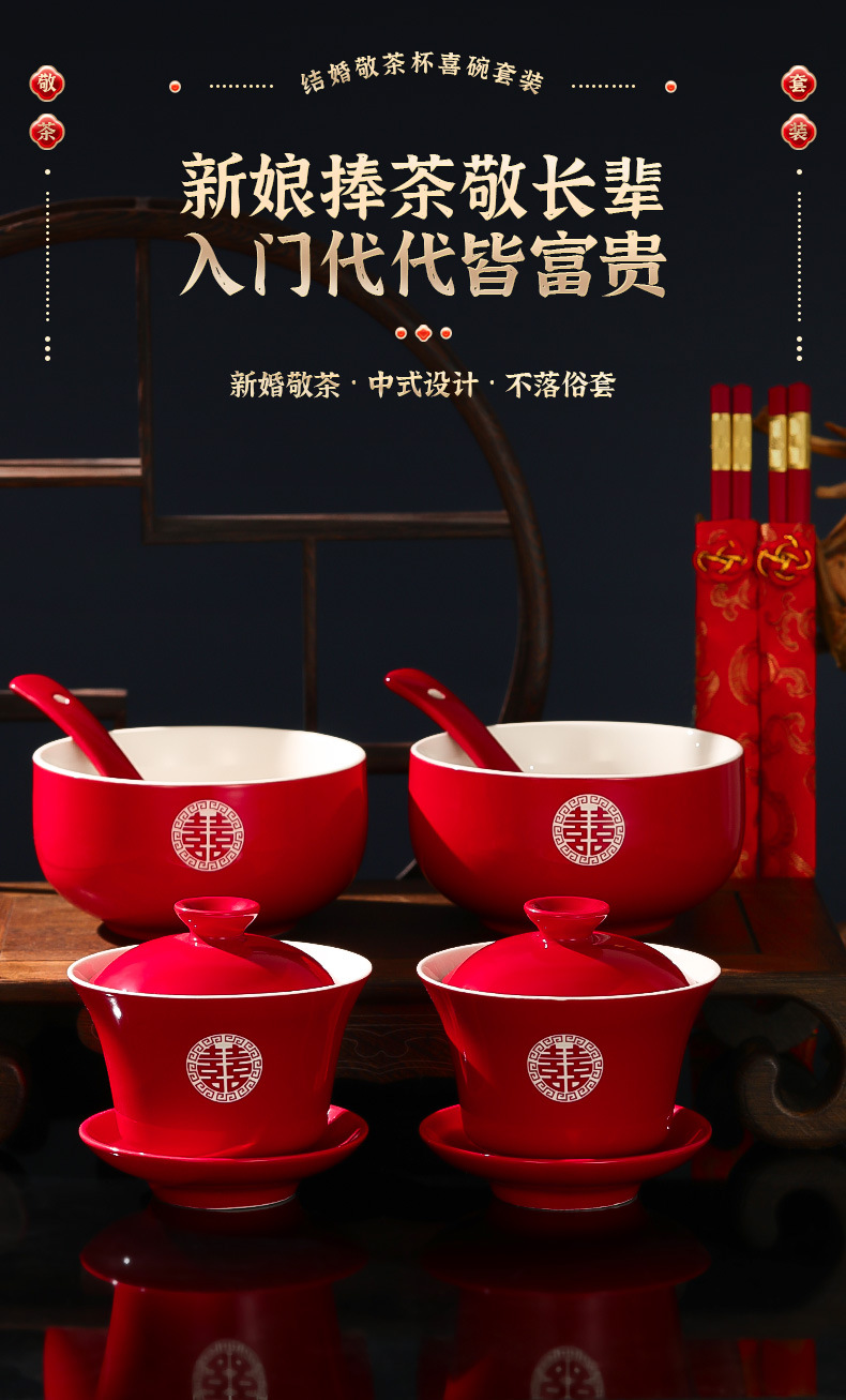 改口敬茶杯结婚套装一对盖碗筷红色喜庆喜碗陪嫁茶具婚礼敬酒杯子