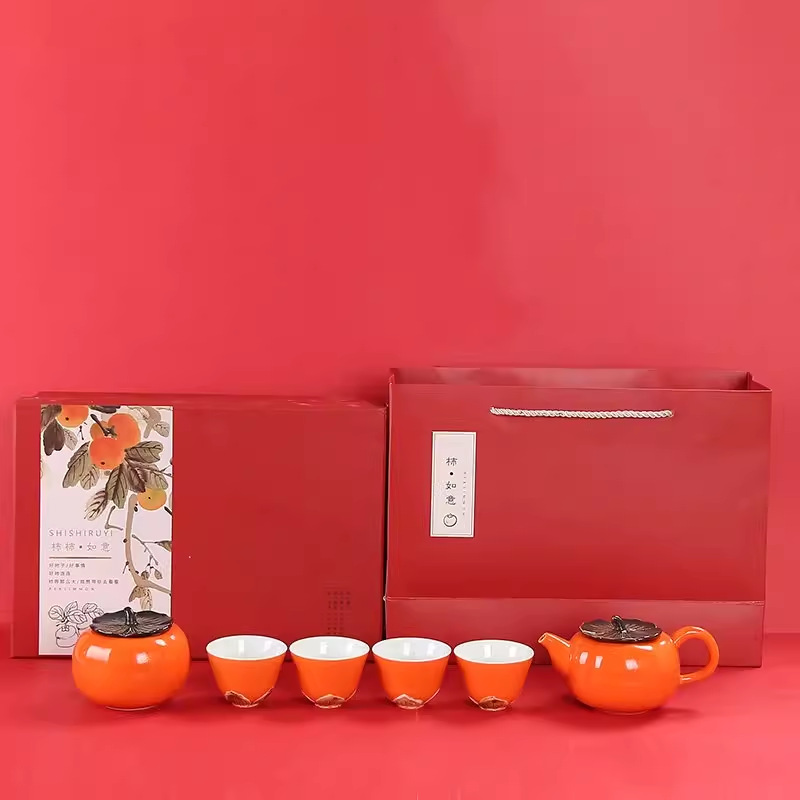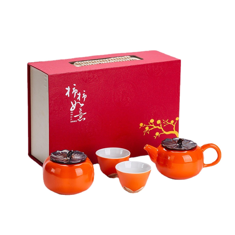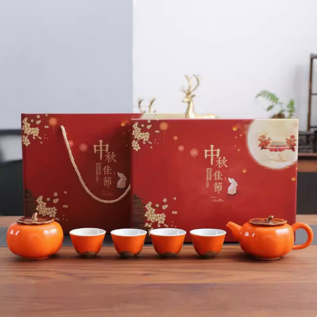 中秋节柿子茶具礼品套装礼盒装1壶4杯1罐功夫婚庆陶瓷中秋礼盒