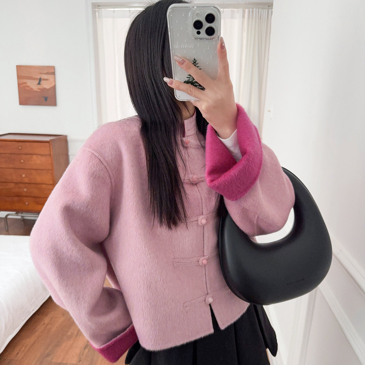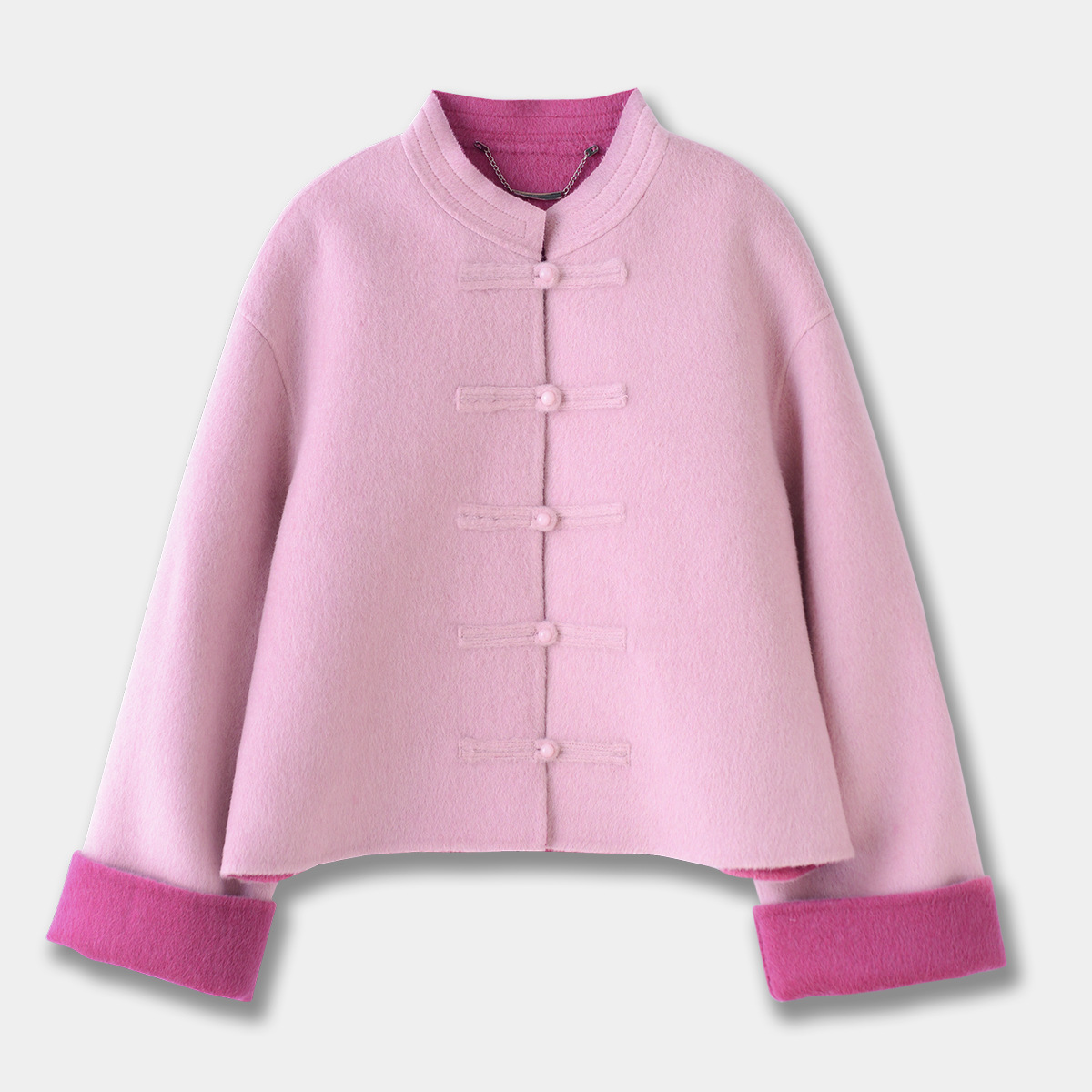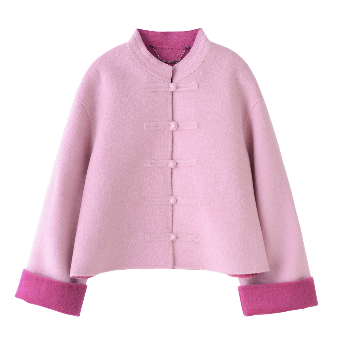 现货SW新中式双面呢外套女25春季国风盘扣粉色短呢子上衣S4WT010