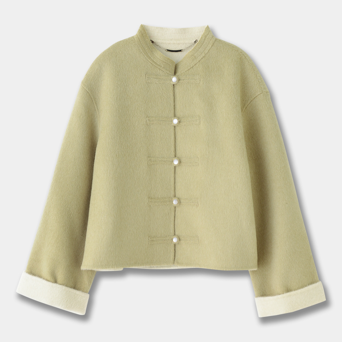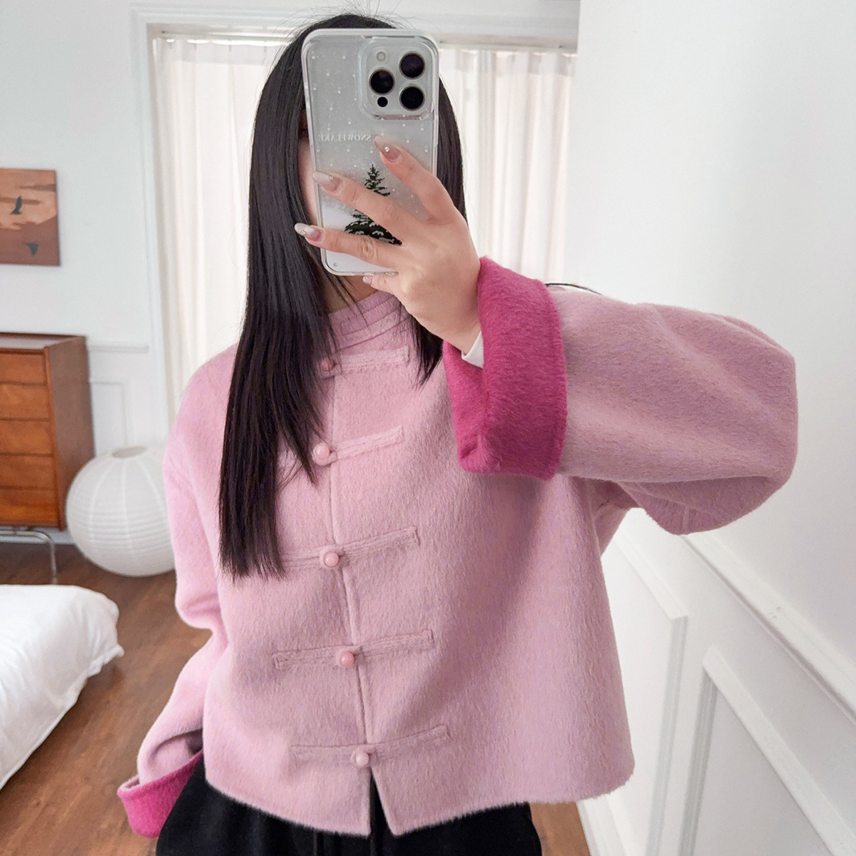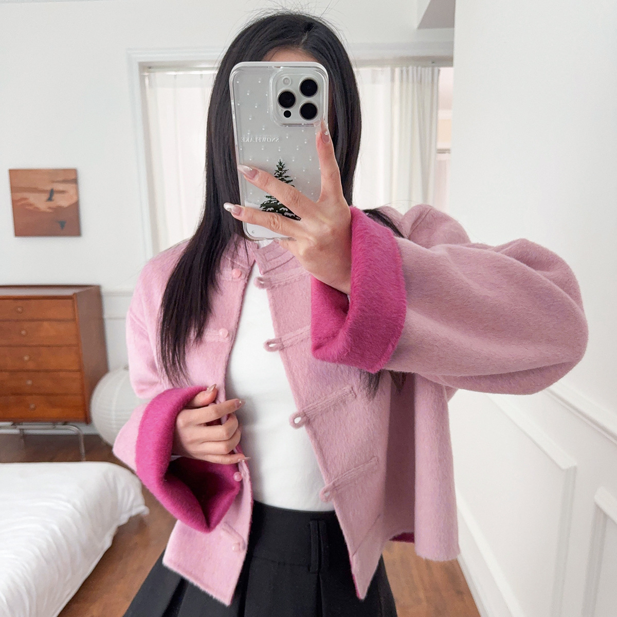 现货SW新中式双面呢外套女25春季国风盘扣粉色短呢子上衣S4WT010