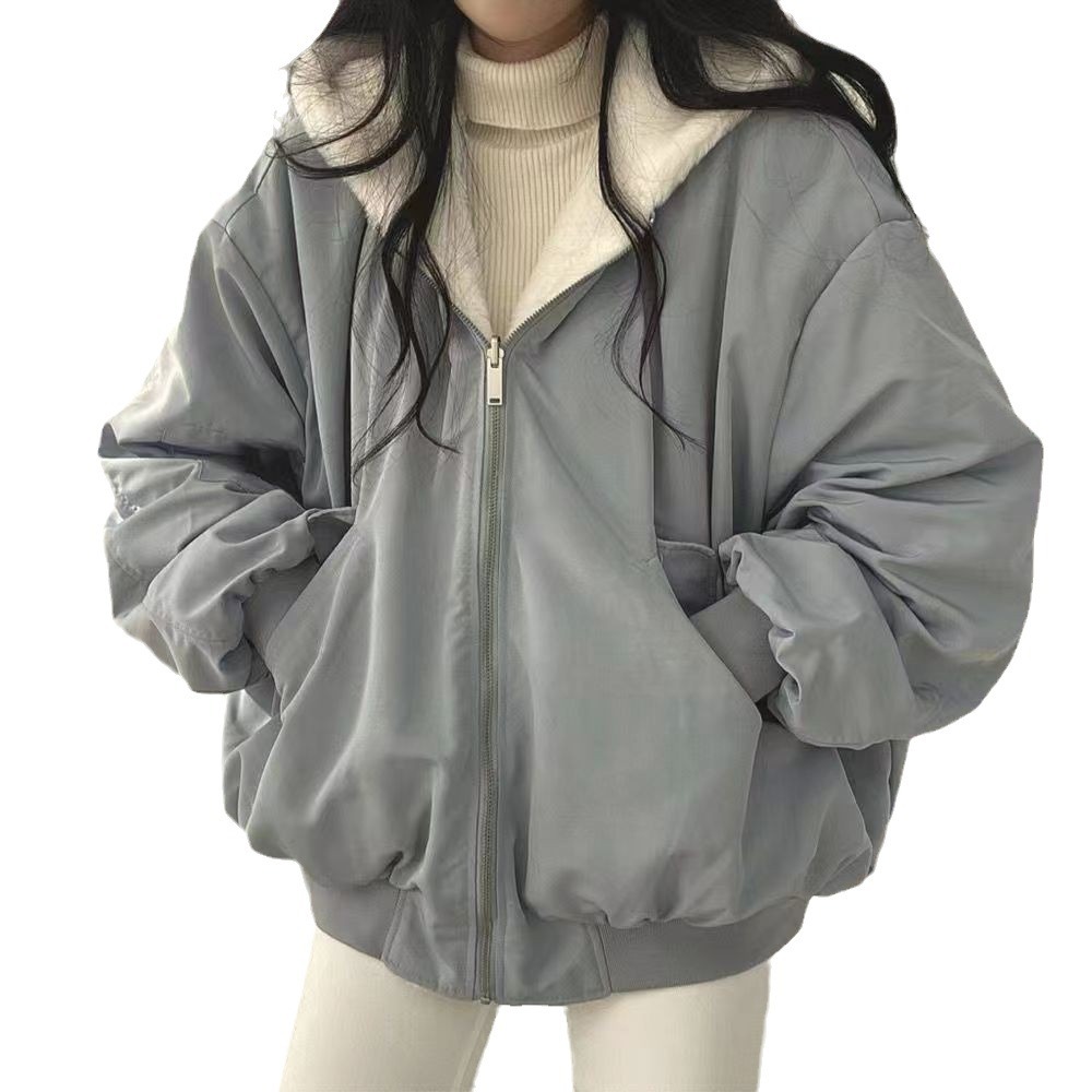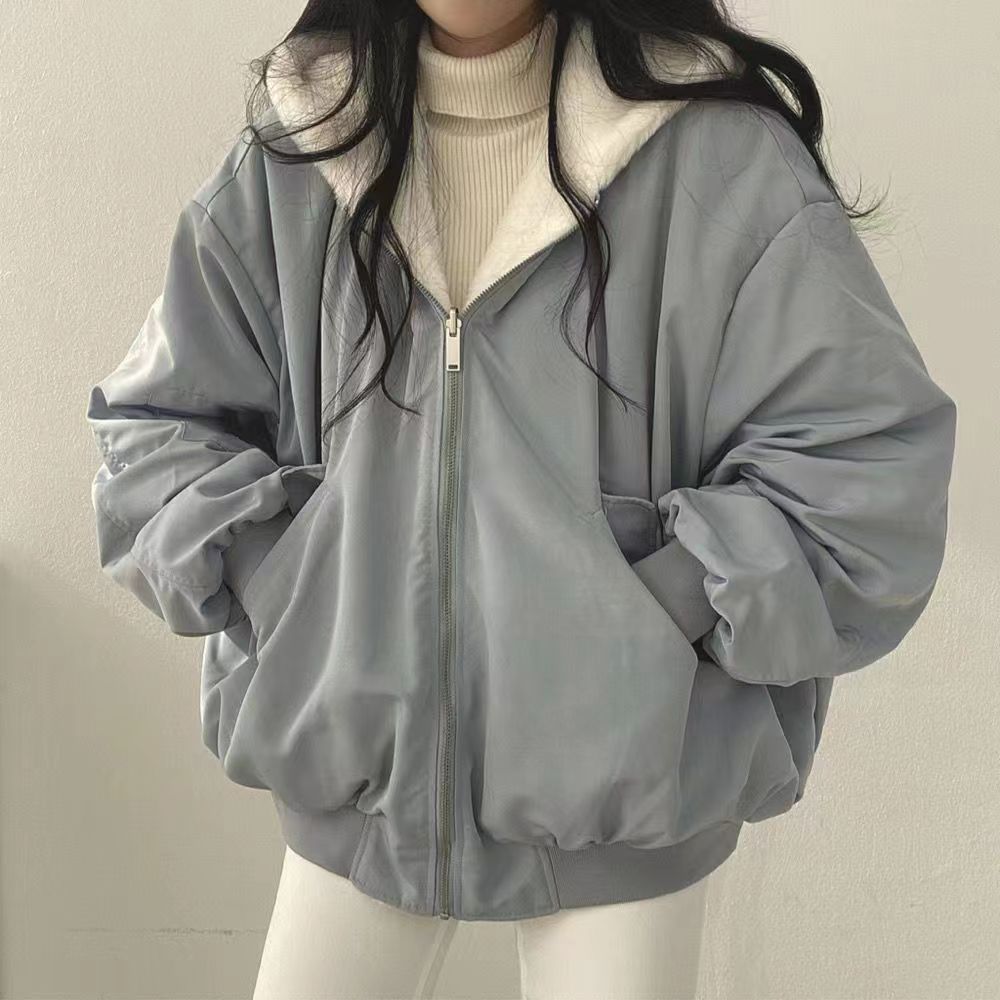 韩国chic休闲气质宽松加绒加厚两面穿羊羔毛棉服女外套秋冬季棉衣