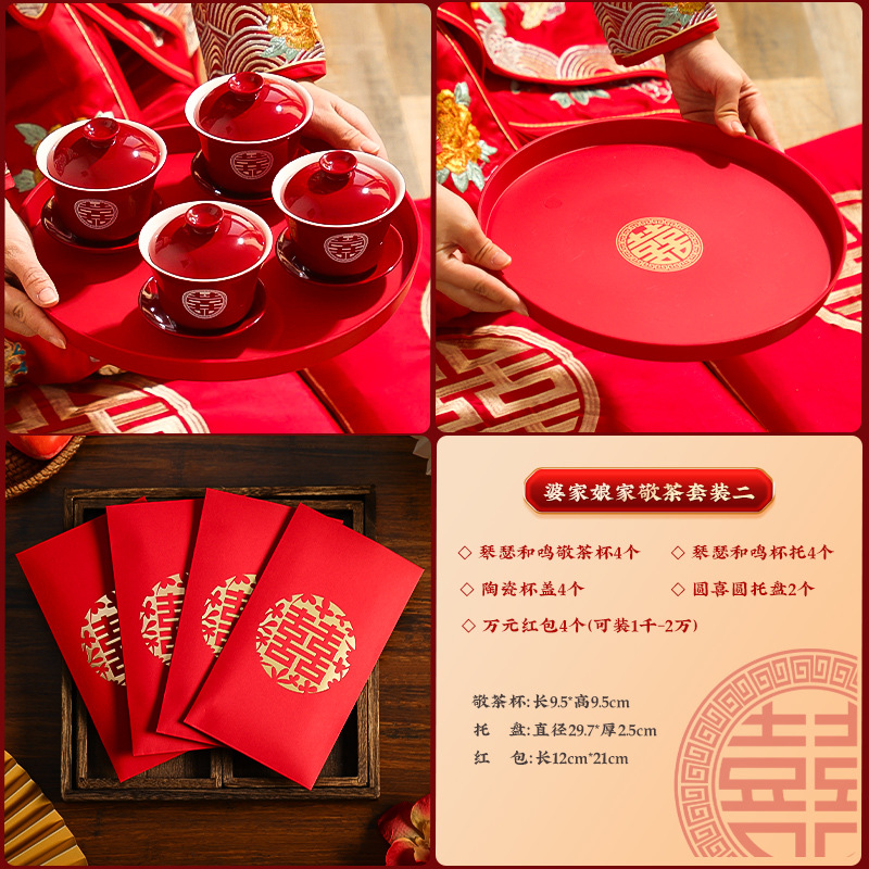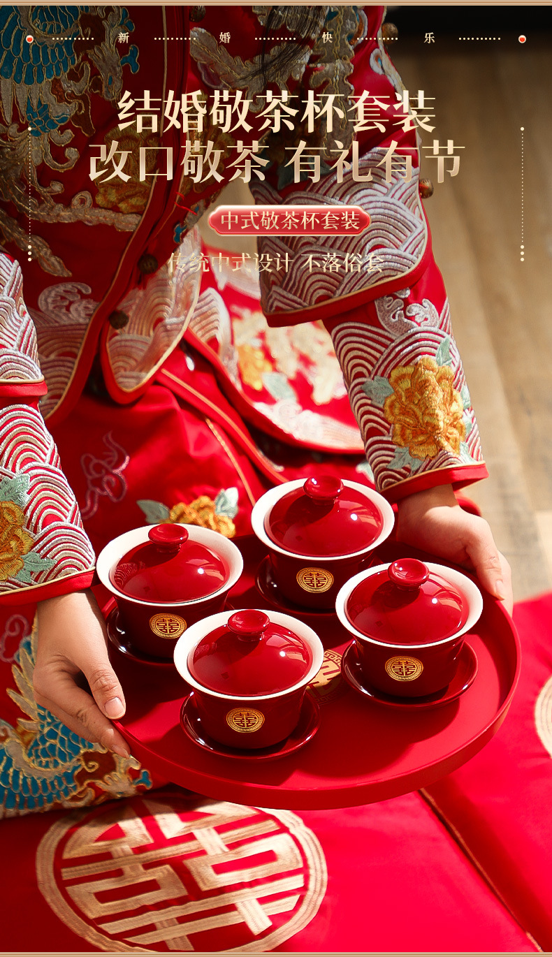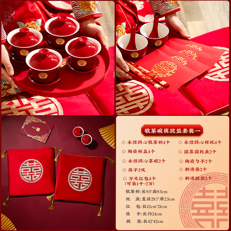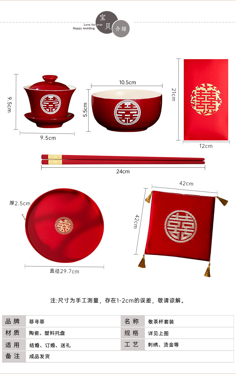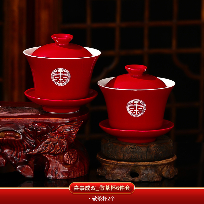 结婚敬茶杯喜碗女方陪嫁用品大全红色改口一对盖碗茶具对碗筷套装
