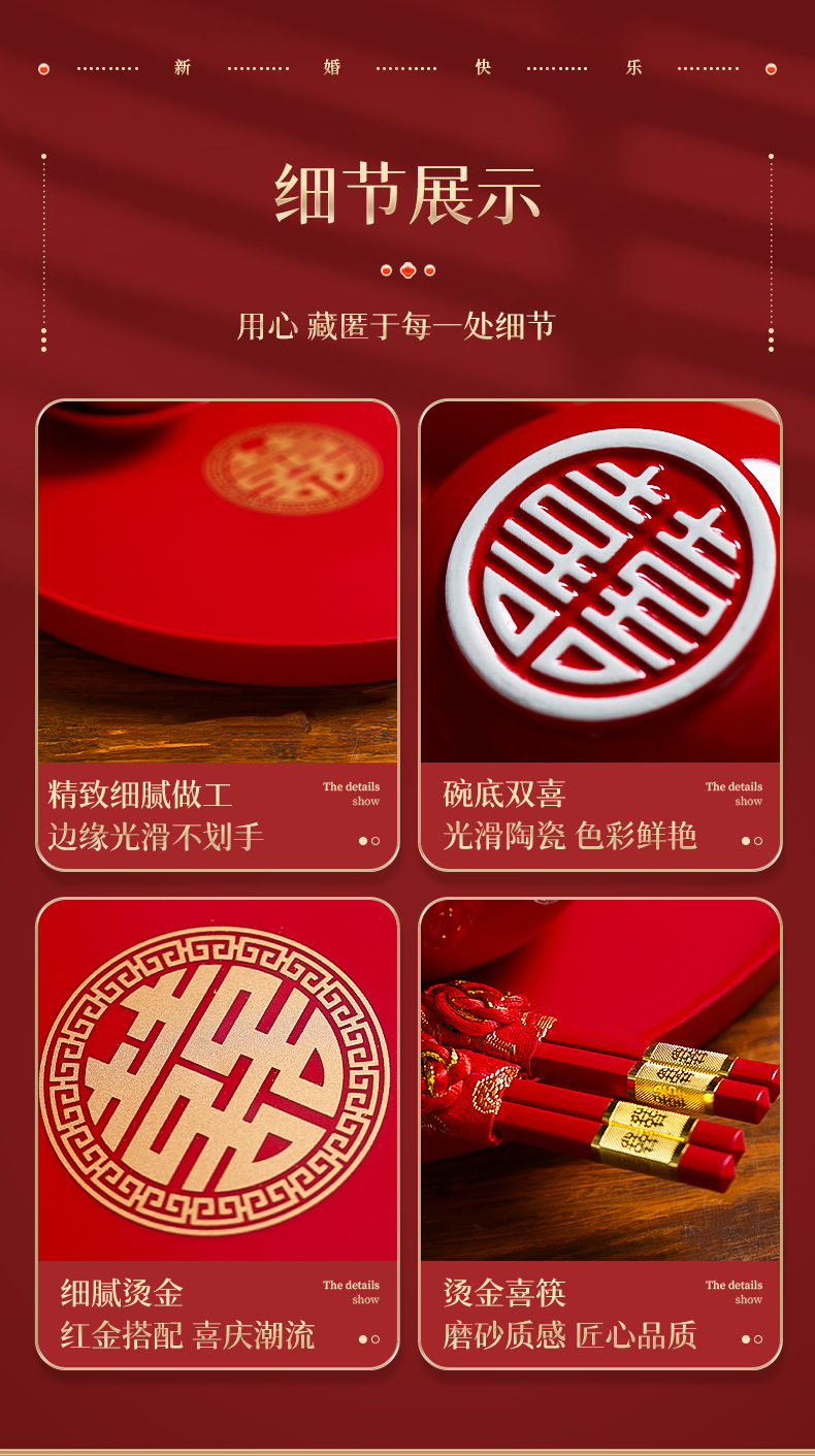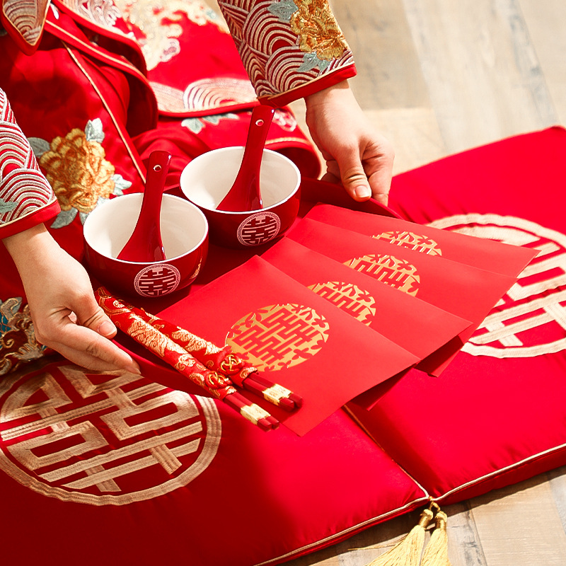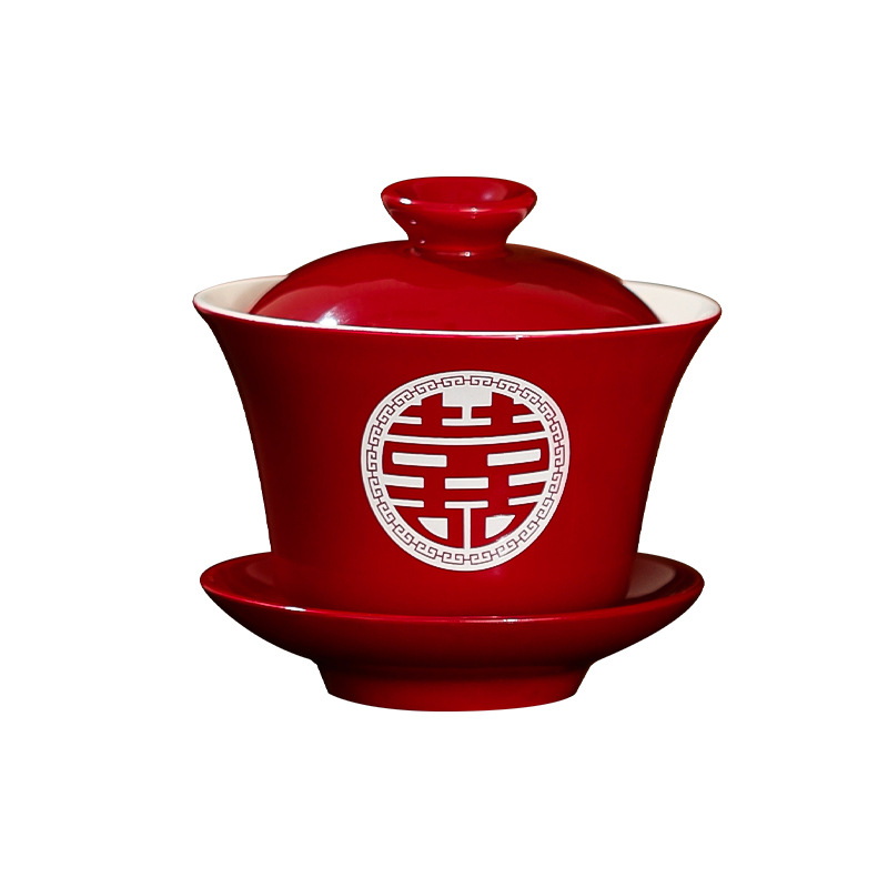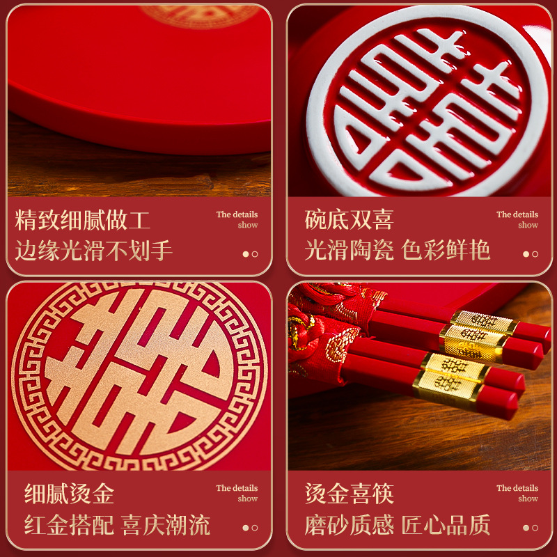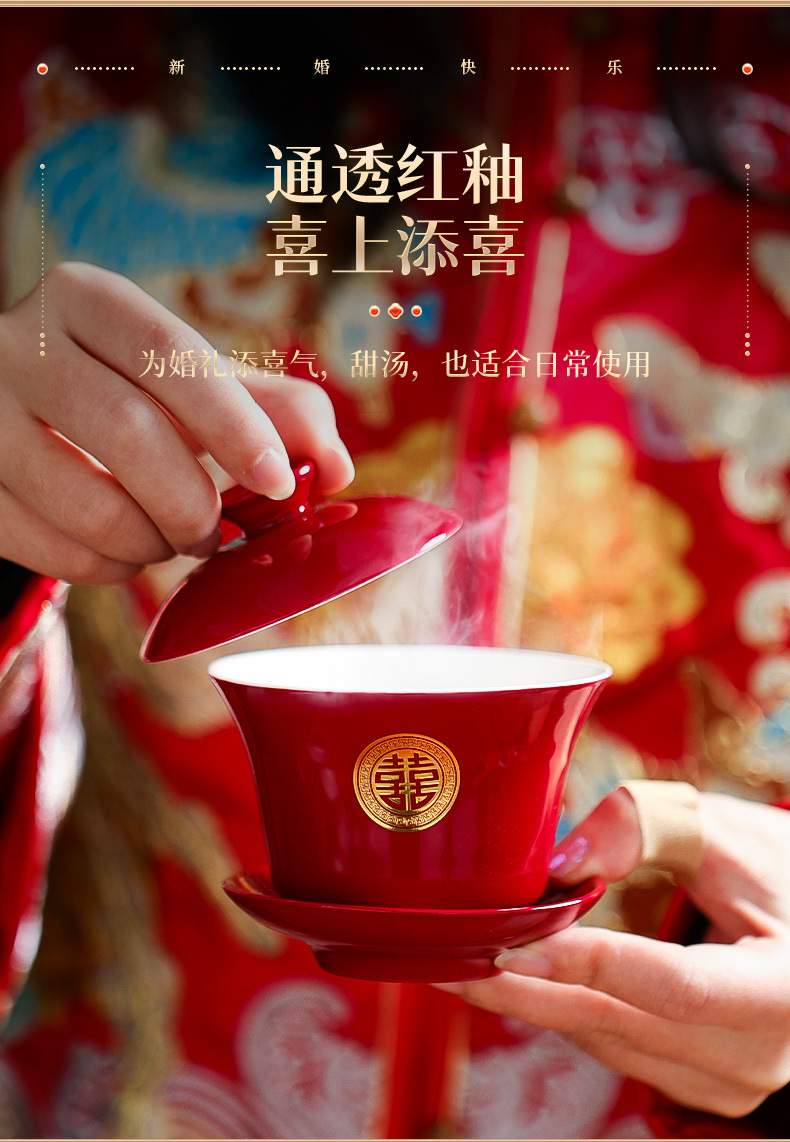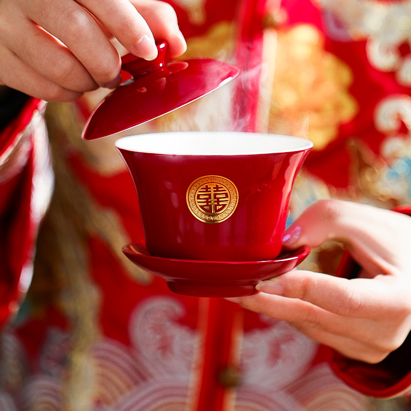结婚敬茶杯喜碗女方陪嫁用品大全红色改口一对盖碗茶具对碗筷套装