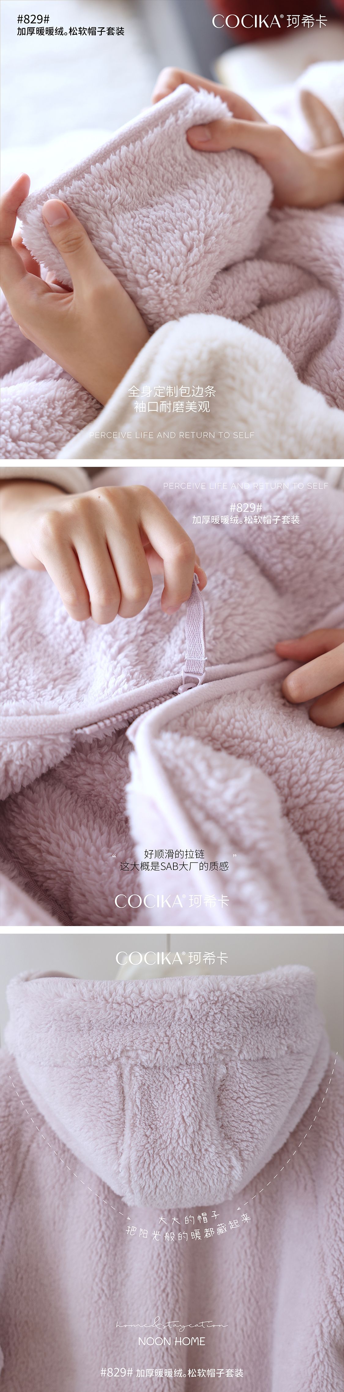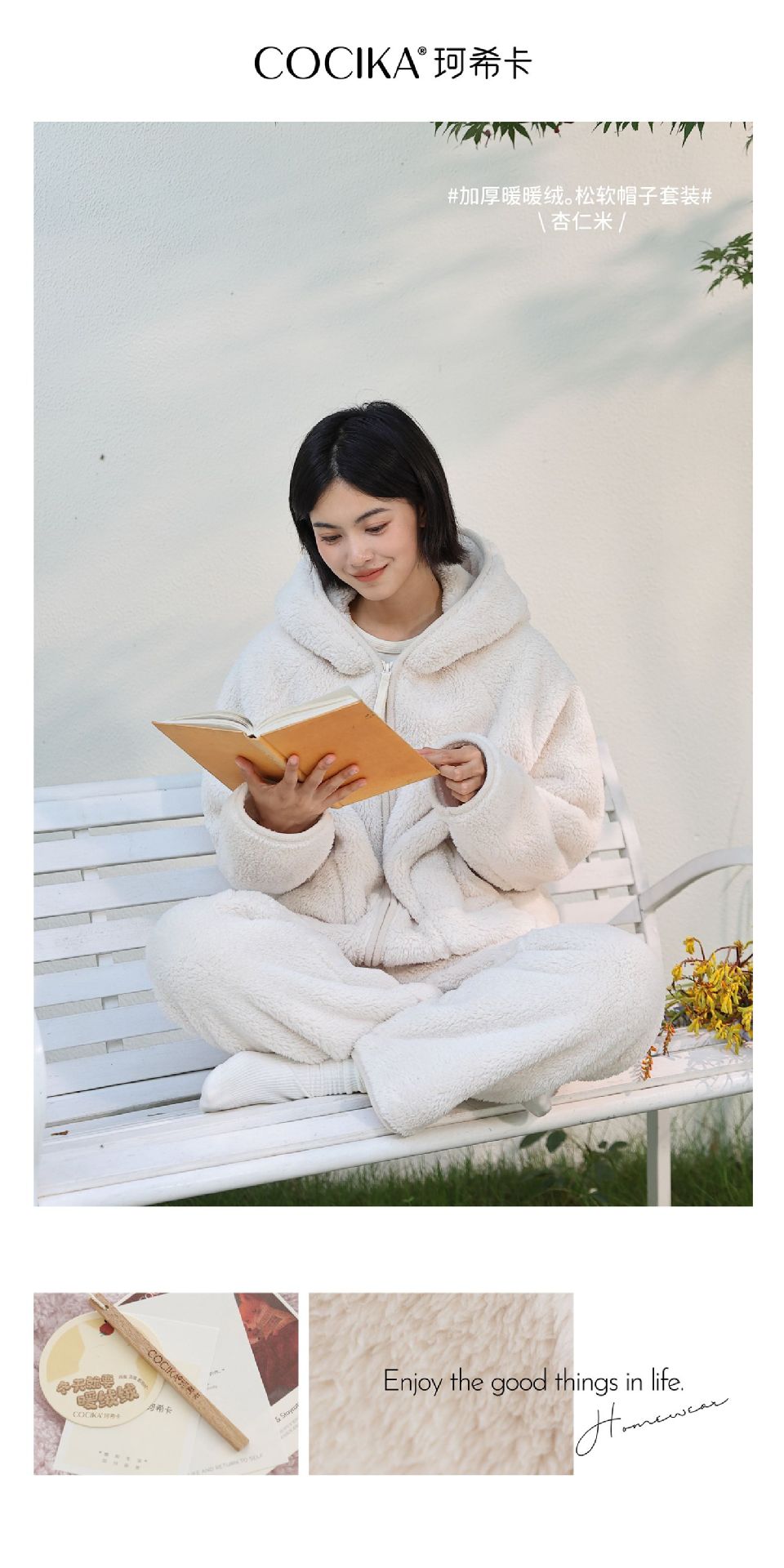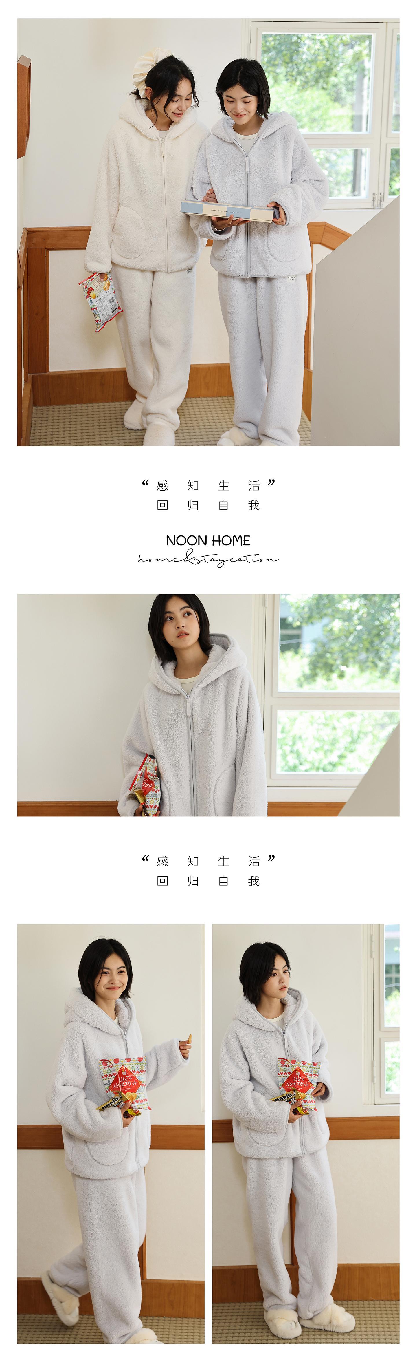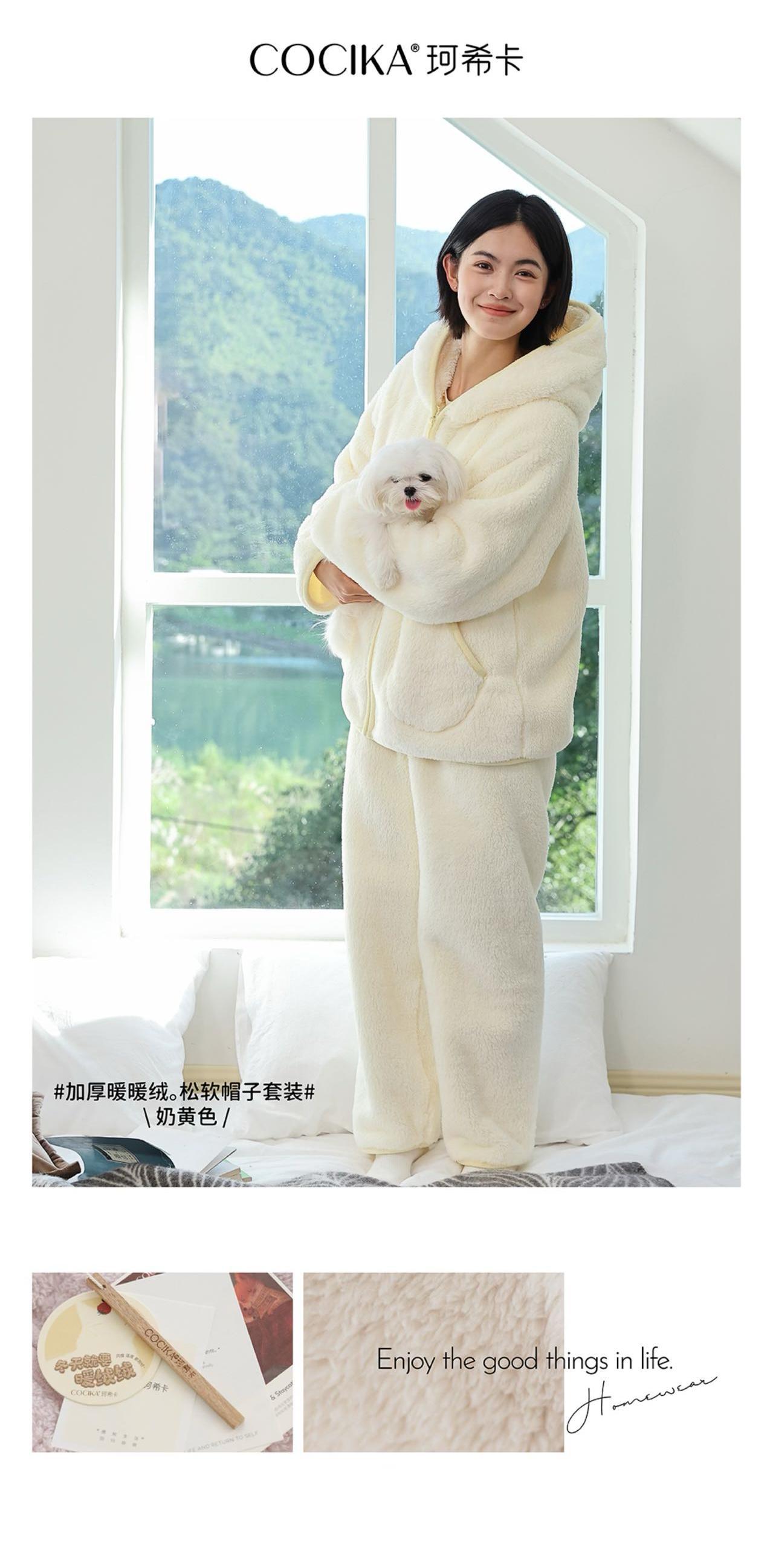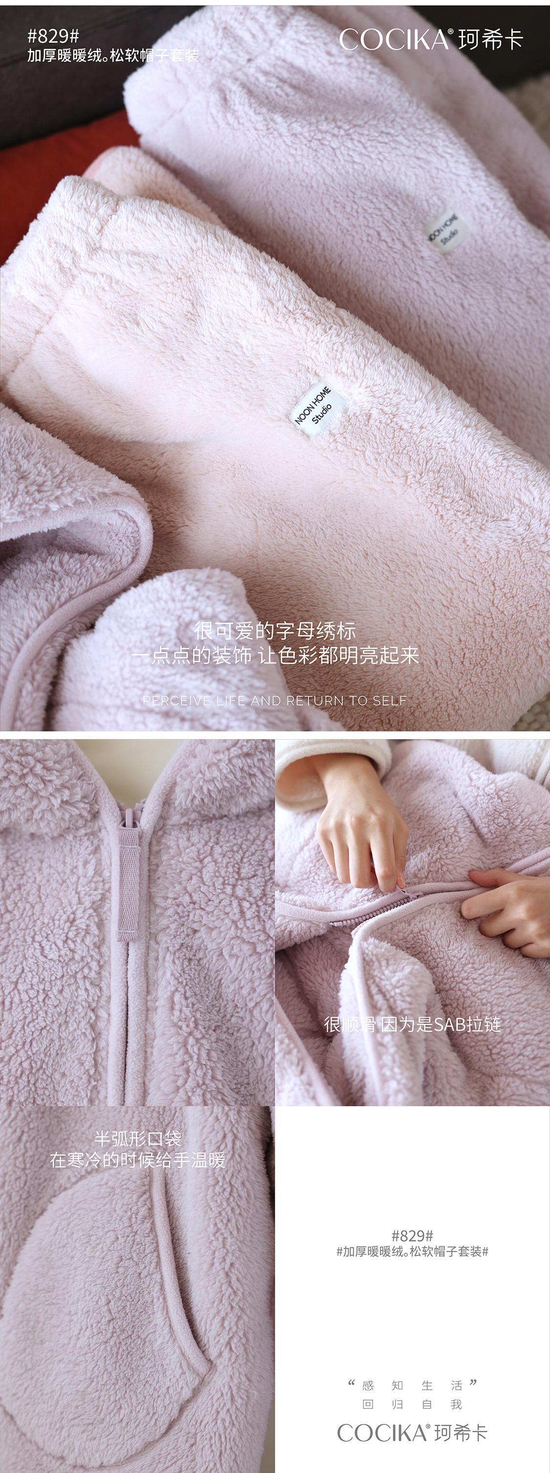 厚实连帽暖暖绒睡衣套装冬季保暖加绒加厚家居服口袋拉链可外穿女