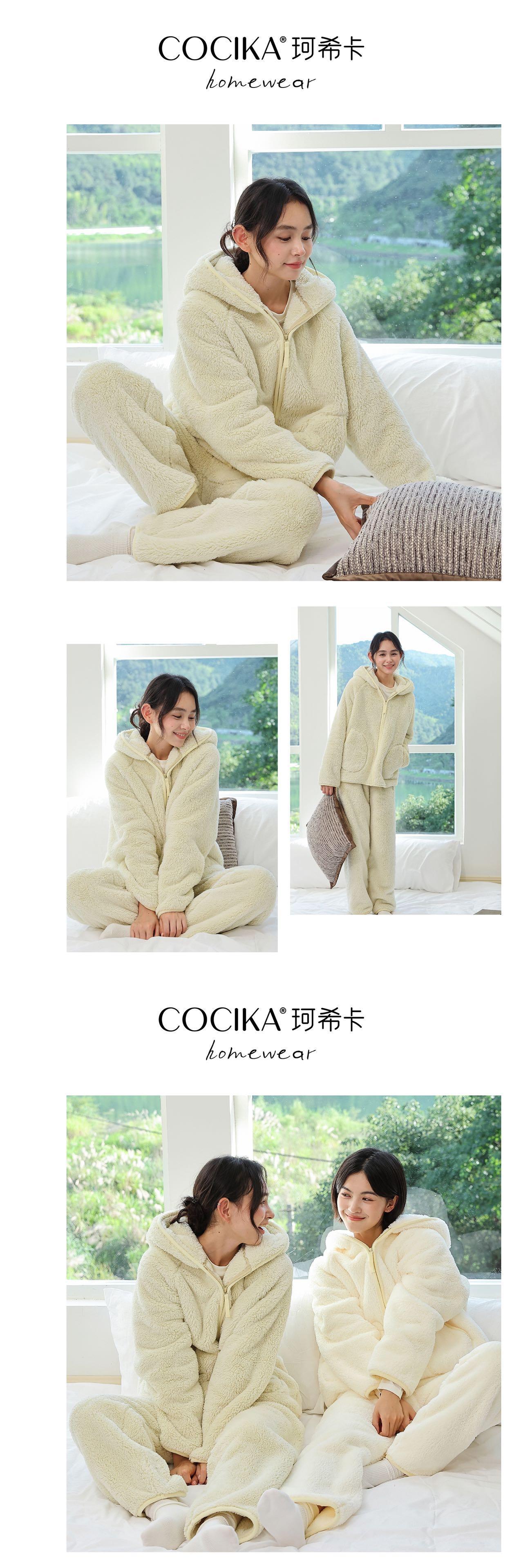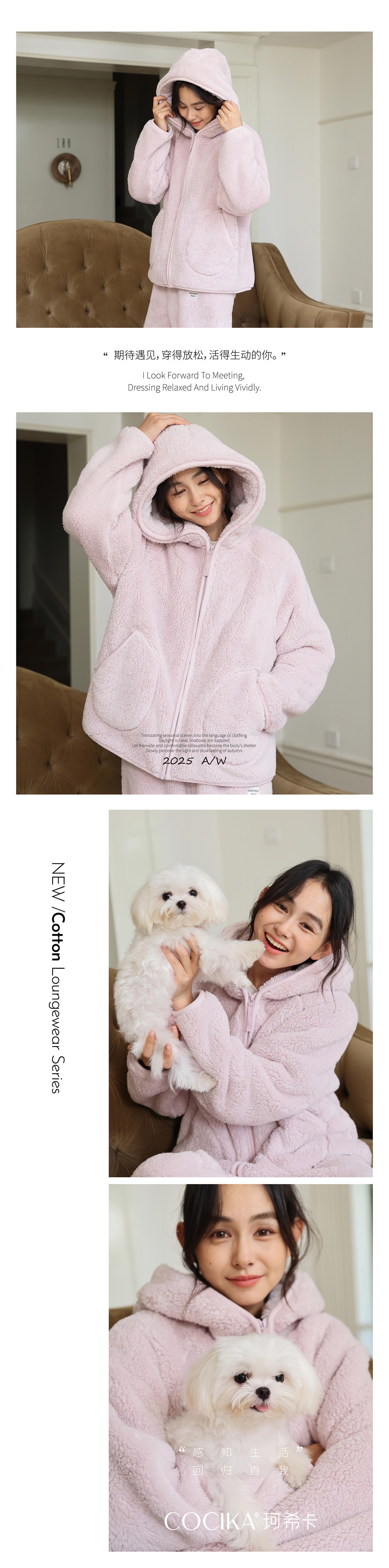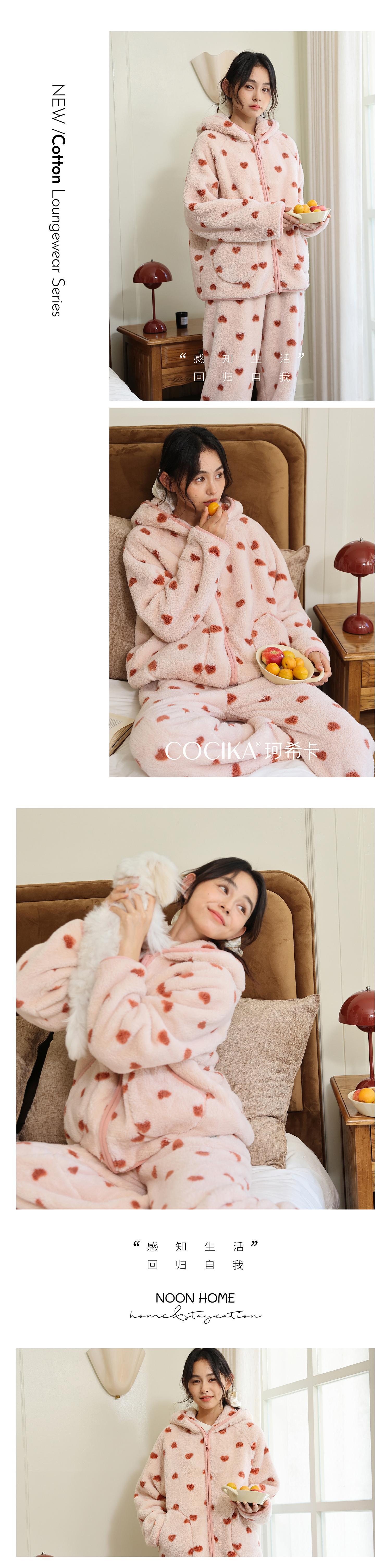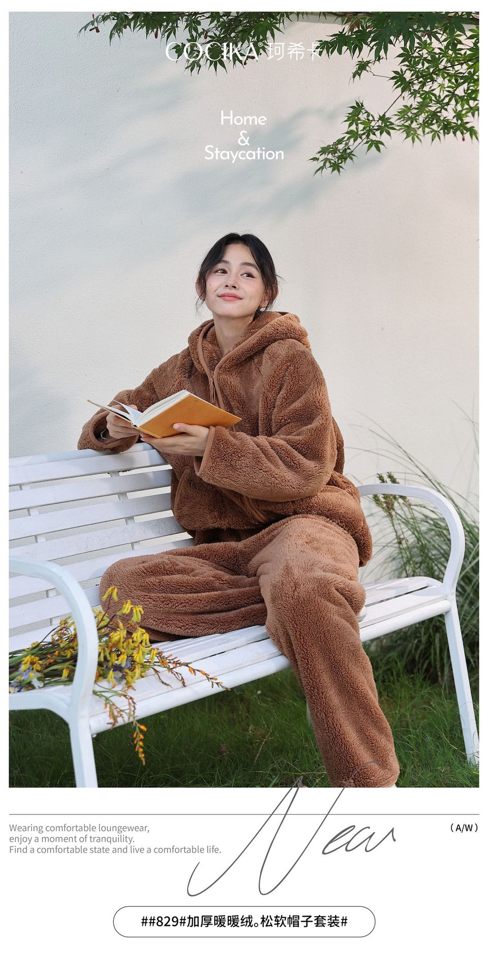 厚实连帽暖暖绒睡衣套装冬季保暖加绒加厚家居服口袋拉链可外穿女