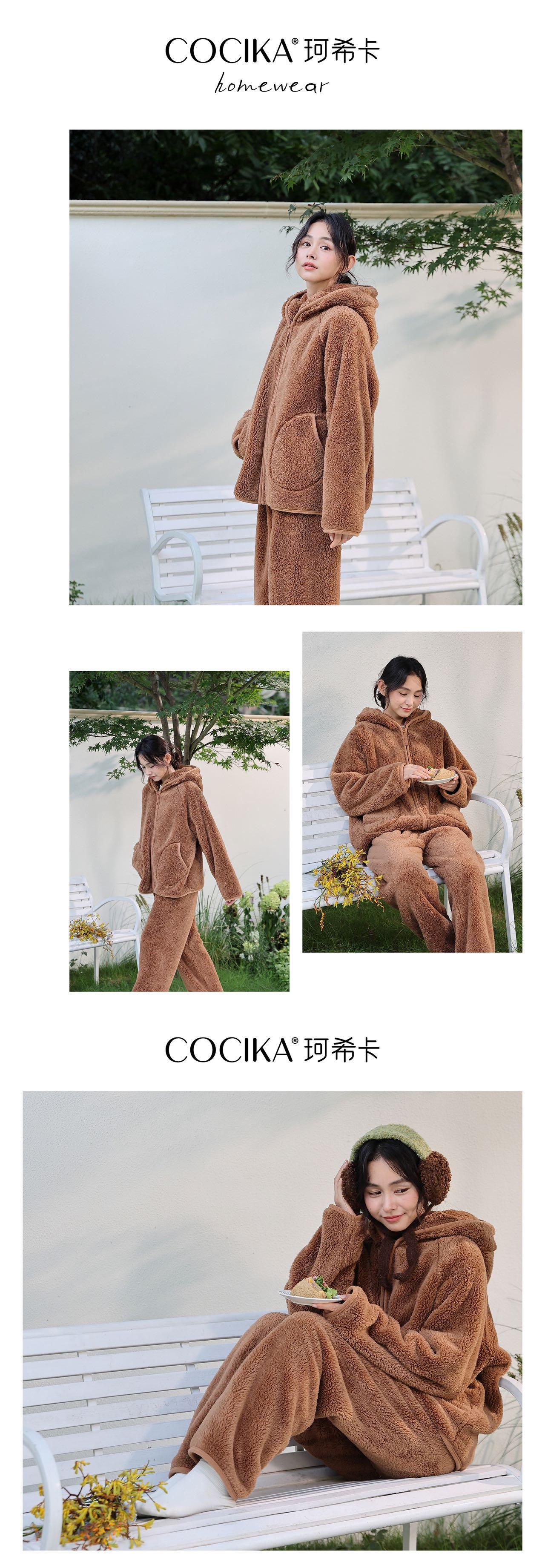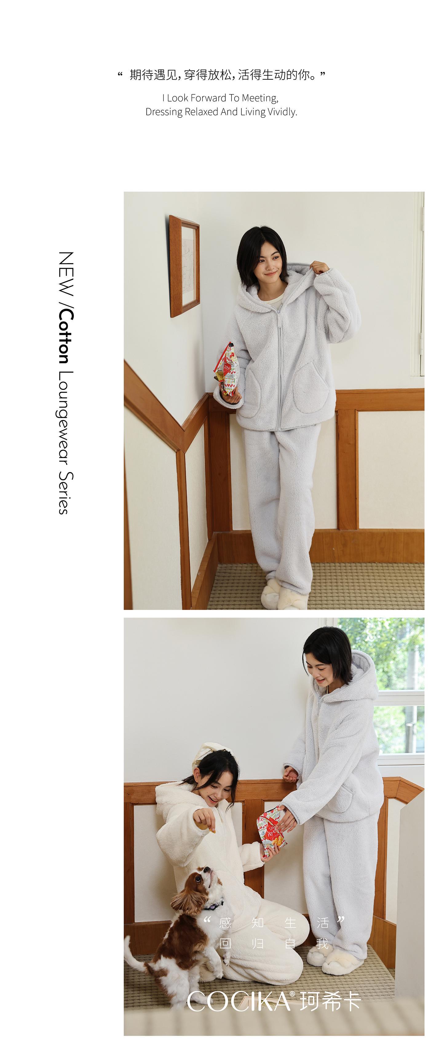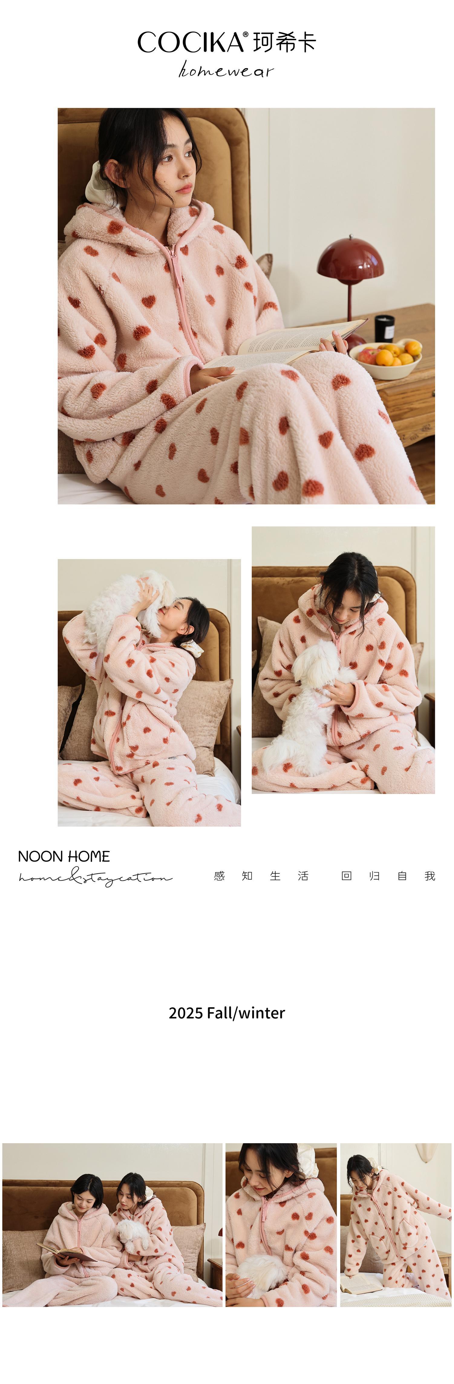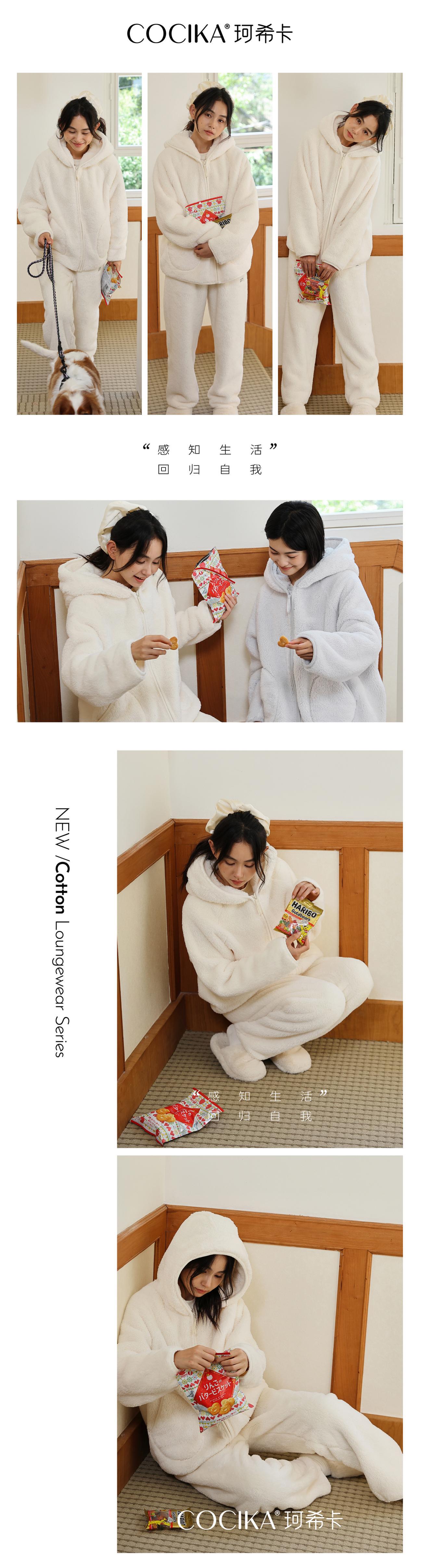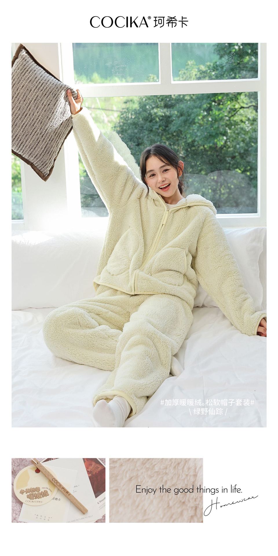 厚实连帽暖暖绒睡衣套装冬季保暖加绒加厚家居服口袋拉链可外穿女